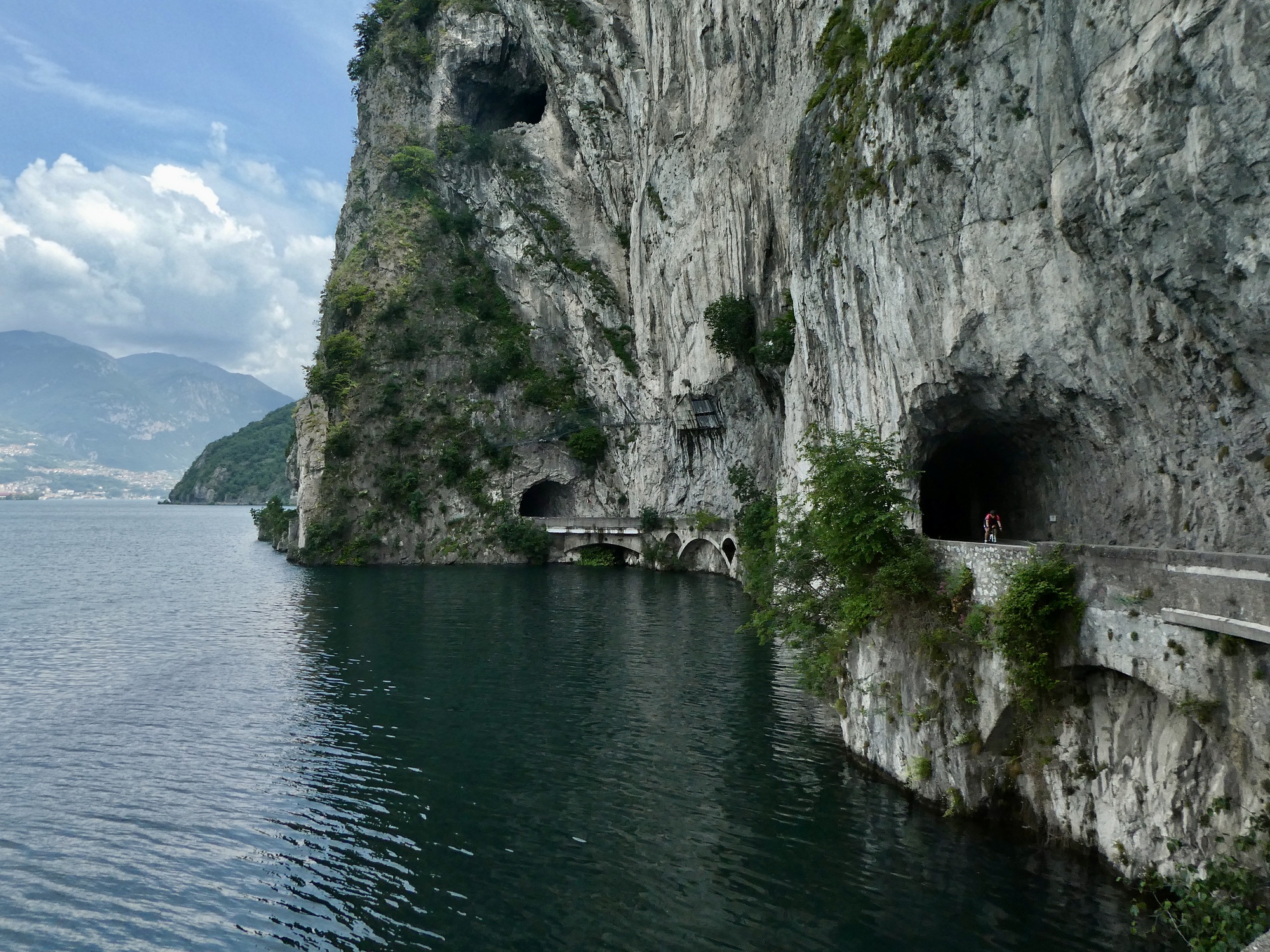 Instead, I decide on an out and back up the east side of the lake, where the hills are further back from the water and for much of the way there is a separate bike lane or path. Part of the way on this side it’s pretty busy too, and navigation is a little confusing through a few of the lakeside communities. Toward the north end though it’s brilliant: for about four miles the old coast road is closed to cars, which now take a higher road that tunnels through the mountain here. Bikes though are right next to the water on a gorgeous road that tunnels through or undercuts the sheer cliffs that rise straight up from the lake.
