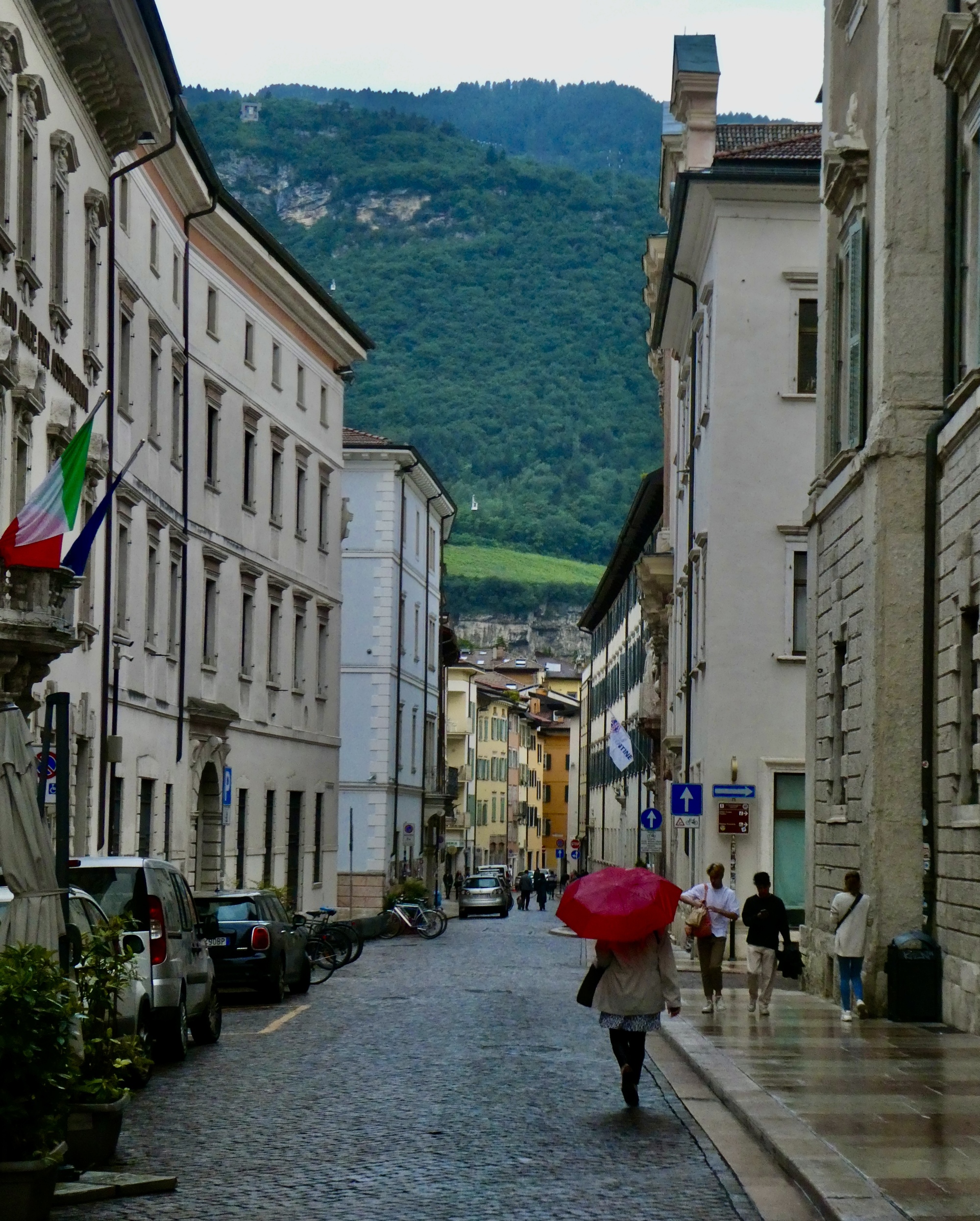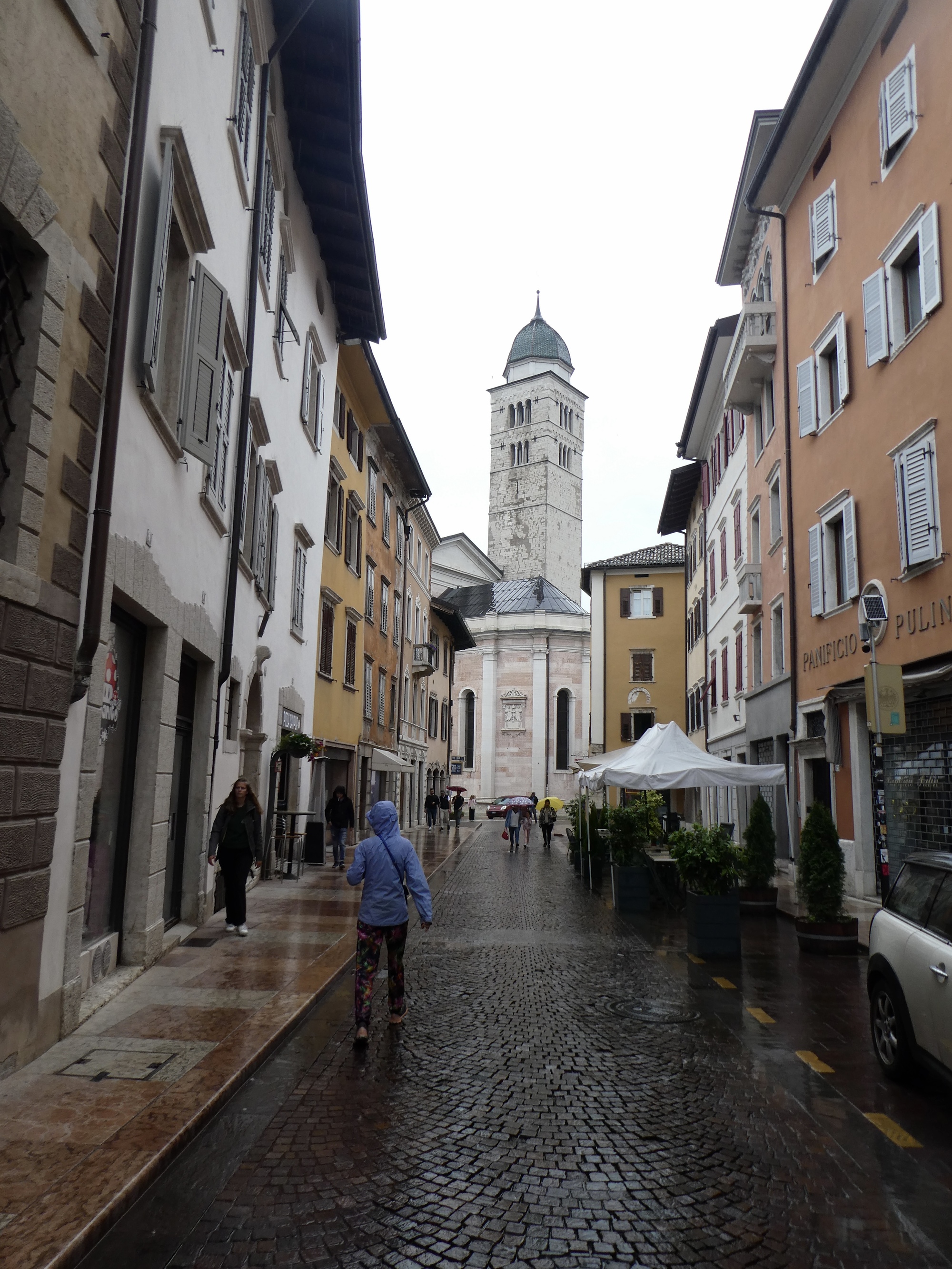 After several days of threatened rain that dissipated overnight, one finally caught up with us. It’s raining when we wake up, the look is grey and dreary outside, and the forecasters tell us it’s due to remain that way throughout the day. It doesn’t take us long to agree to scrap the 30 mile ride to Trento and be glad we’re in a place just a mile from a train station. I consult the train schedule, see that a regional that takes bikes comes through hourly throughout the heart of the day, and will set us back four euros each. Not a difficult decision to come to.