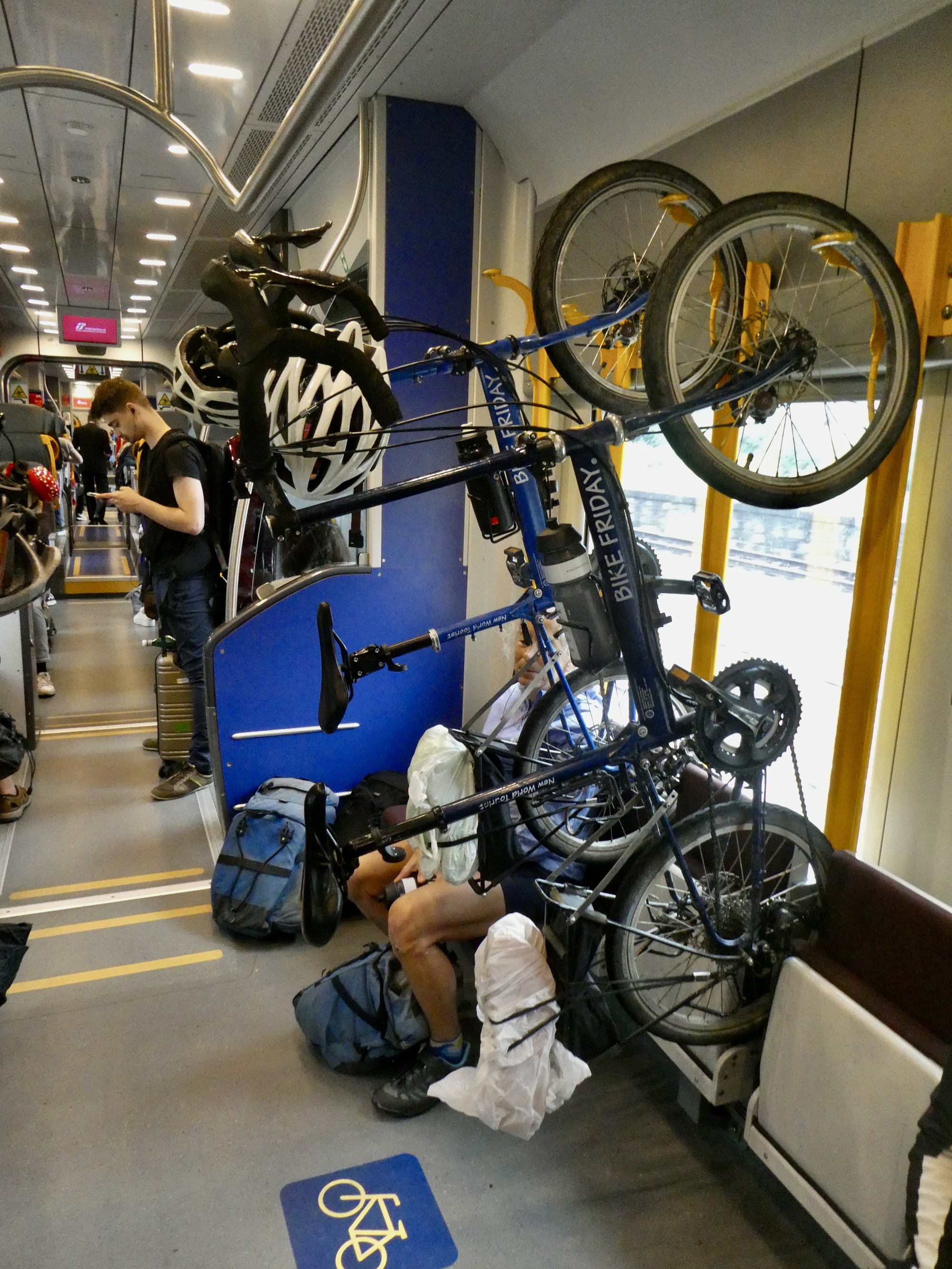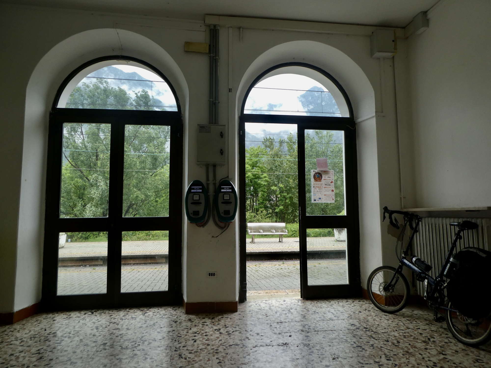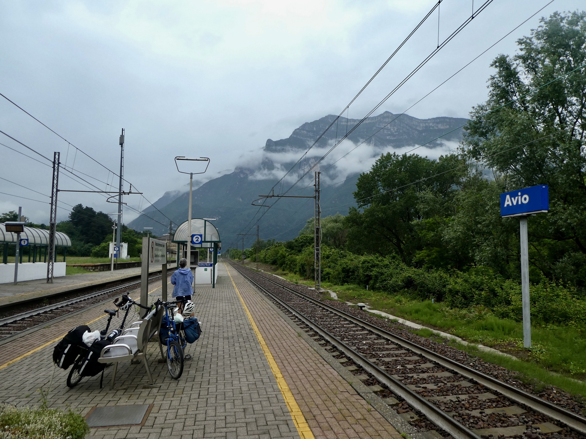 The ride is reasonably uneventful. We’ve arrived in plenty of time, and so after purchasing our tickets through the TrenItalia app we sit in the small and otherwise empty Avio station until it’s time to unload the bags and shuttle bikes and baggage down the stairs to the underpass and then back up to track two. And then wait some more on the uncovered platform, happy it isn’t raining for the moment, until our train rushes in a few minutes late and in a hurry.