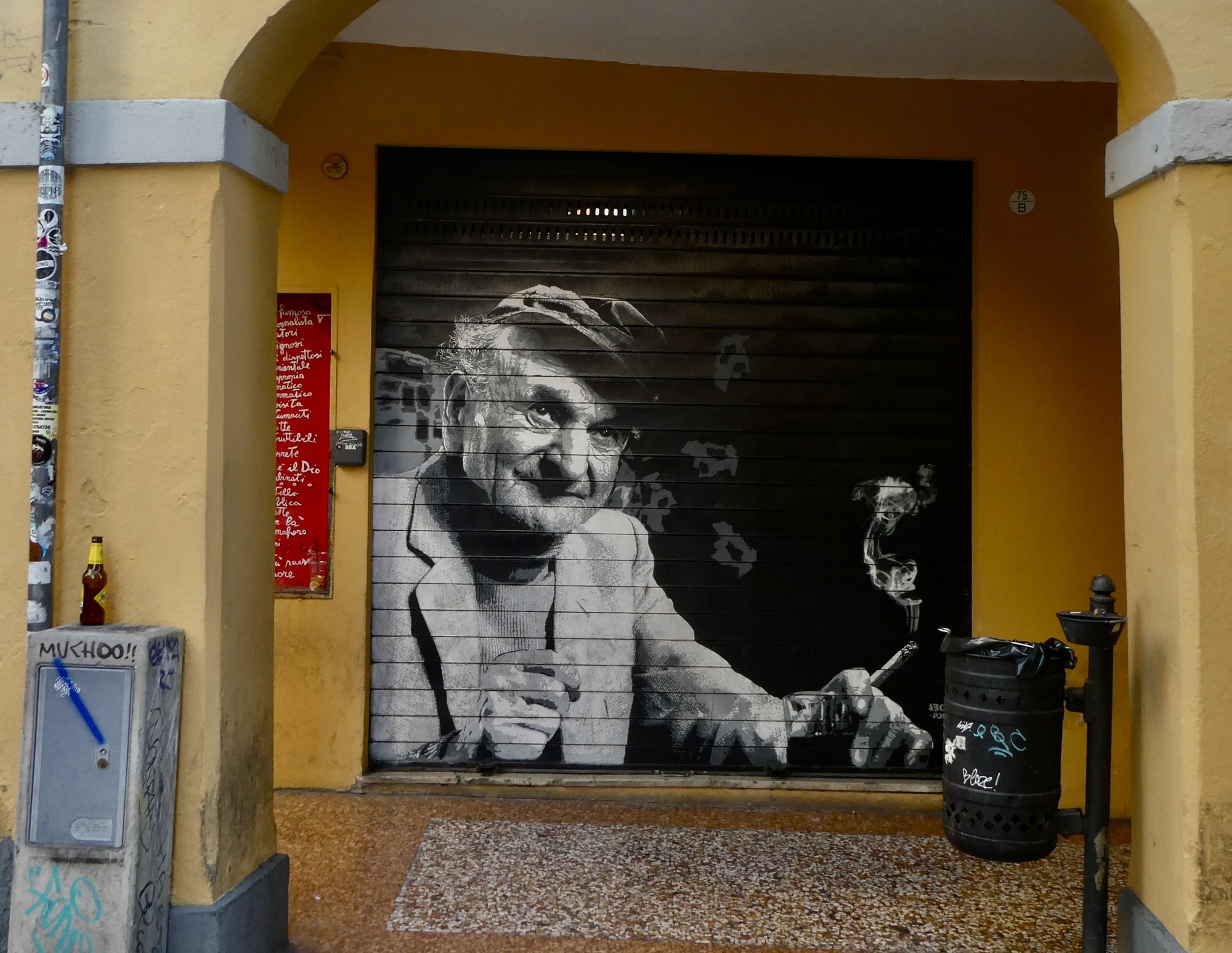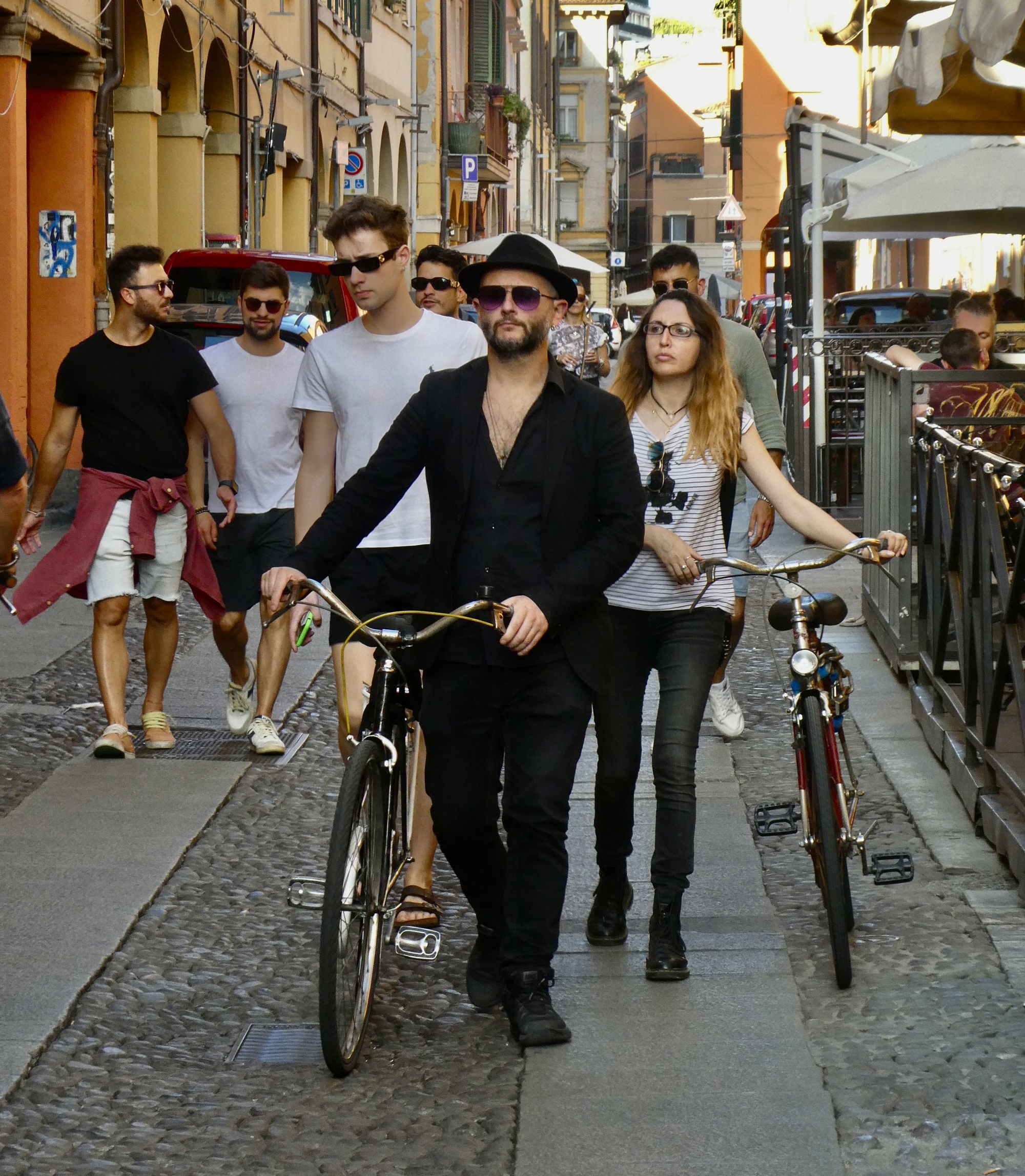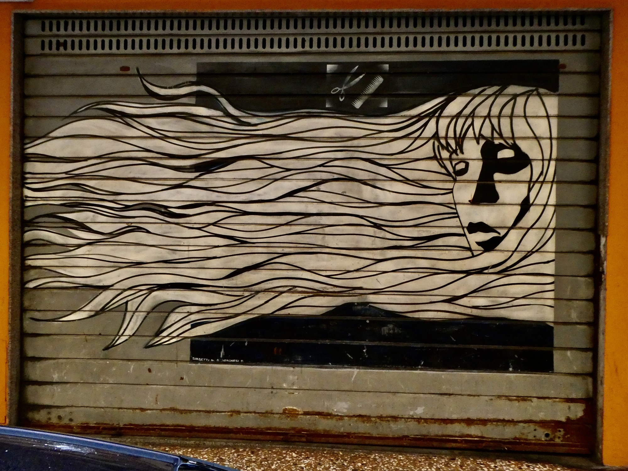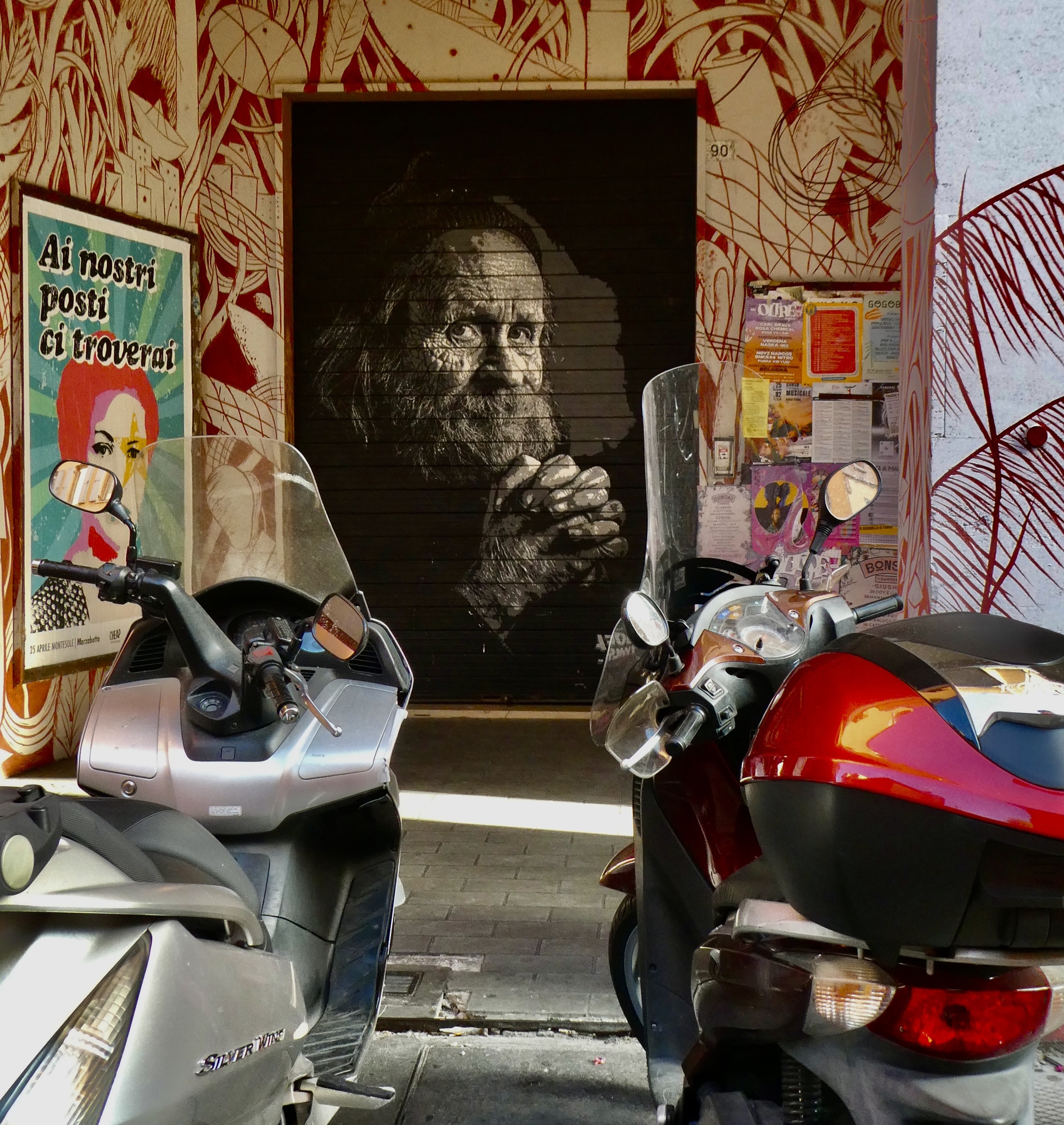 We walk the length of the street, stopping for one mural after another and looking for a candidate restaurant for tomorrow’s main meal before doubling back to Osteria Alla Due Porte to claim our outside table where we enjoy our meal and the adjacent parade.