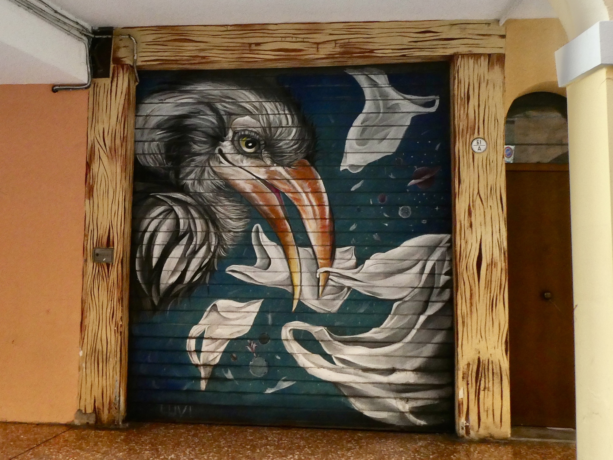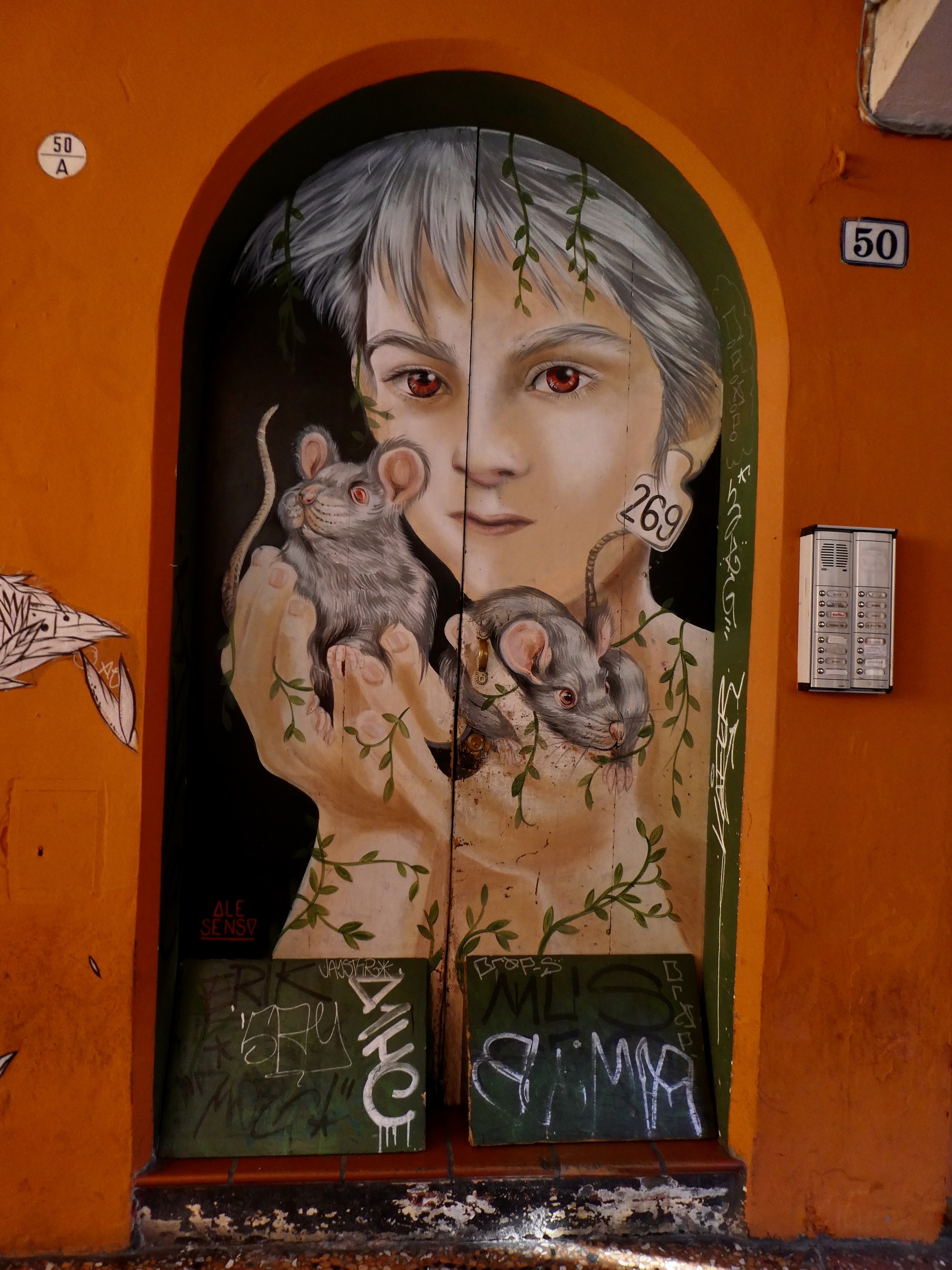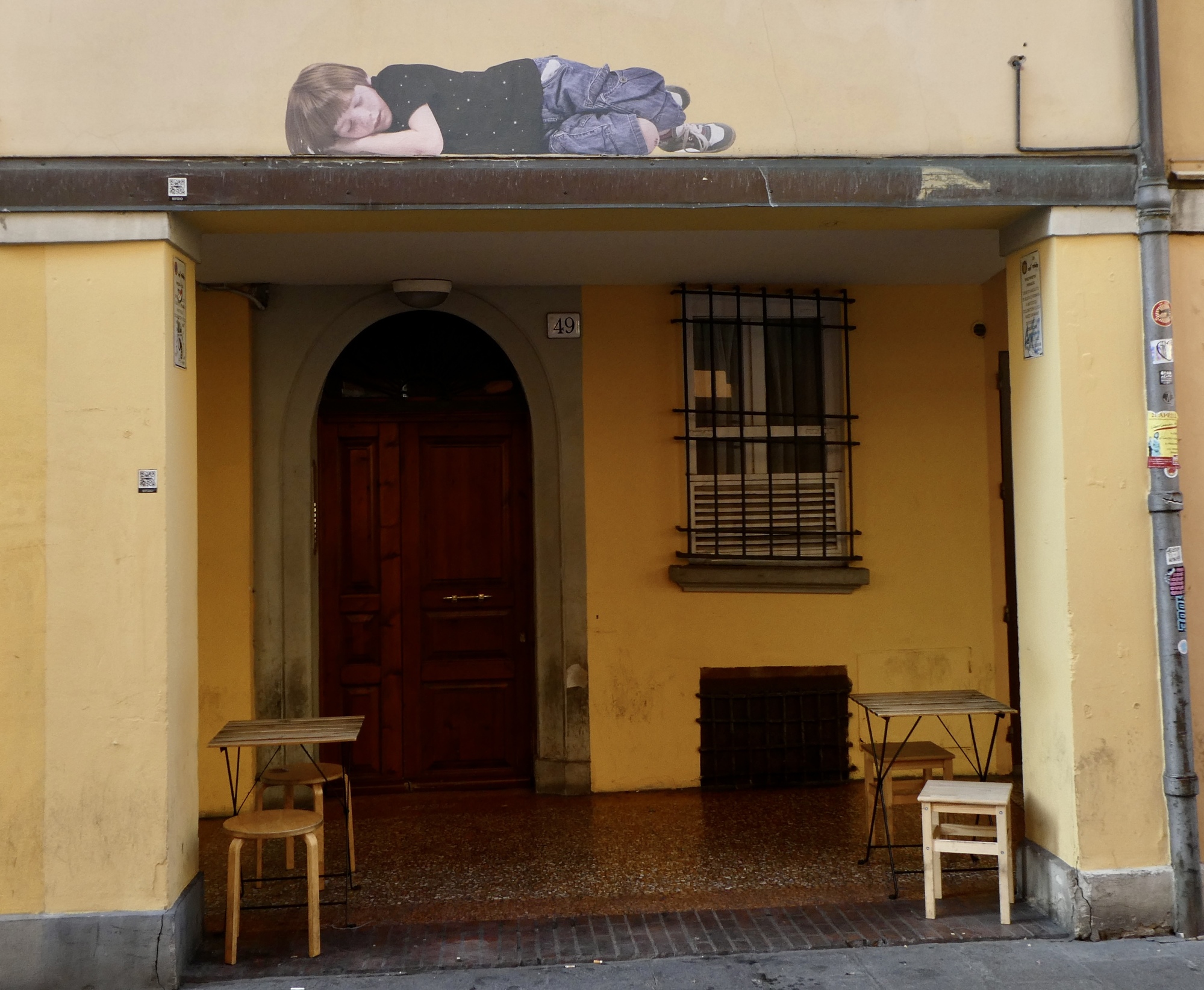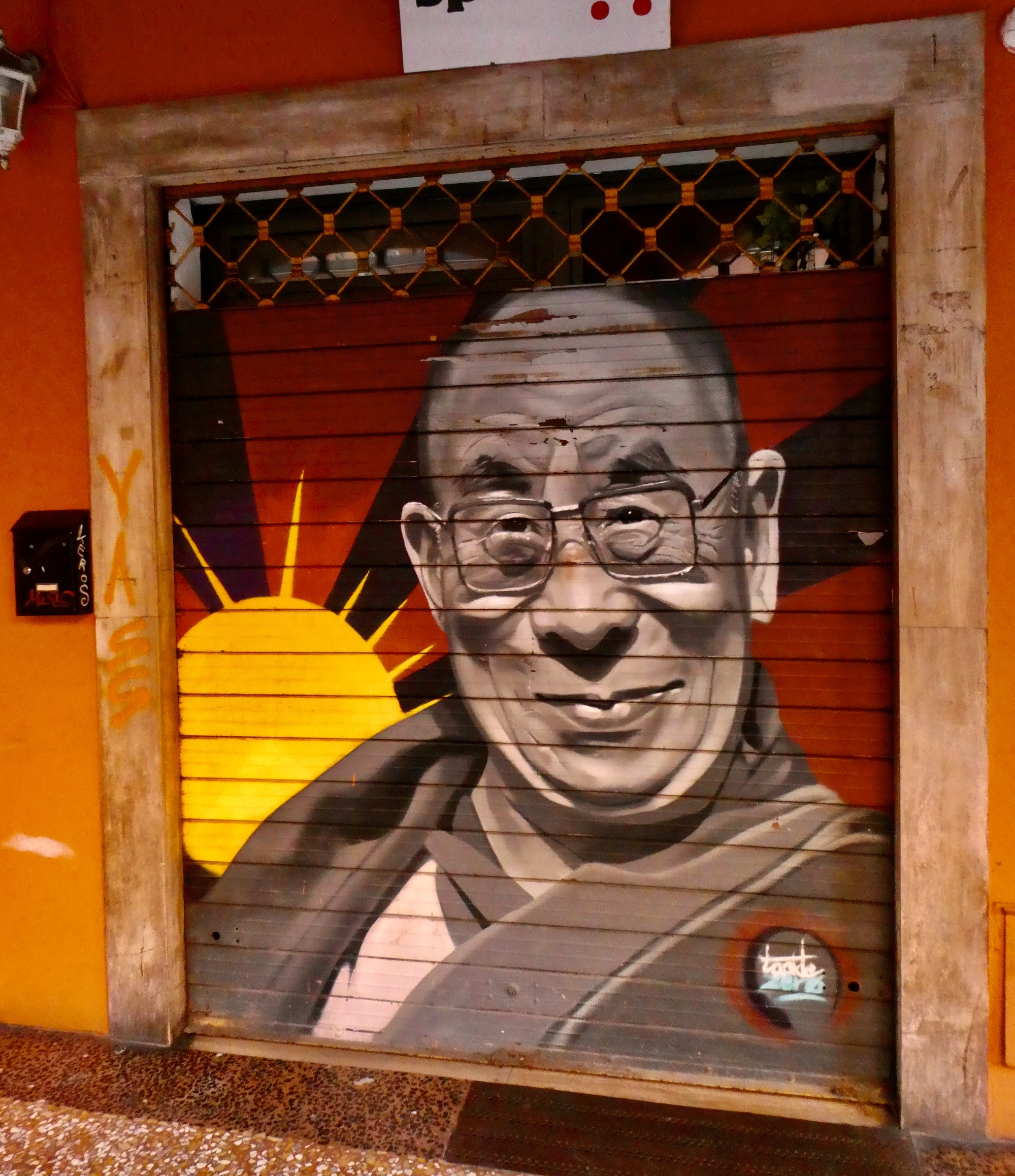 We walk the length of the street, stopping for one mural after another and looking for a candidate restaurant for tomorrow’s main meal before doubling back to Osteria Alla Due Porte to claim our outside table where we enjoy our meal and the adjacent parade.