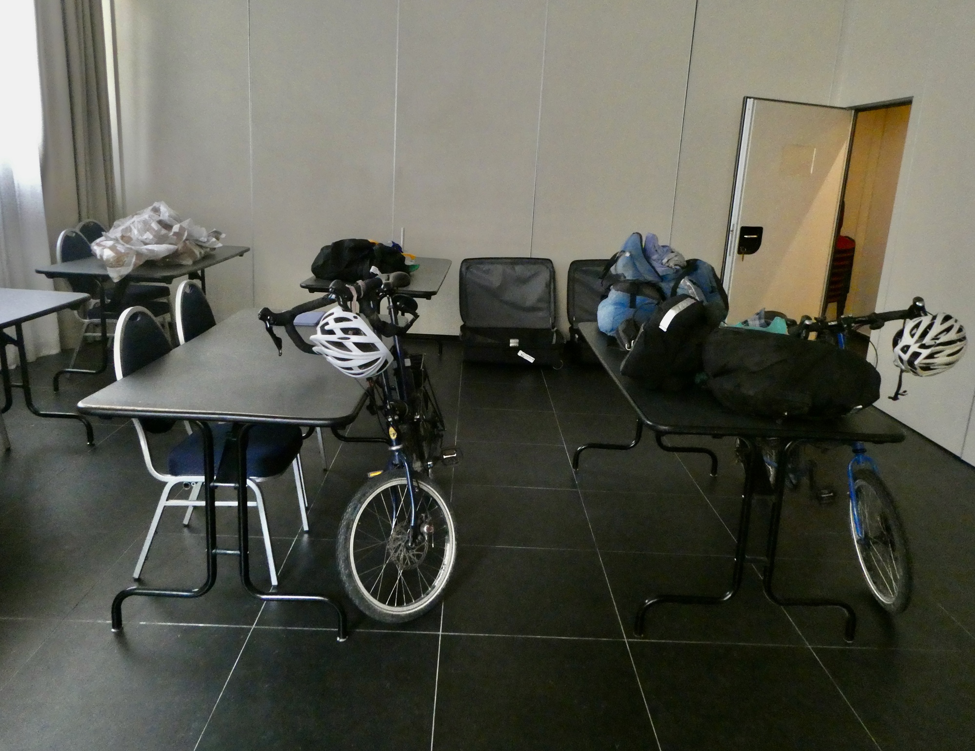 Well, it would be easier if the bike bays weren’t competely filled with suitcase mountains piled three or four deep when we step inside. It’s clear the bikes aren’t going there, so we lean them against the wall at the end of the car and secure them in place with our rack straps so they won’t roll away.