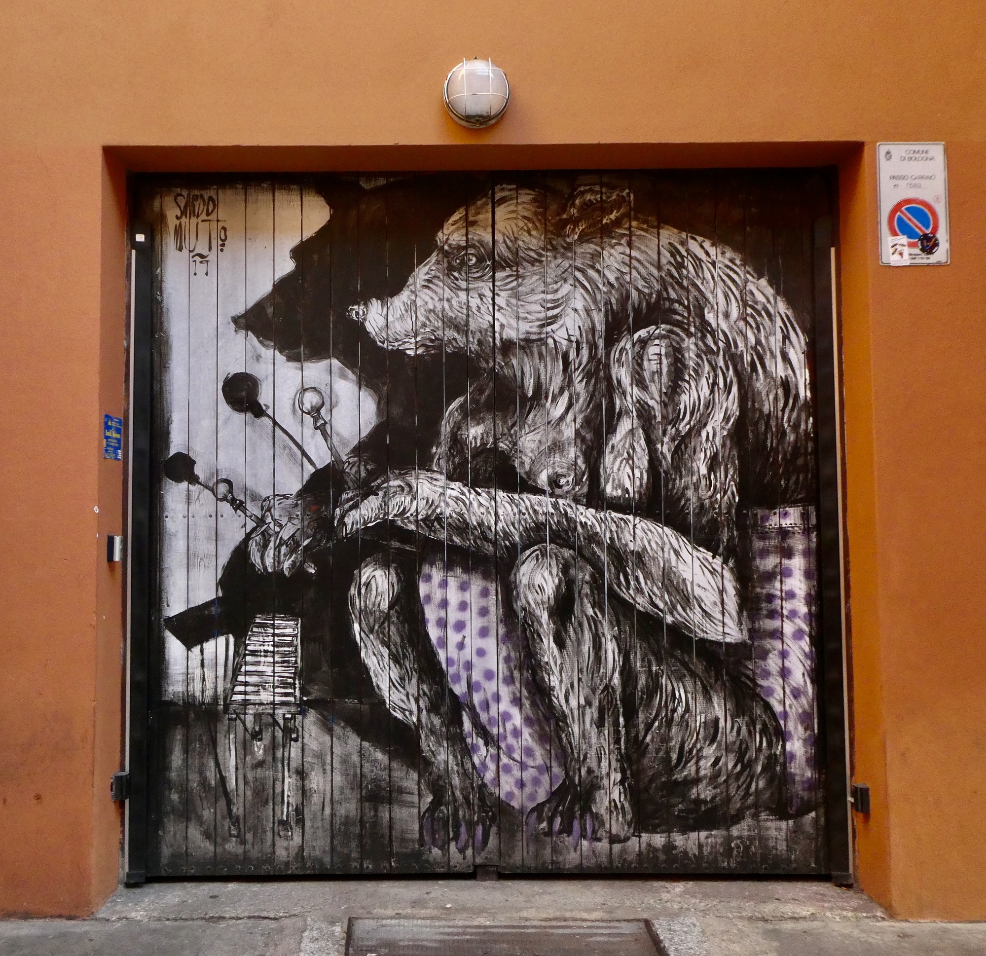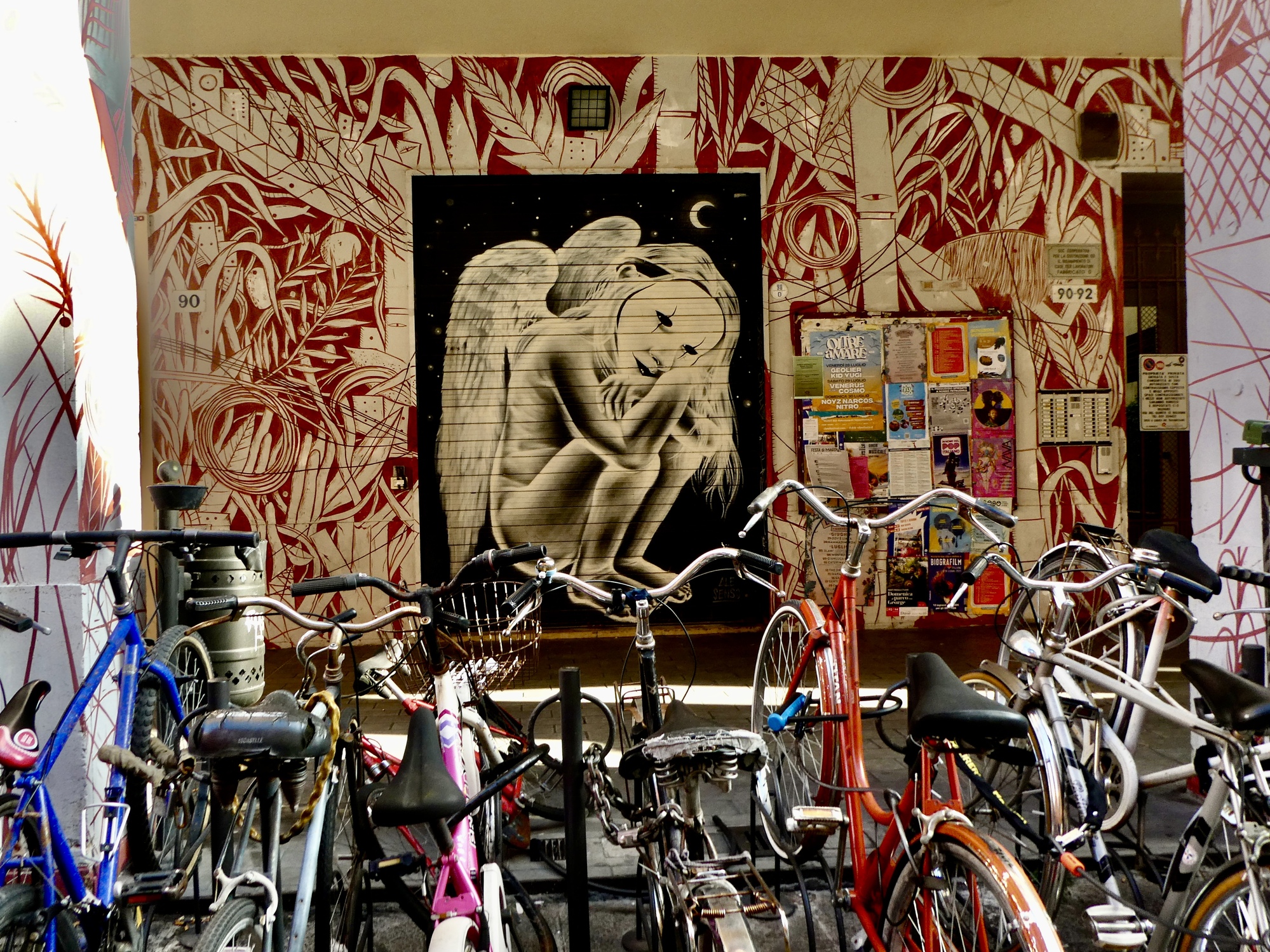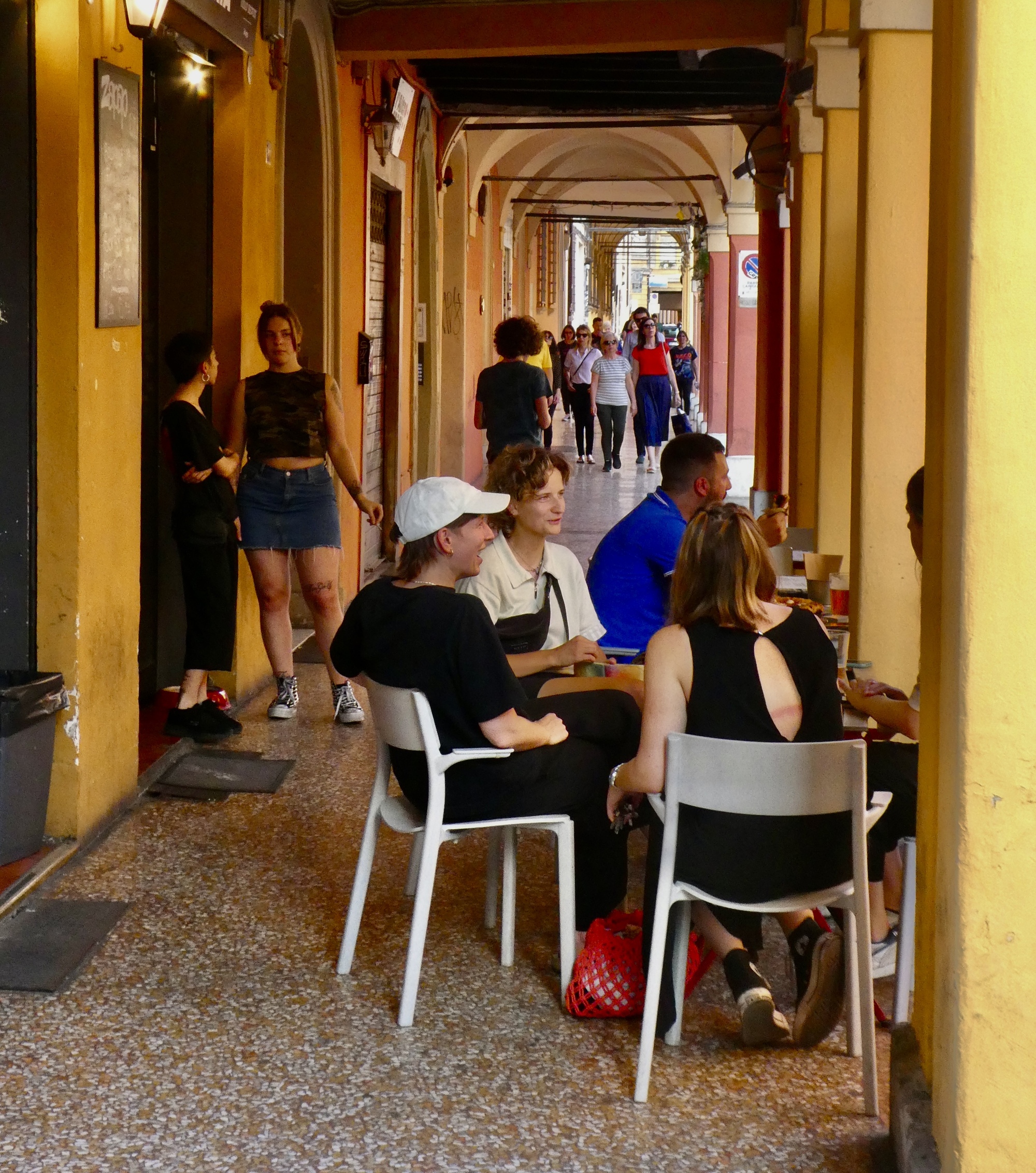 Our restaurant is on Via del Pratello, a fascinating street at the heart of Bologna’s bohemian district. Arcaded, essentially pedestrianized and lined on both sides with bars and restaurants, it’s a colorful, dynamic place great for people-watching and admiring the exceptional set of imaginative murals. It’s virtually a linear art museum that extends for perhaps a quarter mile.