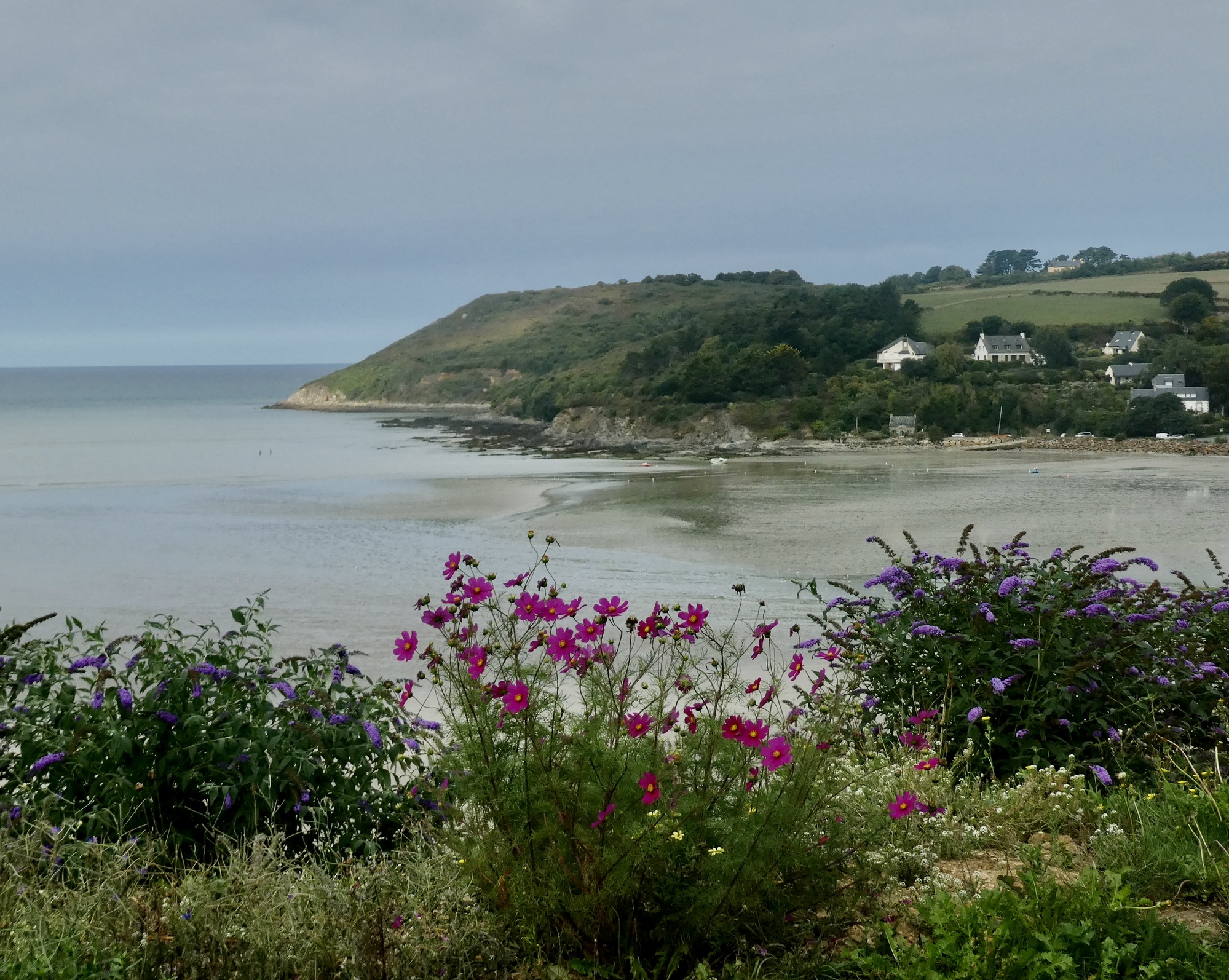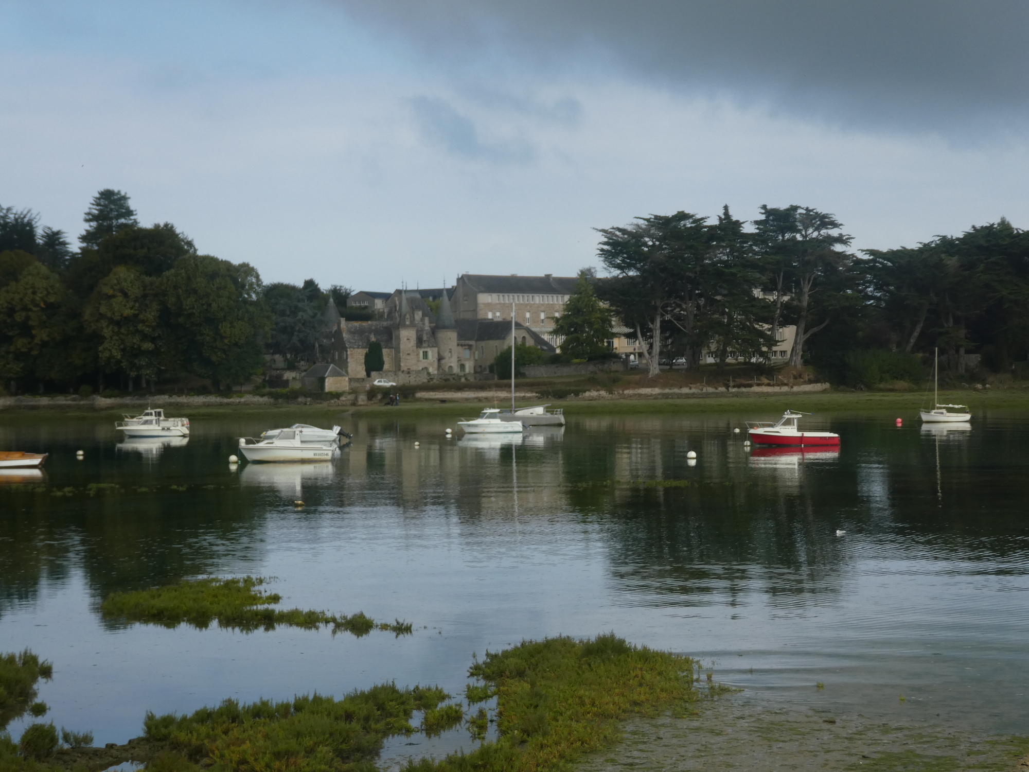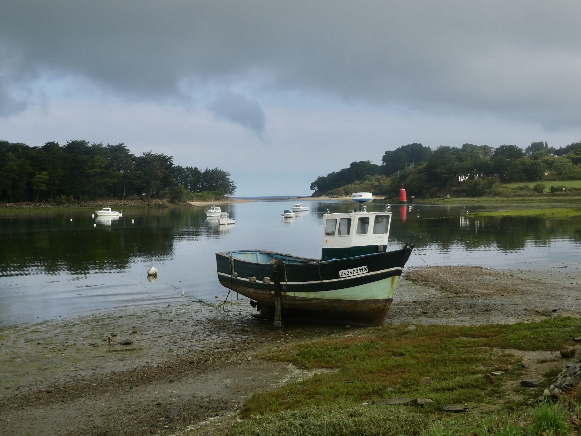 We get a slow start, not leaving until nearly the 10:30 checkout time. When we go down to check out we’re relieved to see our bikes leaning against the wall in the office. So, relocated rather than stolen. The first two miles are an easy roller along the coast road that circles Locquirec’s small inlet, passing by last night’s restaurant on the way. Two miles into the ride we come to the long bridge crossing the mouth of the Dourdon, and I pull my bike up on the sidewalk to admire the view.