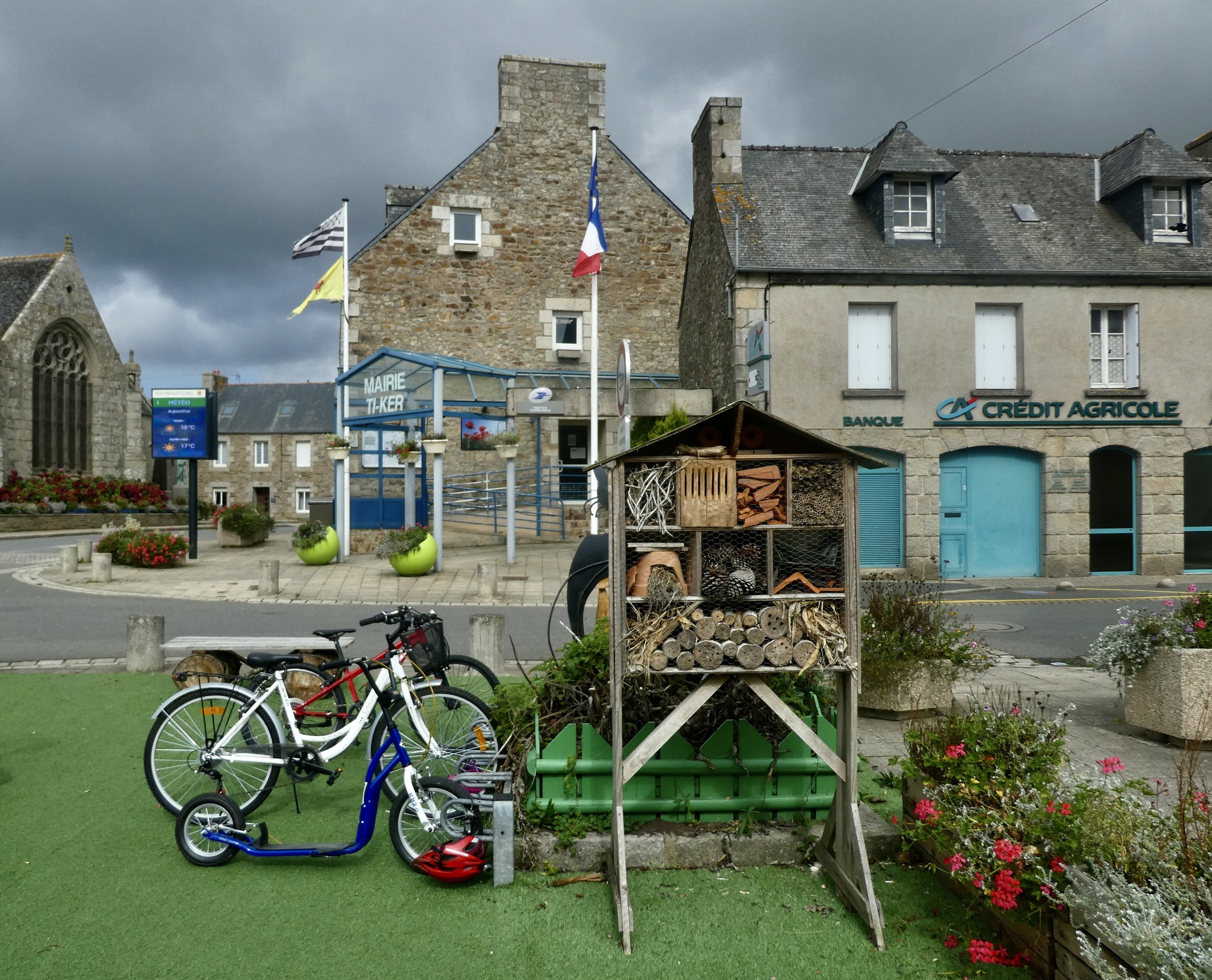 At the top we come out at Ploumilliau, a lovely small village where we stop in at a well stocked store to pick up fixings for lunch - bread, ham, Comte cheese, trail mix - and then sit in the square on the steps,of the war memorial for a few minutes and admire French village life before starting off again. Today we’re especially charmed by a classroom of schoolchildren coming down the sidewalk, animated and cheerfully boisterous.