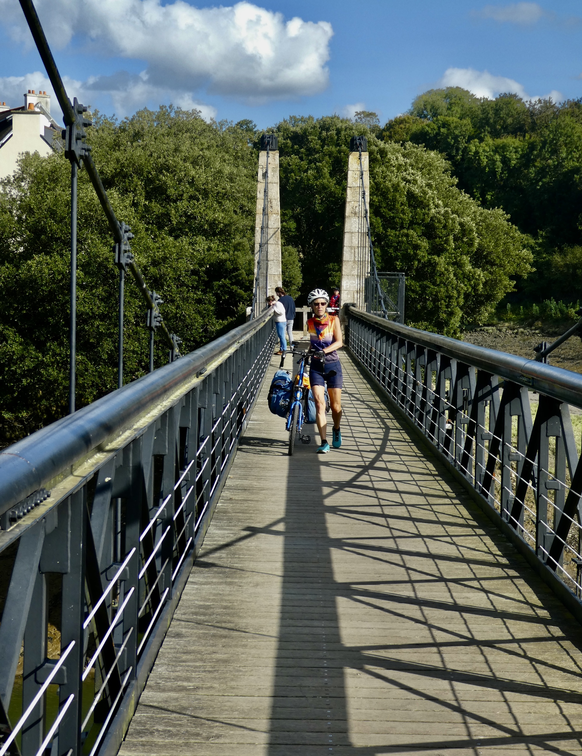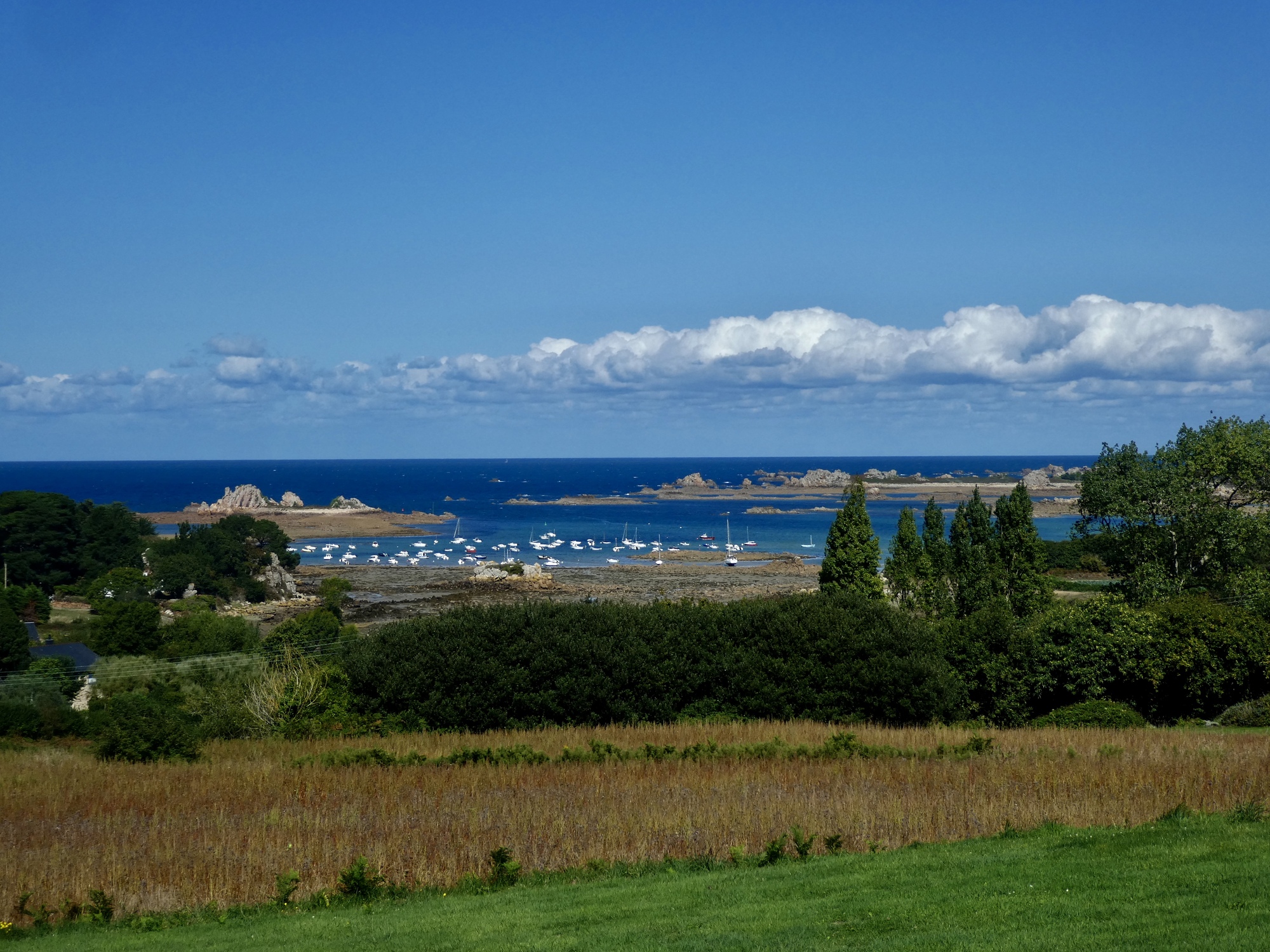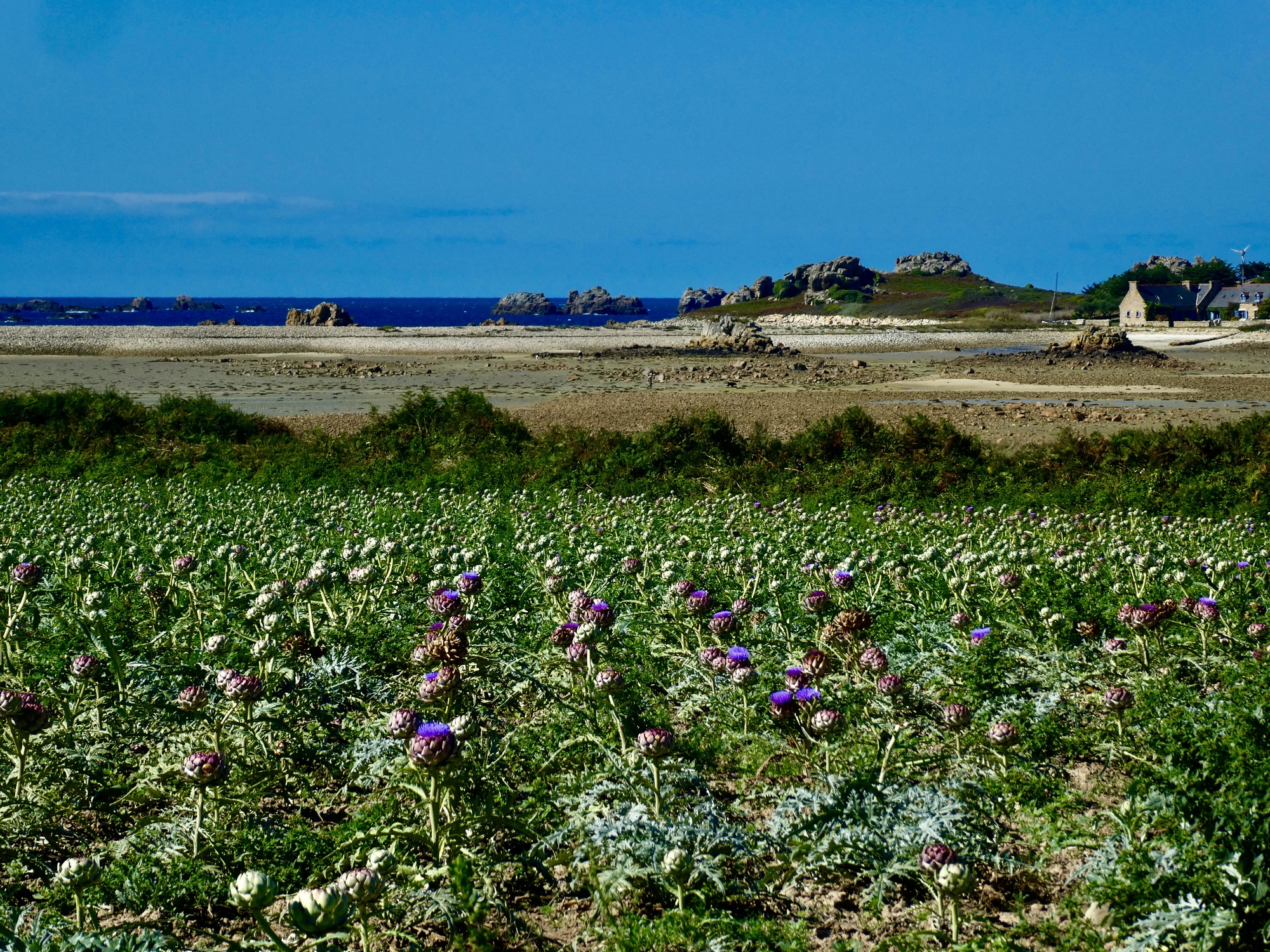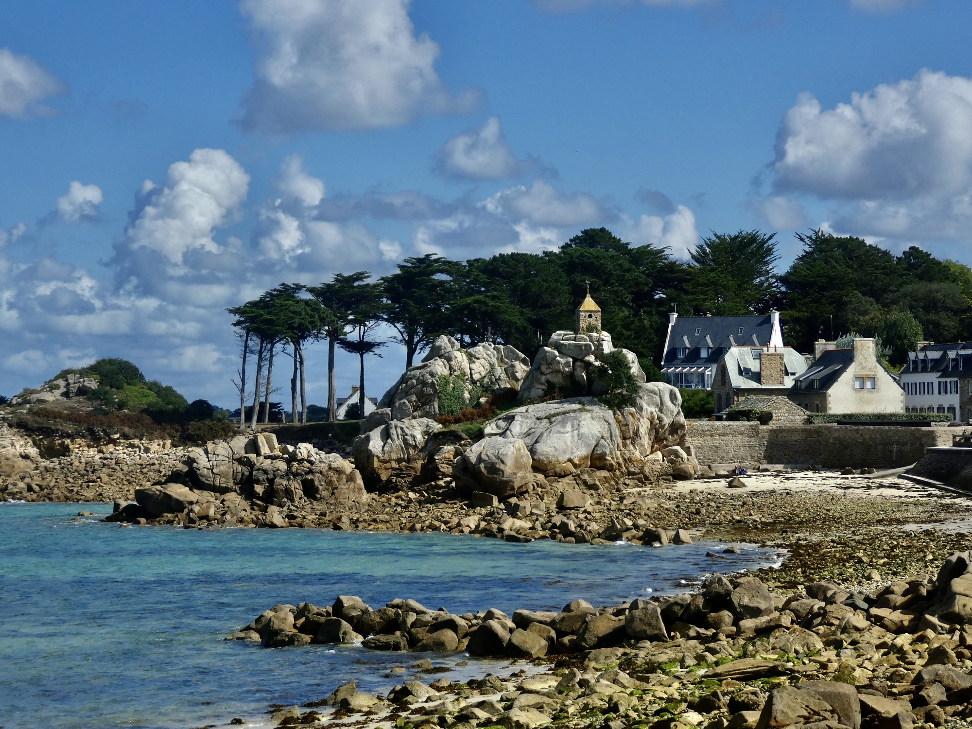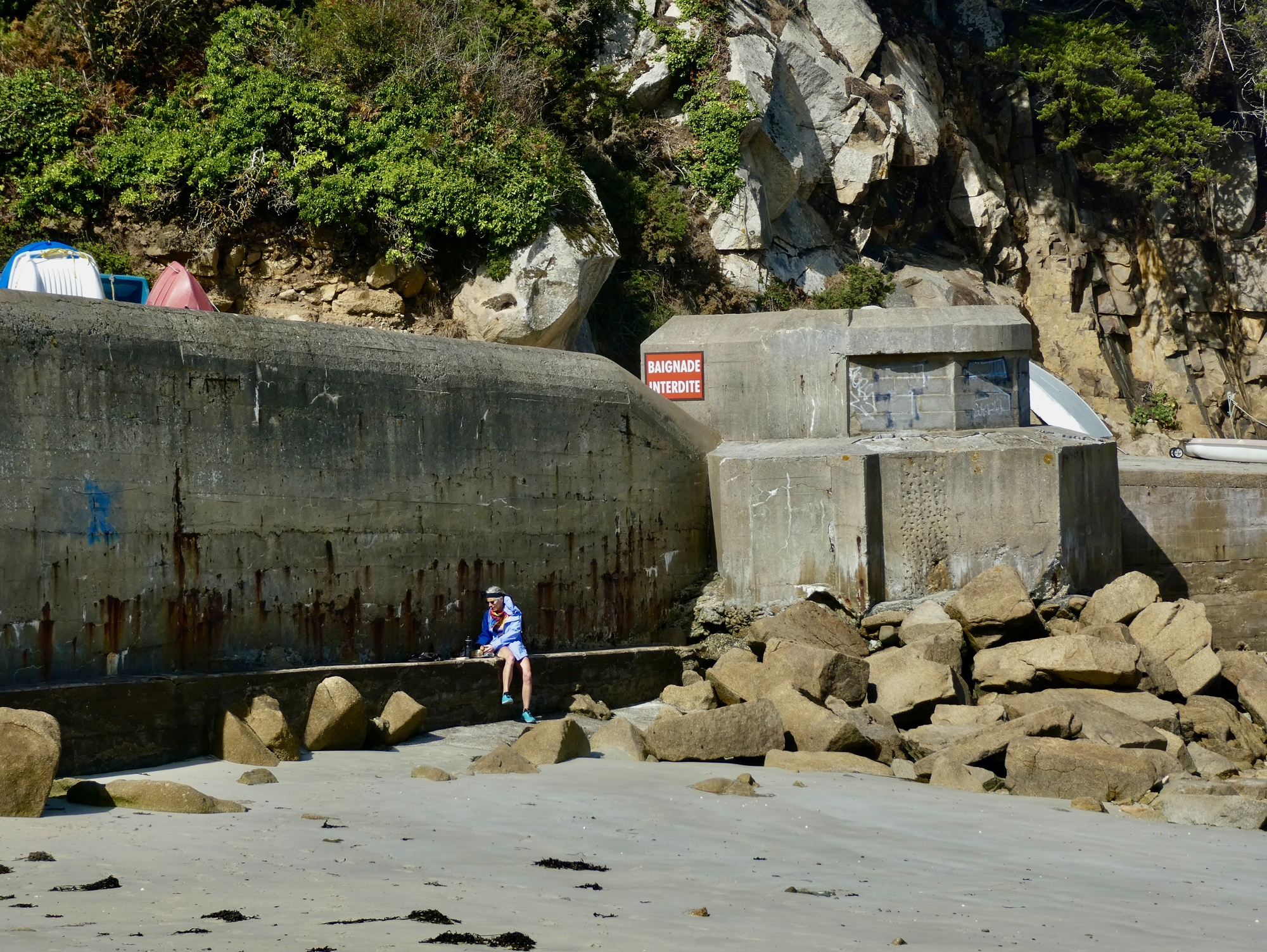 Rachael is faring much better once we’re back on the bikes and heading east. Her back has loosened up, and it helps that the wind is with us now and not affecting her breathing by blowing into her face. We backtrack to Perros and then generally follow the coastline on small roads until we come to Nantouar, where we stop for lunch. It’s in the sixties and sunny but with the stiff wind it’s surprisingly chilly once we stop biking so we find the most sheltered spot we can, leaning against a concrete seawall.