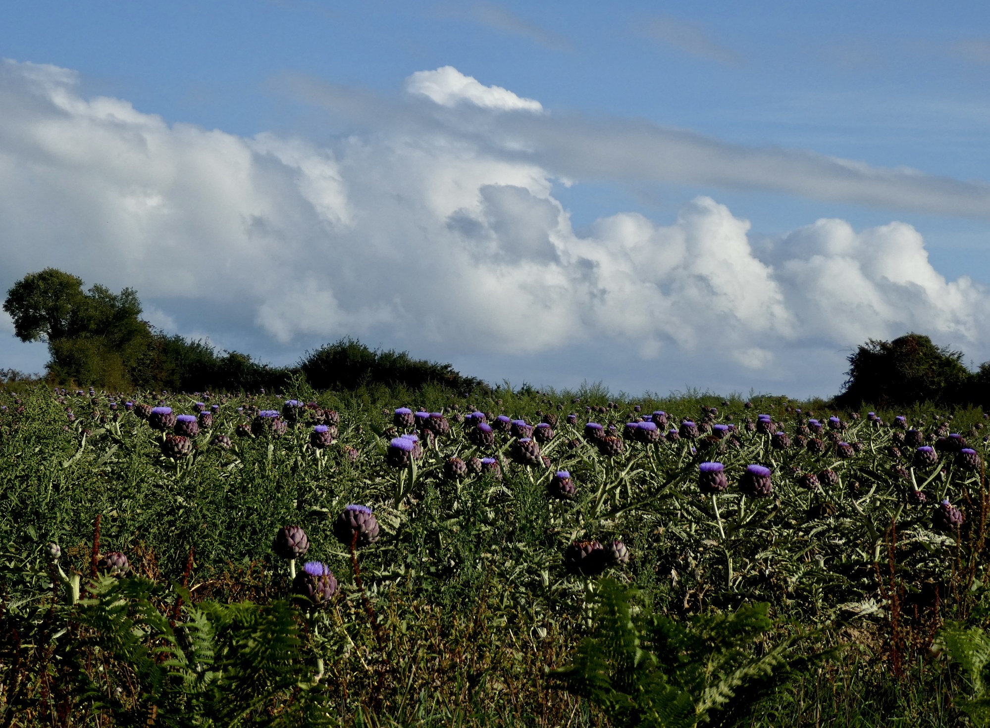 Once on top we bike through a few miles of fairly level terrain, cycling past small vegetable acreages planted in corn, artichokes, brassica, and other row crops. For the first three or four miles we can still hear the bells chiming from what I assume is the cathedral before finally dropping toward the estuary again.