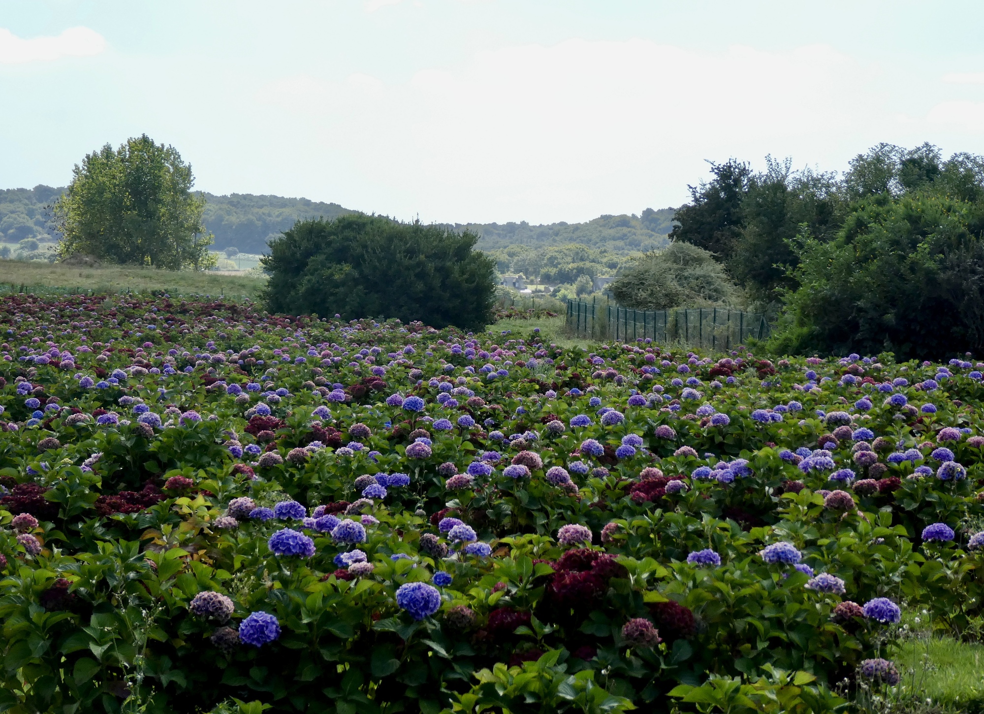Our route today is a tipped S-shape that’s mostly inland but never far from the coast. Every so often we’ll drop to the coast, enjoy some stunning views across the channel, and then climb back up again. Away from the sea it’s less dramatic but still beautiful as we bike through farmland that’s taking on the aura of autumn - the equinox is just a day or two away, I’m startled to realize. The corn stalks are brown and withering, we’re starting to see chestnut husks on the pavement, the ivy is starting to redden, and everywhere there is hydrangea along the walls and fences, its autumnal colors a blend of fading blue, maroon and brown.