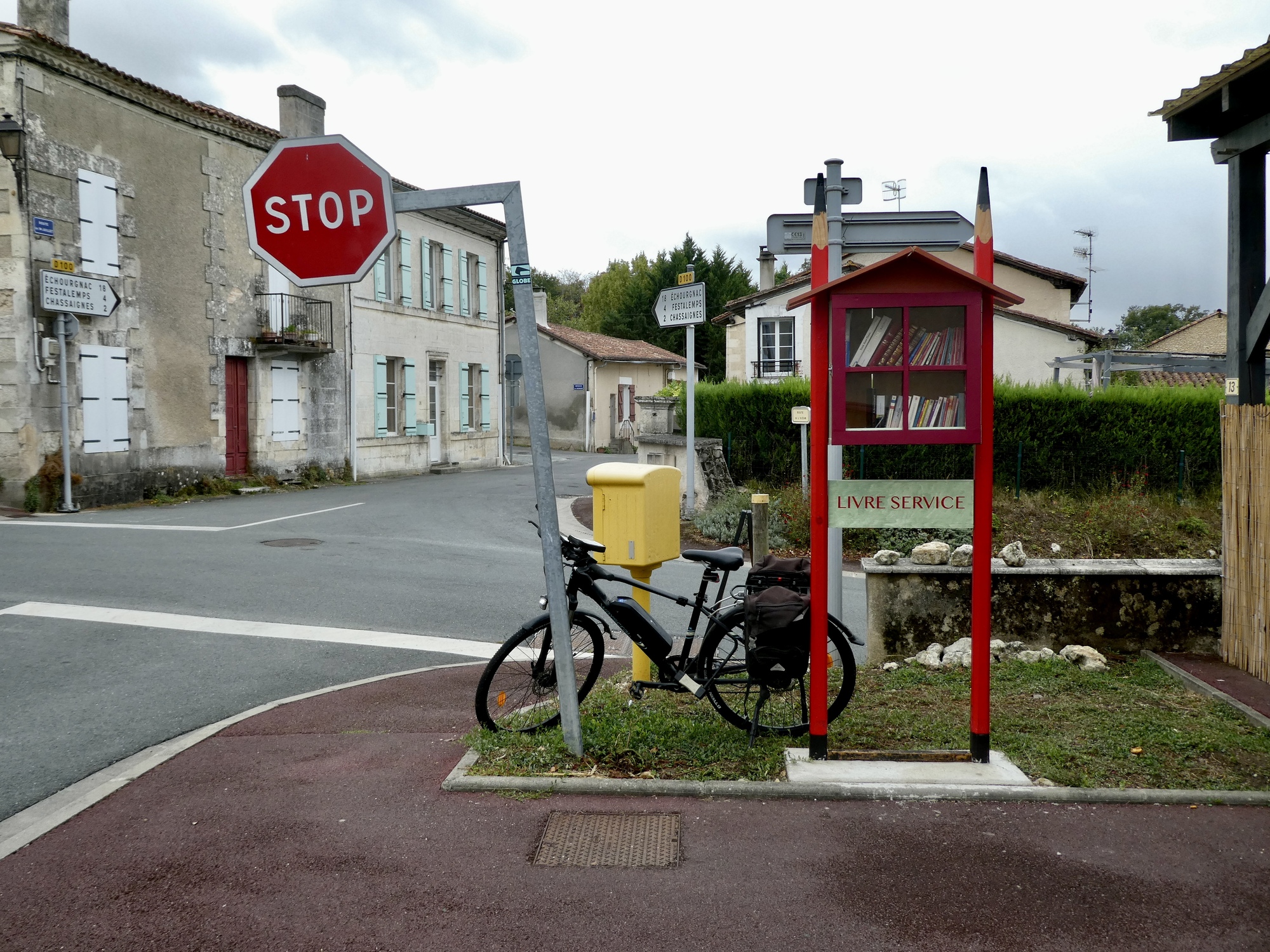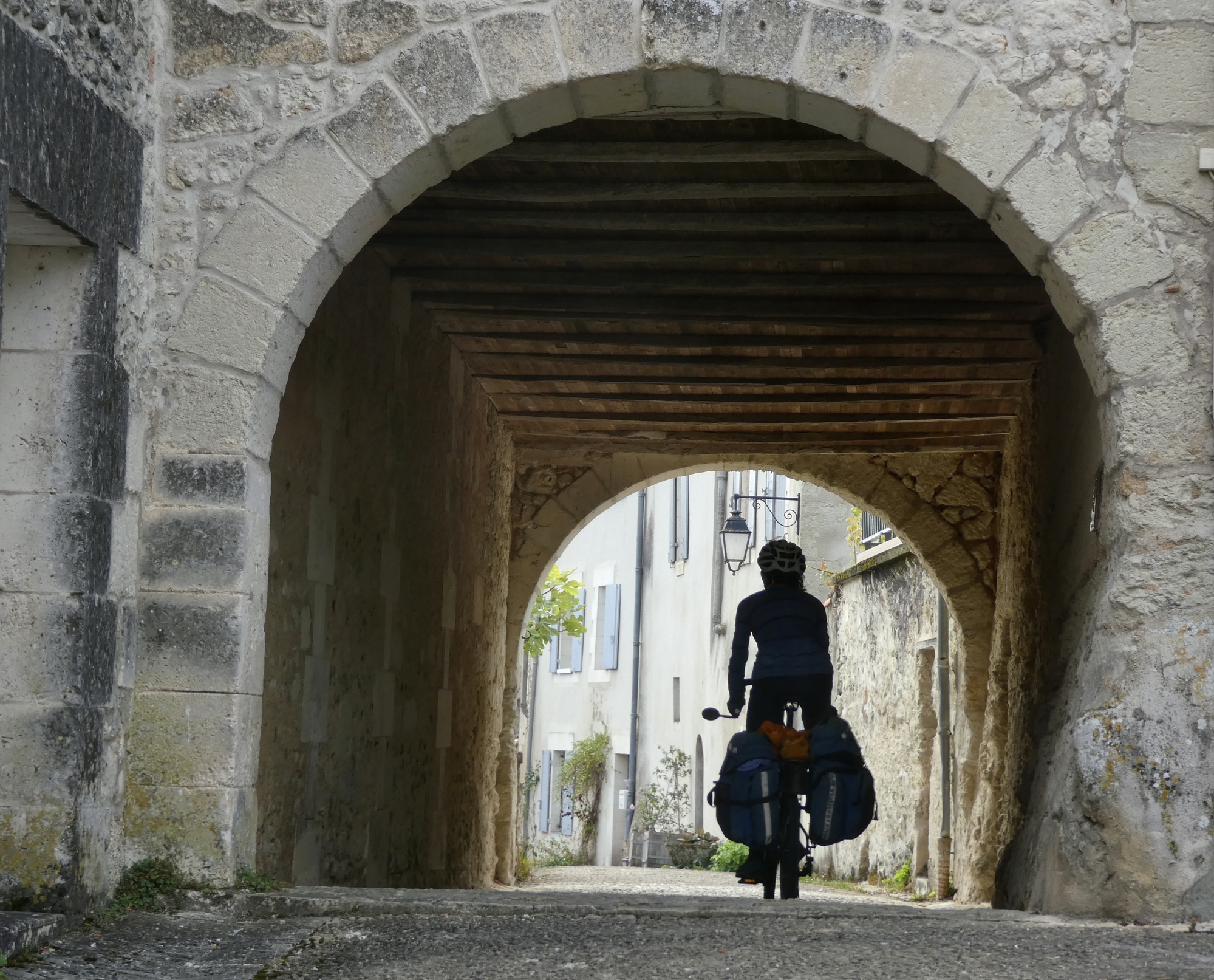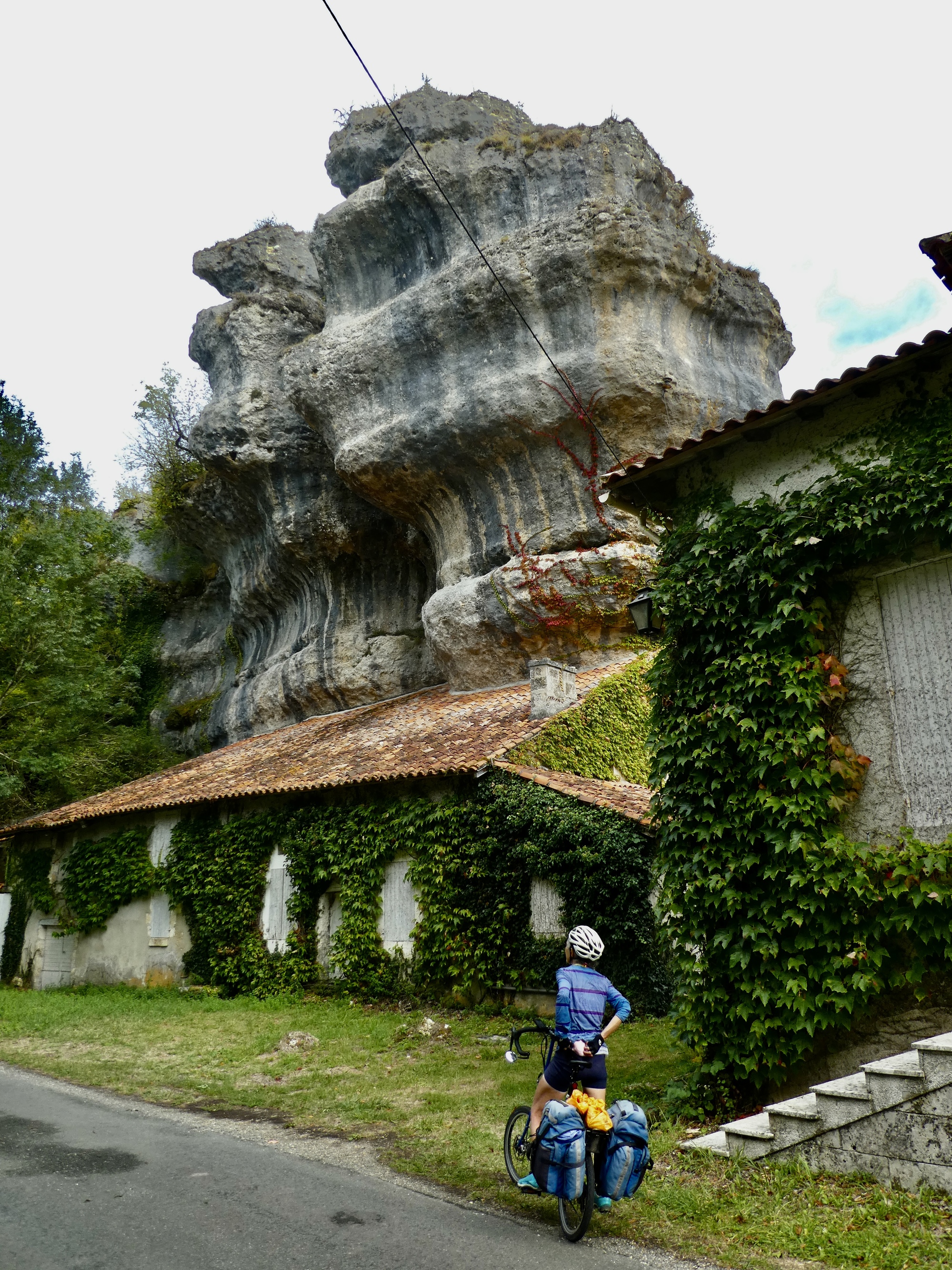 We have a bit longer ride today, but an easier one. Aubeterre and Brantôme are both river towns on the Dronne, and we’ll more or less follow the river the whole way. As you’d expect, we go back and forth between short stretches biking right beside the water and longer ones that cut across hills on either side. It’s the riparian three step: climb, coast, glide; climb, coast, glide.