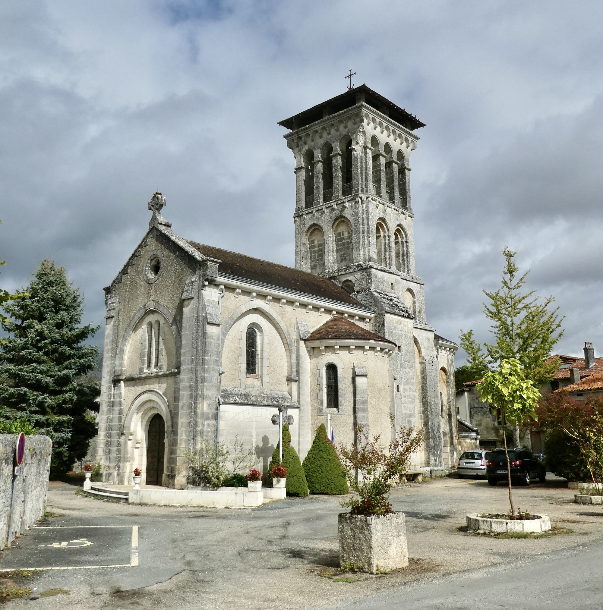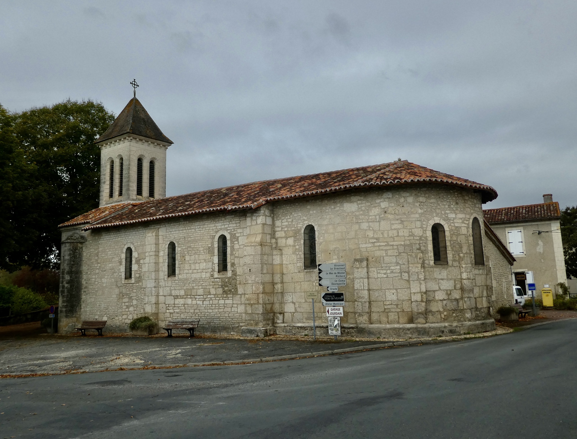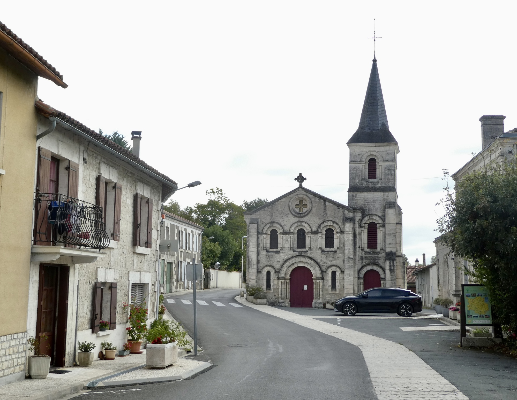 We have a bit longer ride today, but an easier one. Aubeterre and Brantôme are both river towns on the Dronne, and we’ll more or less follow the river the whole way. As you’d expect, we go back and forth between short stretches biking right beside the water and longer ones that cut across hills on either side. It’s the riparian three step: climb, coast, glide; climb, coast, glide.