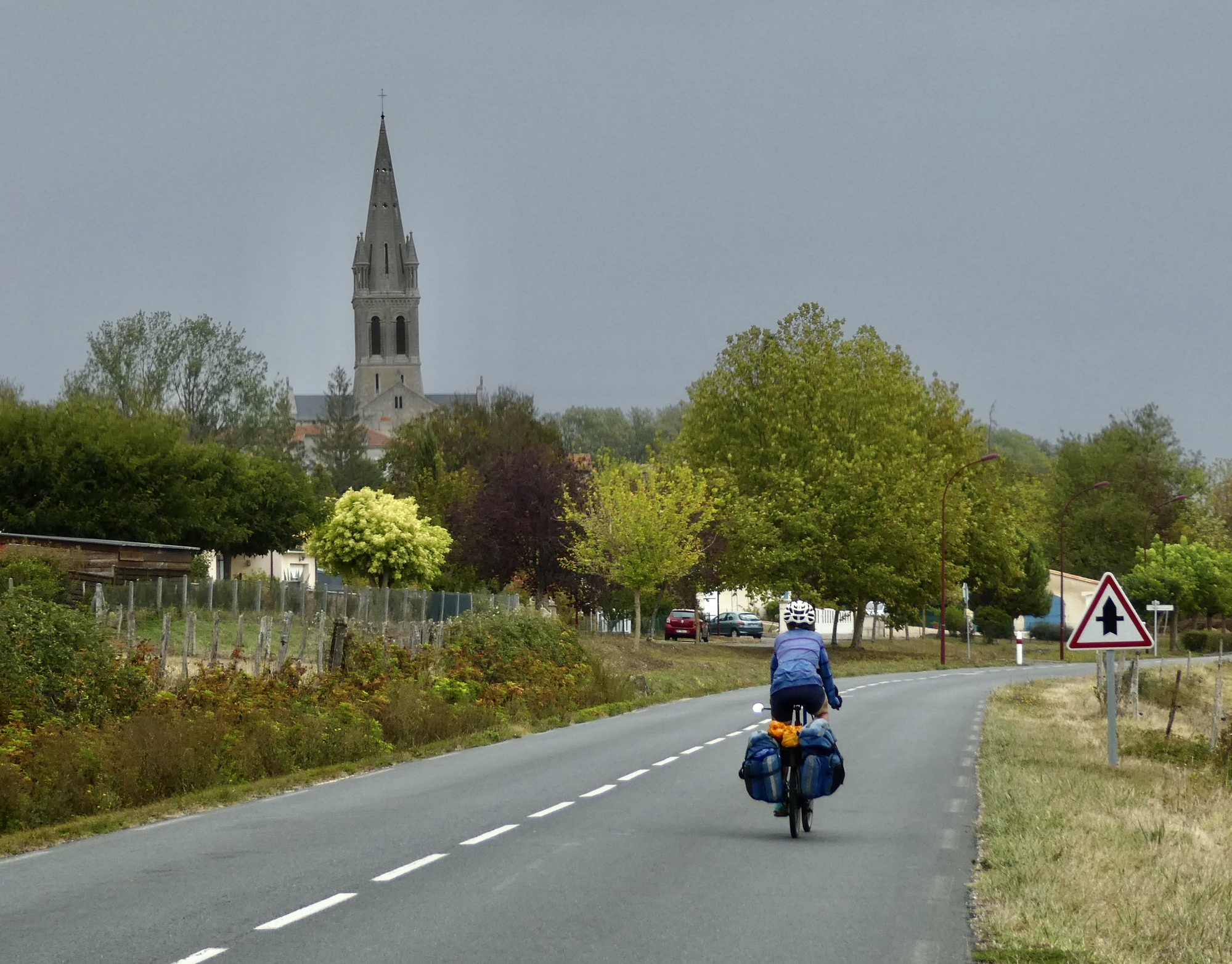 It’s a quiet ride, but very pleasant one. Besides the usual scenic highlights we expect to see but nevertheless are excited by when we come upon them - churches, interesting livestock, mills, dovecotes - the day has the added drama of uncertain weather. It wasn’t predicted, but there are periods where it looks like we could get wet, followed from time to time by ones where we actually do get wet. It’s nothing serious though, little more than a light misting for the most part.