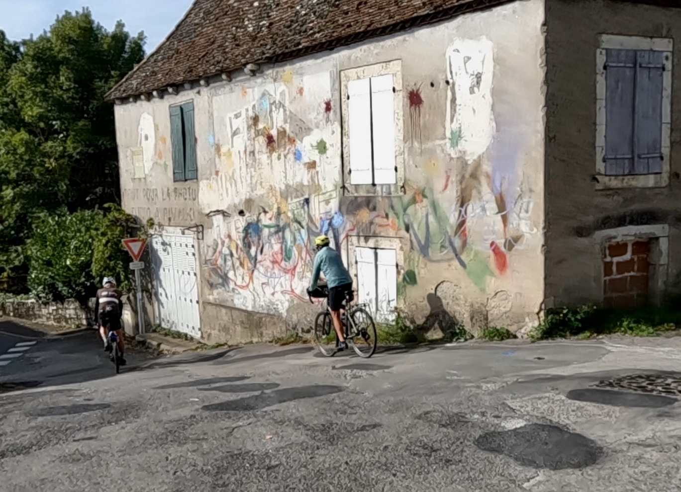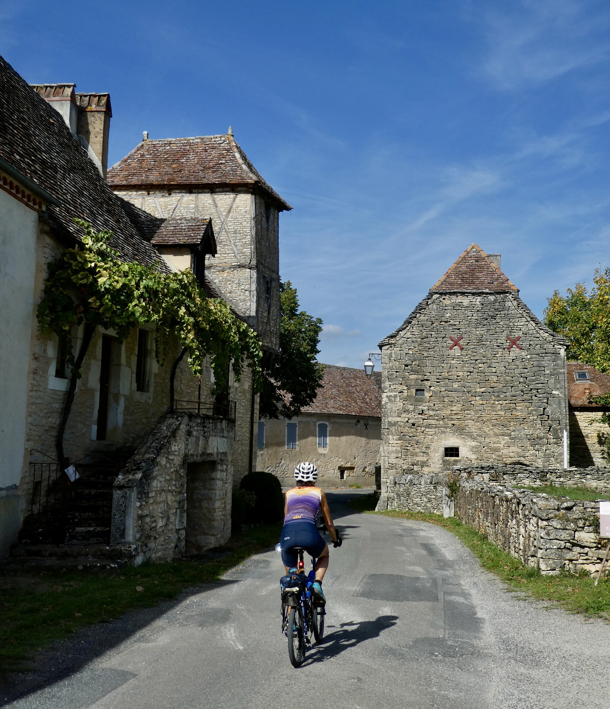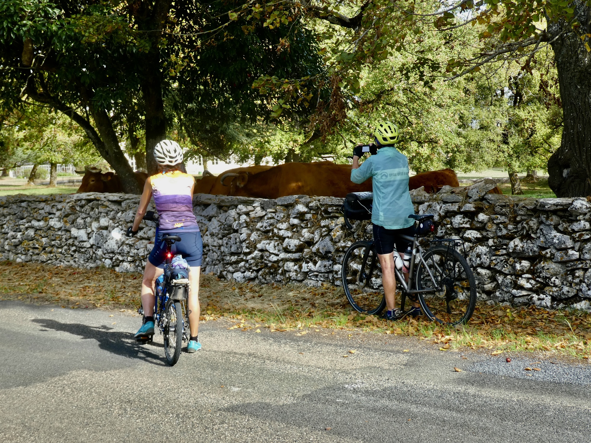 For the next seven or eight miles we bike across the causse, passing stone walls and fields of cows we saw yesterday - literally the same ones at first, because for the first several miles we’re backtracking yesterday’s ride from Sarlat, following the course of the TdF time trial. This time is different though because we have Susan with us - meaning among other things that we frequently stop to commune with the cows. Today she educates us on the social behavior of the various breeds - Limousins are the most curious and social, but haughty Holsteins will hardly give you a second look.
