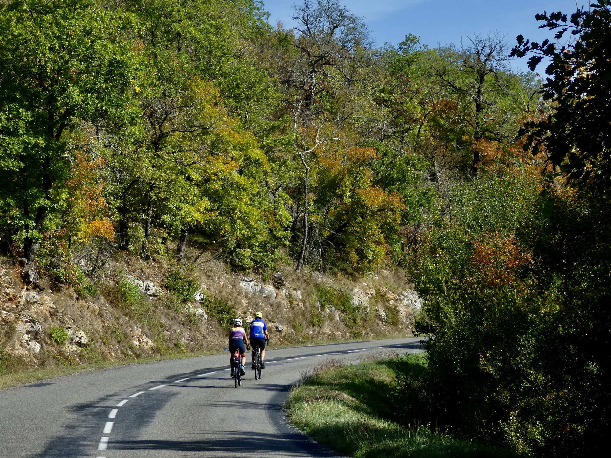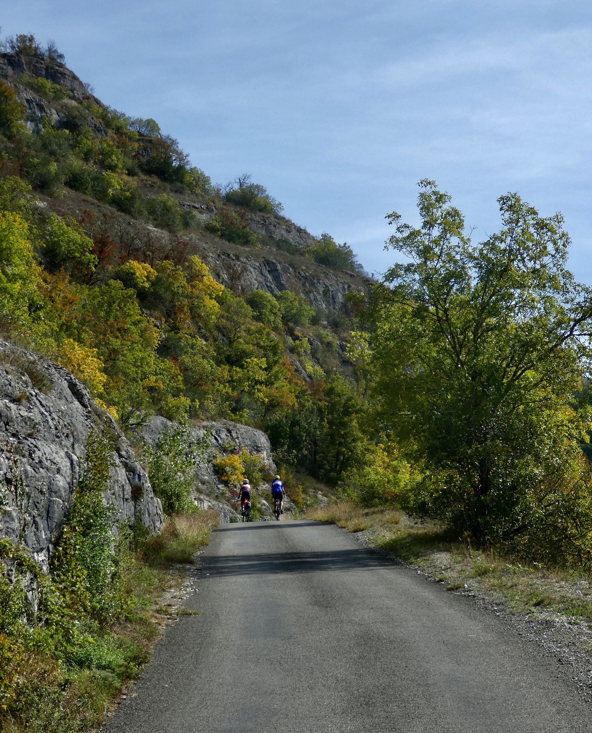 When we feel like it’s time to move on we find a bench in the sun on the rim of the canyon to enjoy our lunch, and then move on. The ride back to Gramat is similar to the ride in, and includes another steep descent and climb as we cross the Rignac. Even without Rocamadour as the draw it would have been a wonderful outing.