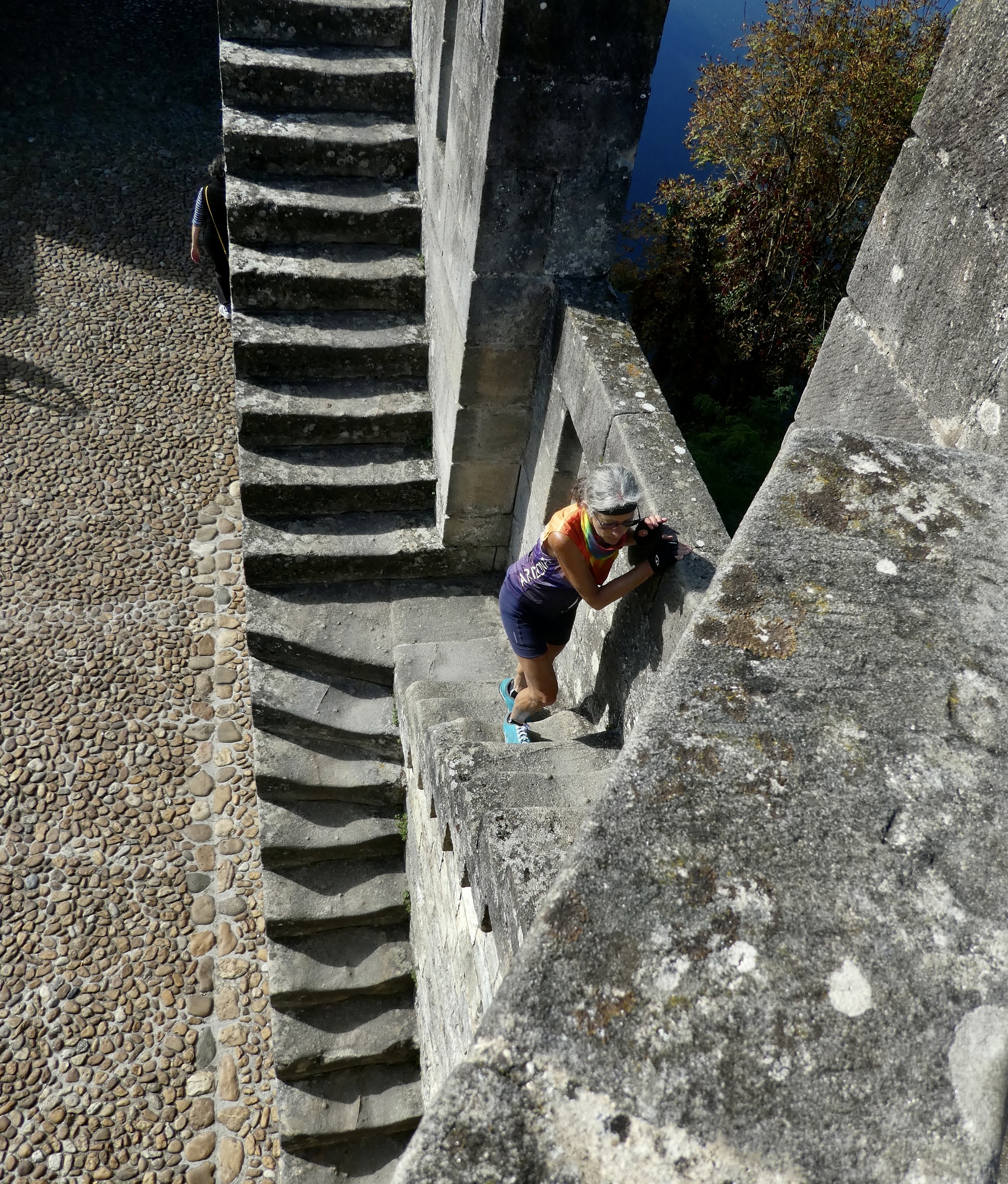 There are stairs up to the parapet on the northernmost (town side) tower. The stairs are very worn and uneven, and there are no guard rails on either side. Caution is advised.