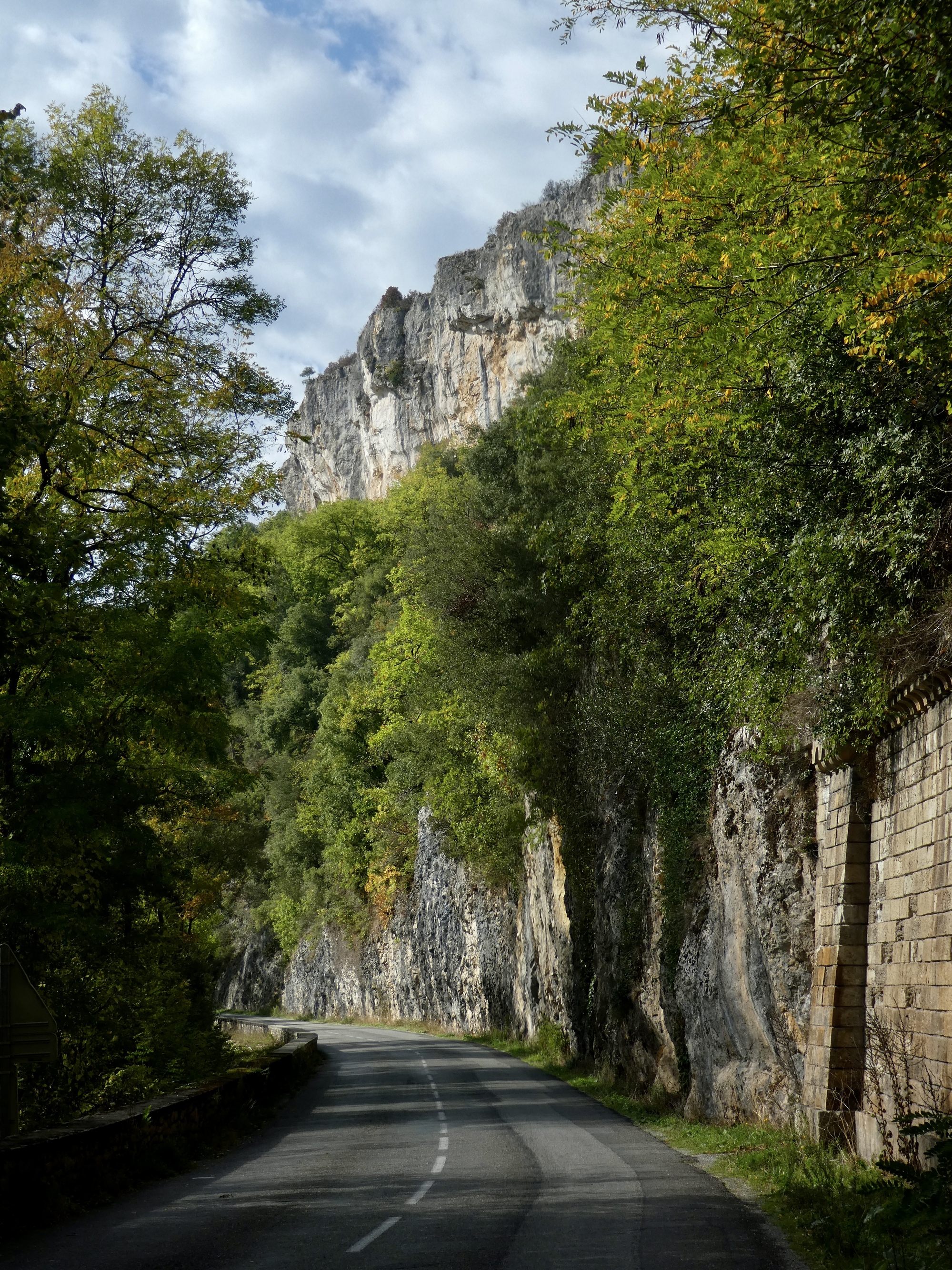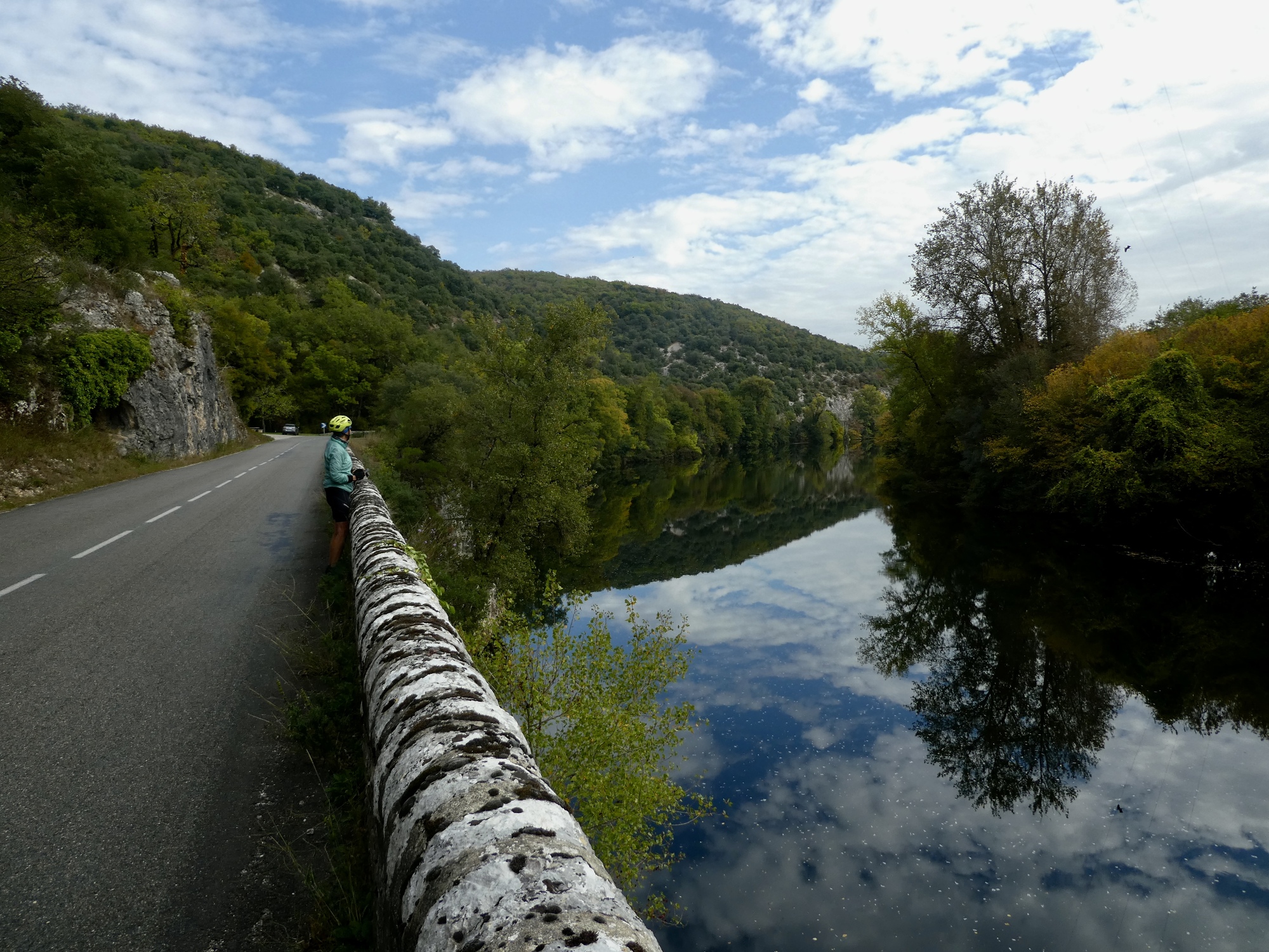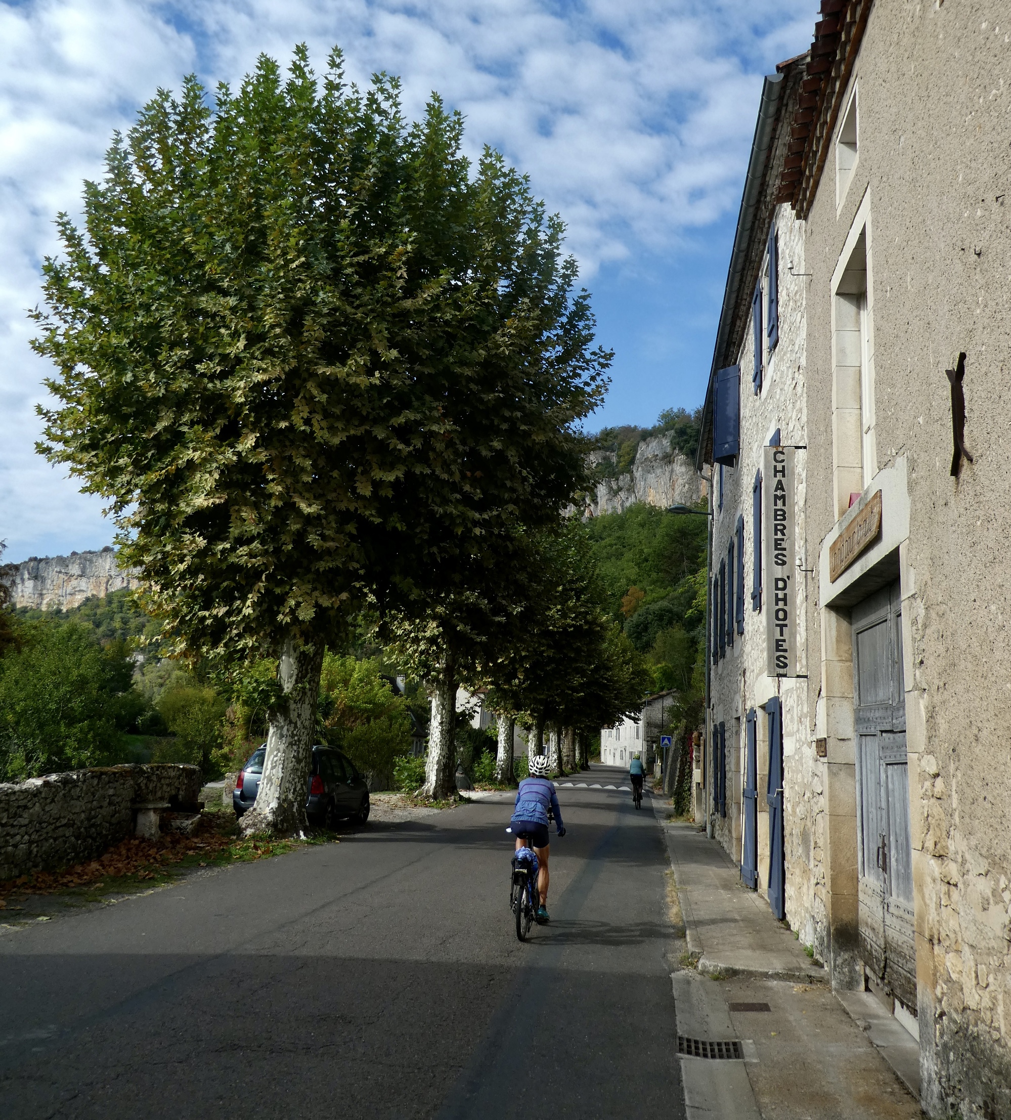 For about the first ten miles we followed the north bank on D662, the departmental road. Dramatic cliffs were our near-constant company, on one bank or the other.