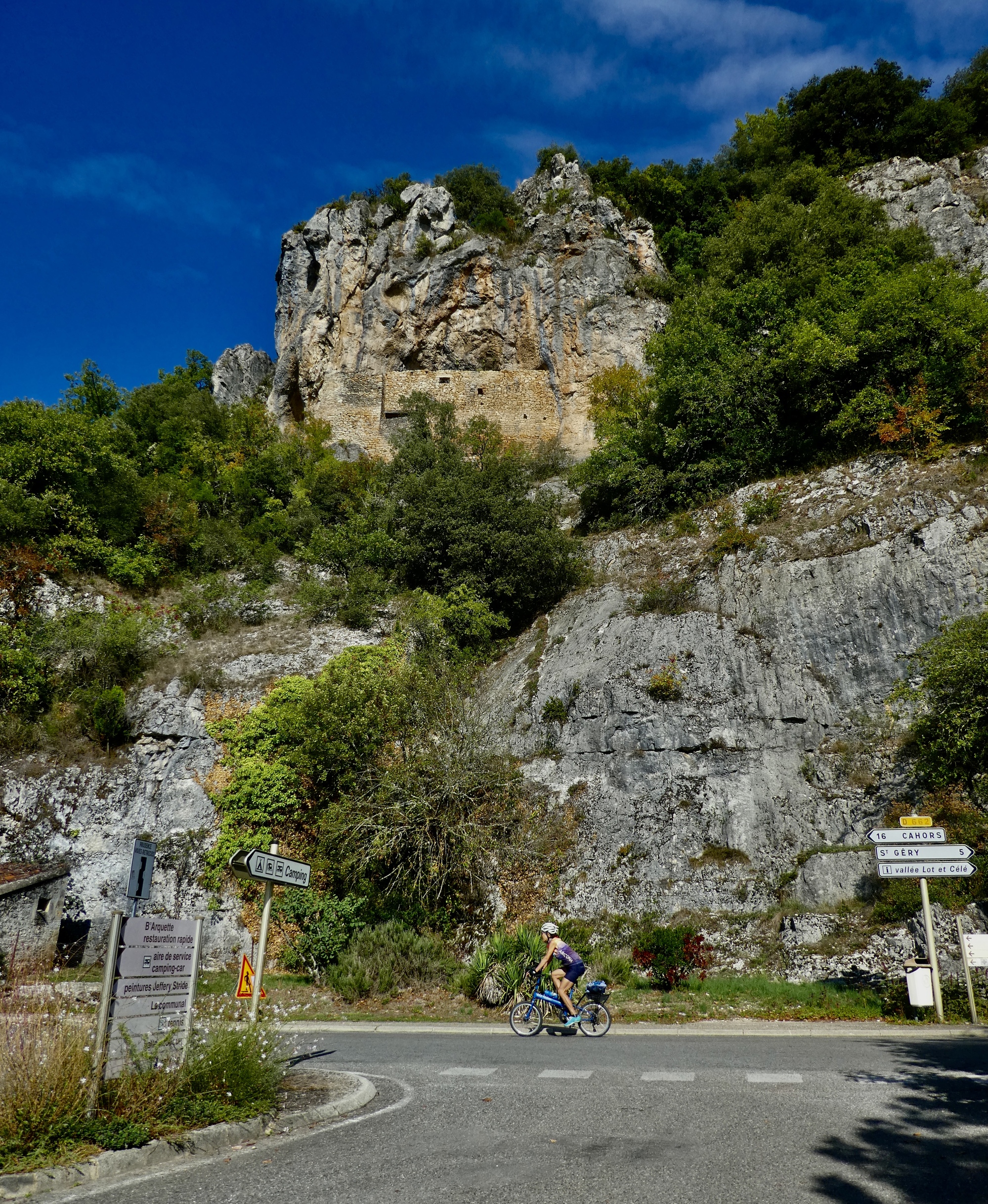 The views return in a dramatic way at the eastern end of the loop though, when we overshoot Bouziès by a couple of miles until we come to a viewpoint looking down on Saint-Cirq. After that we double back toward Bouziès on a spectacular road along the top of the cliffs above the towpath we walked along yesterday. An exhilarating way to end another wonderful ride.