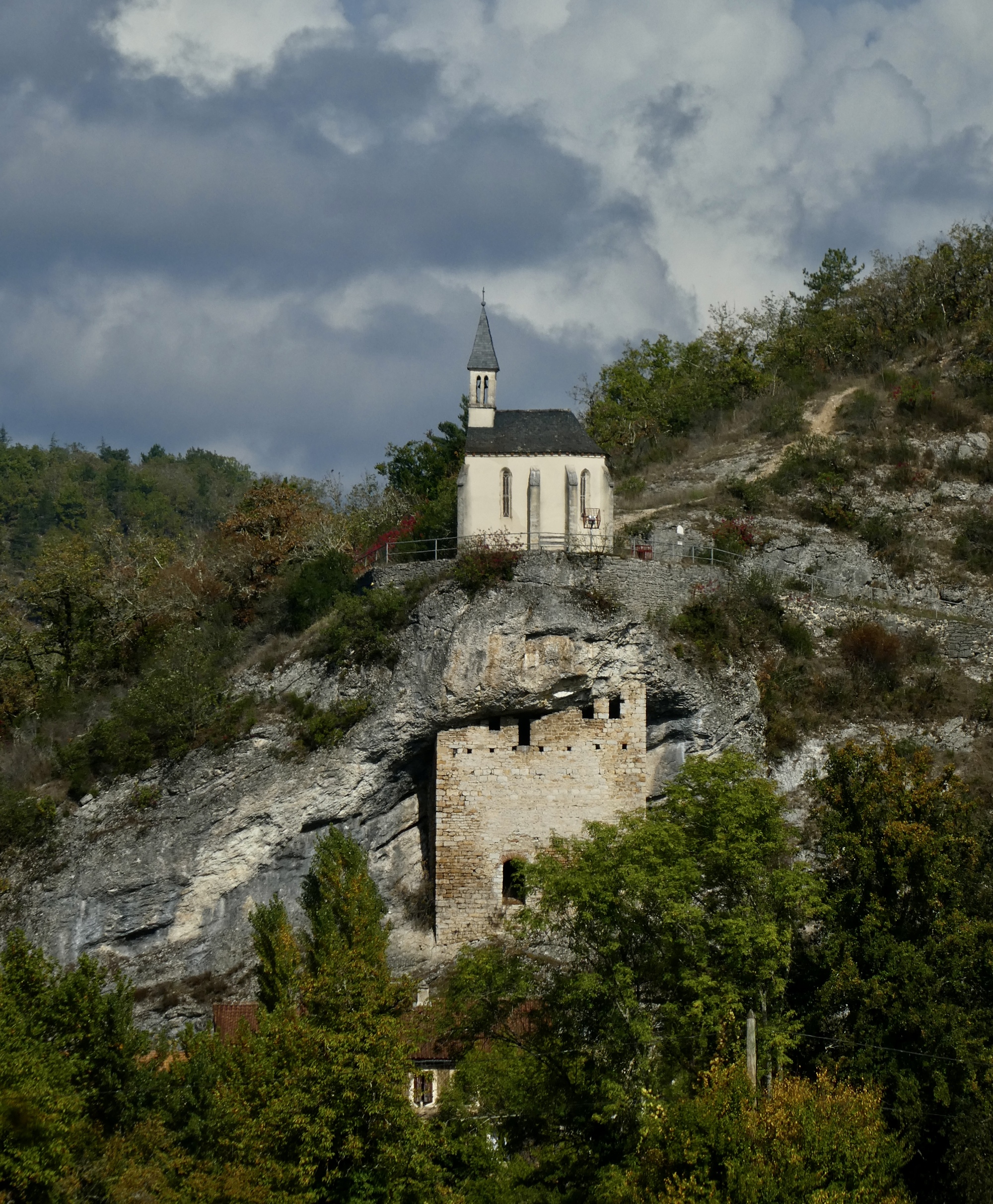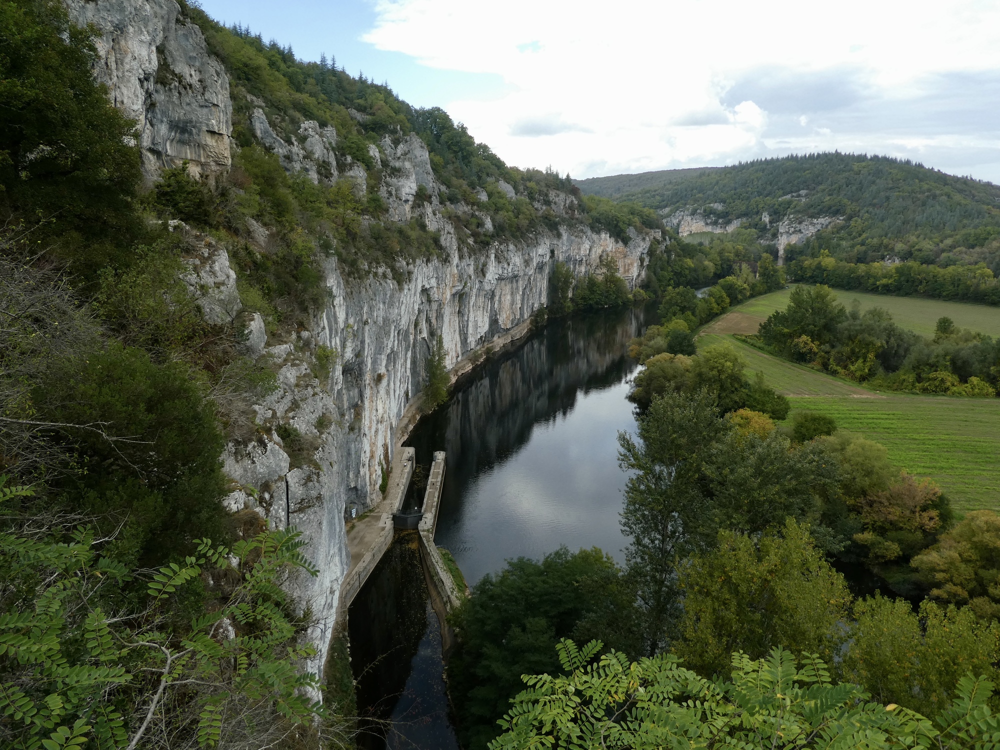 Dropping toward Bouziès. The cliffs are the ones soaring above the towpath, which I think you can just make out along their base.