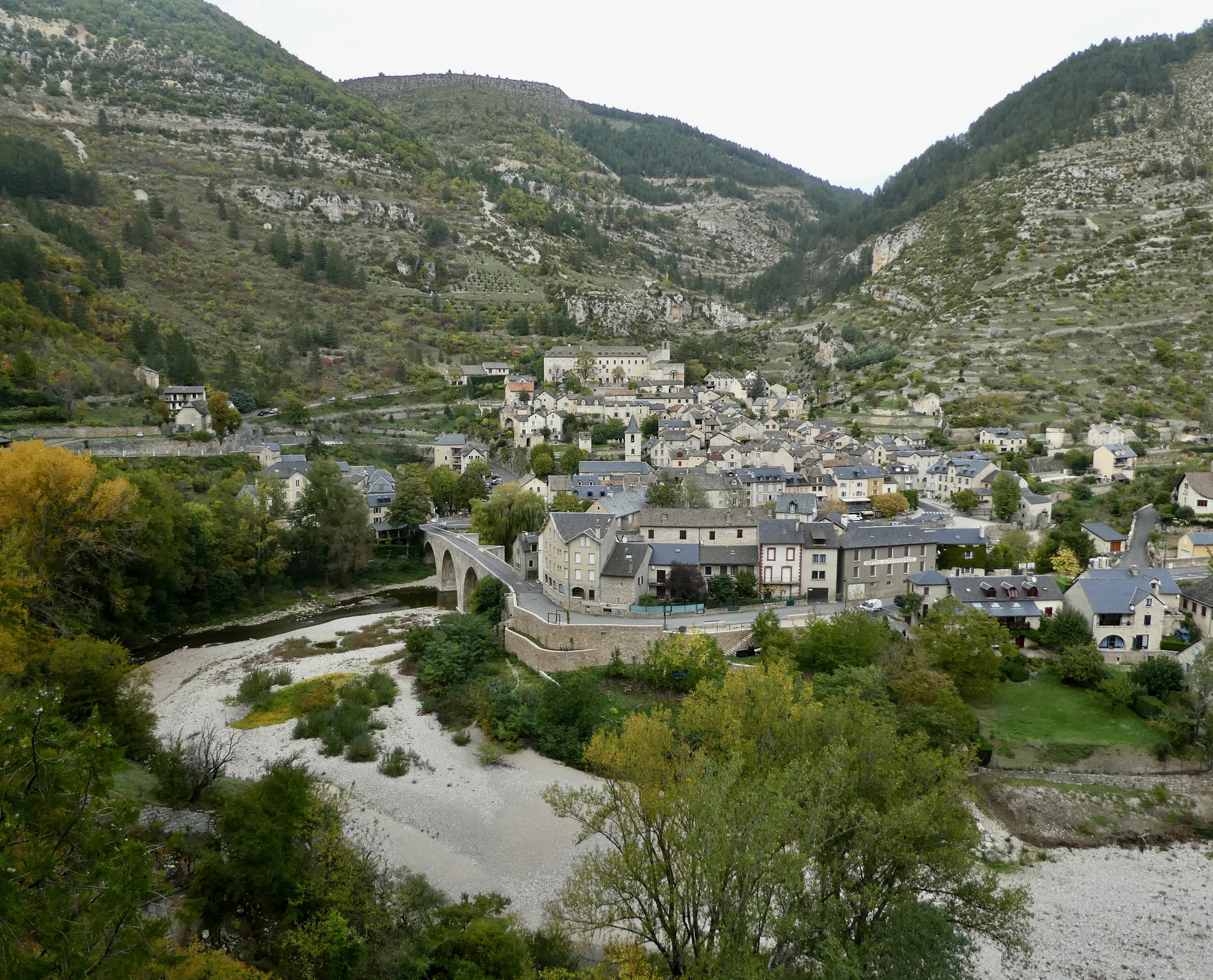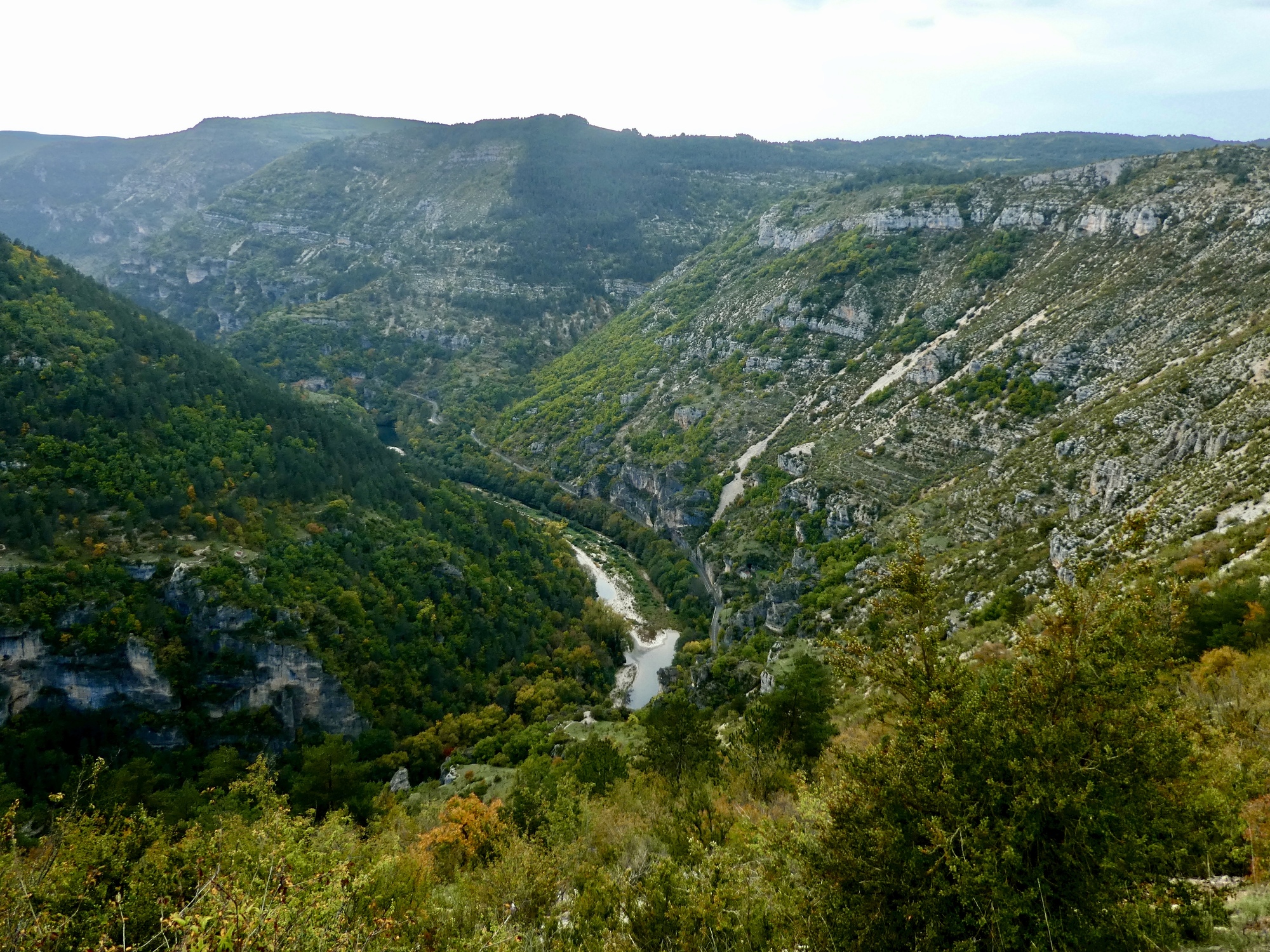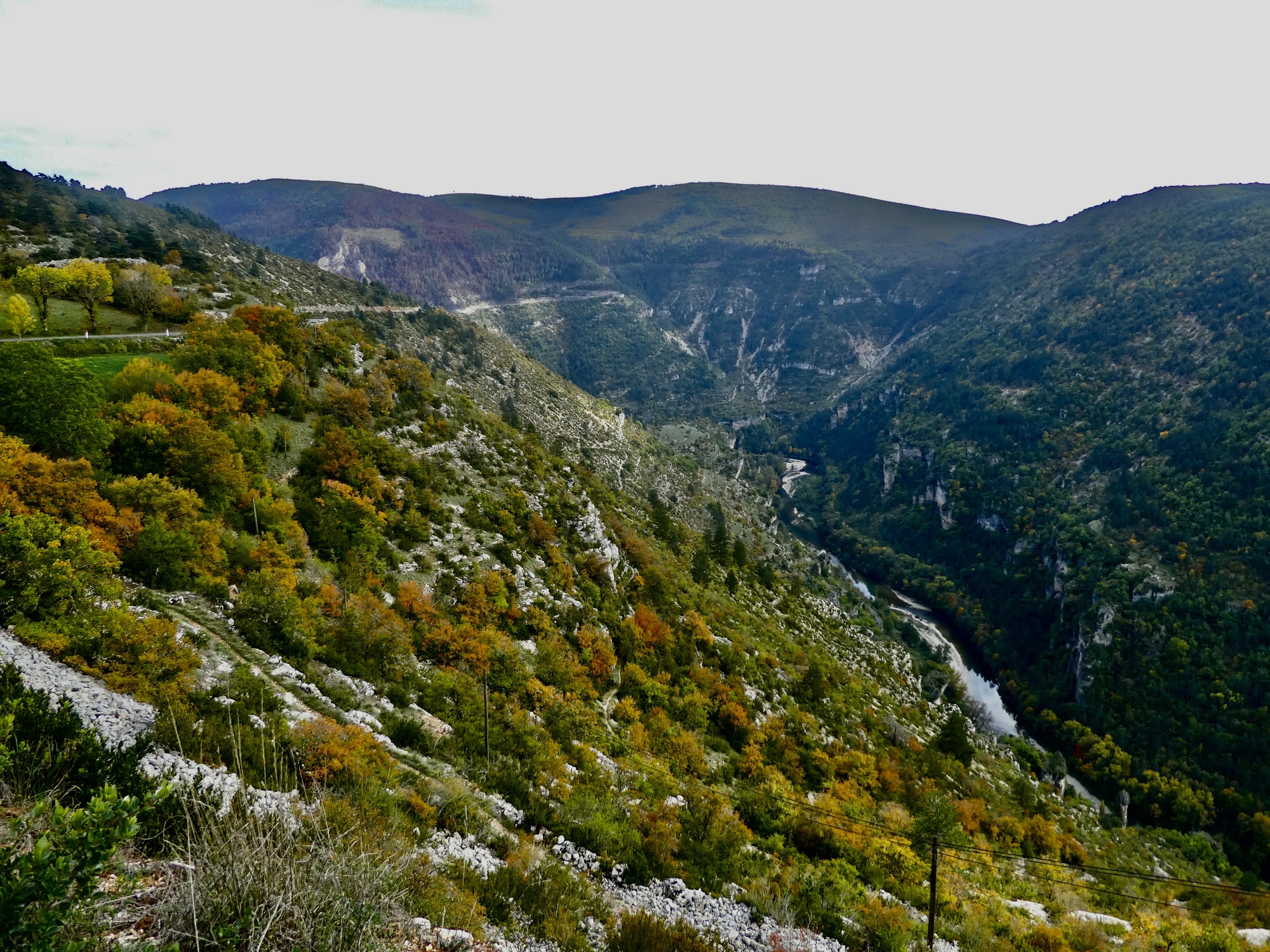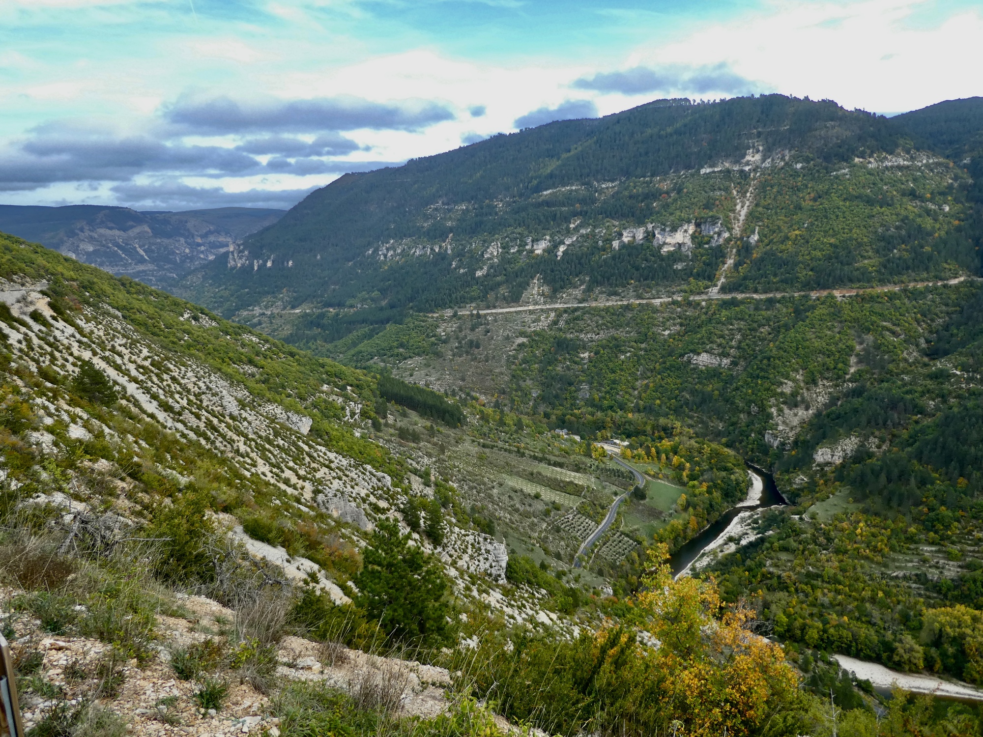 Descending to the Tarn. The road angling up the opposite slope climbs up to the Causse Méjean. If I’m lucky with weather I’ll bike up there tomorrow for a look from the other side.