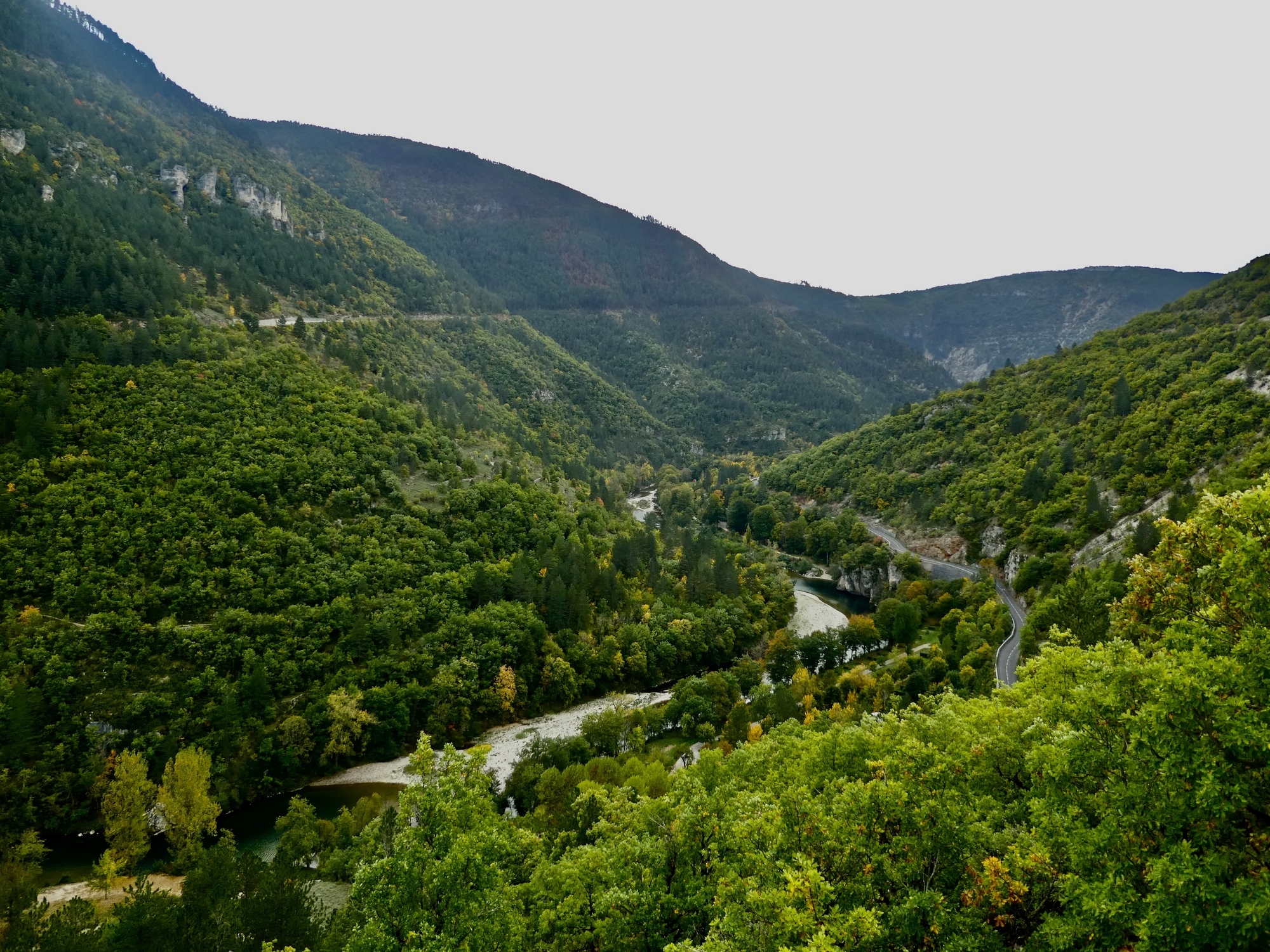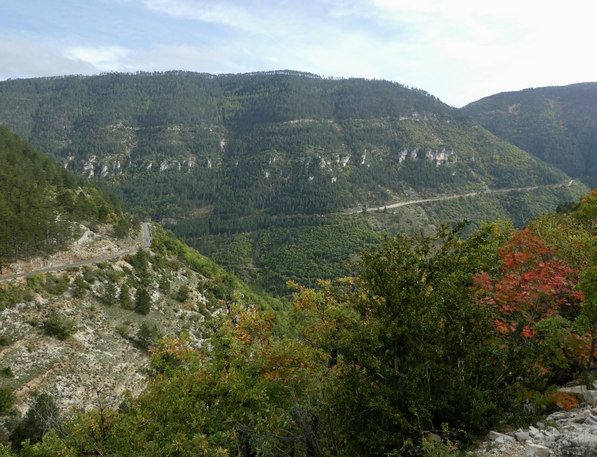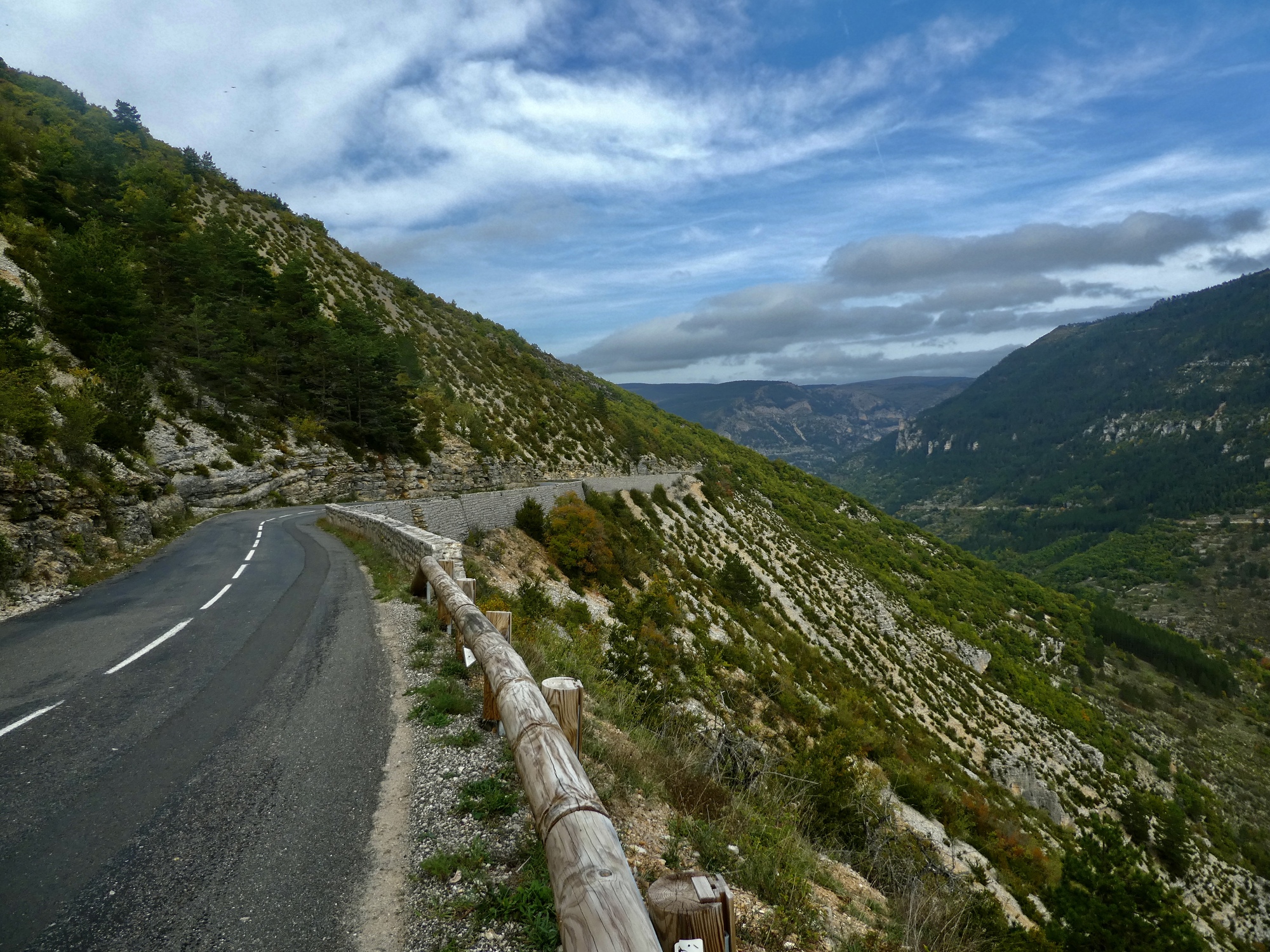 Descending to the Tarn. The road angling up the opposite slope climbs up to the Causse Méjean. If I’m lucky with weather I’ll bike up there tomorrow for a look from the other side.