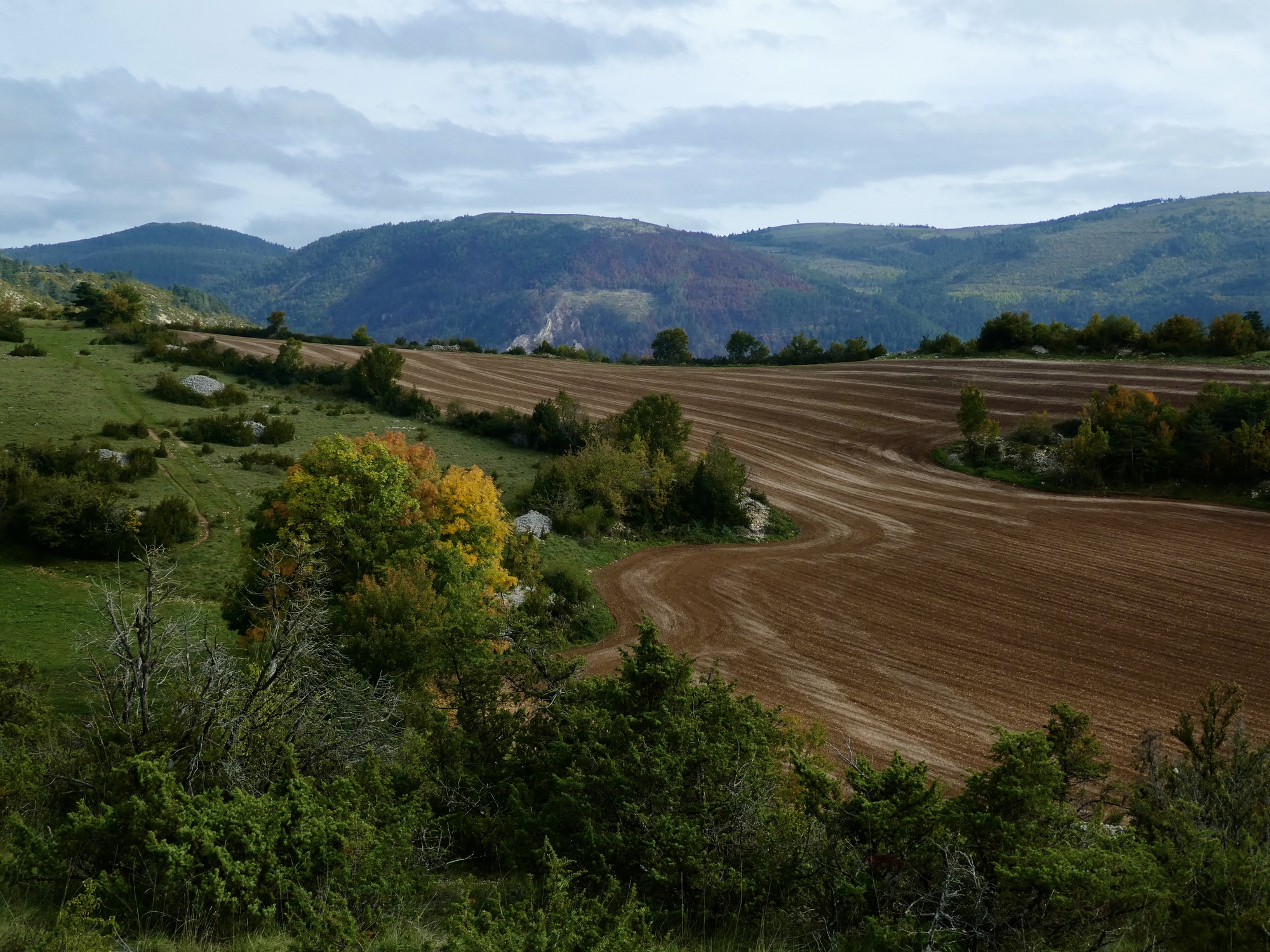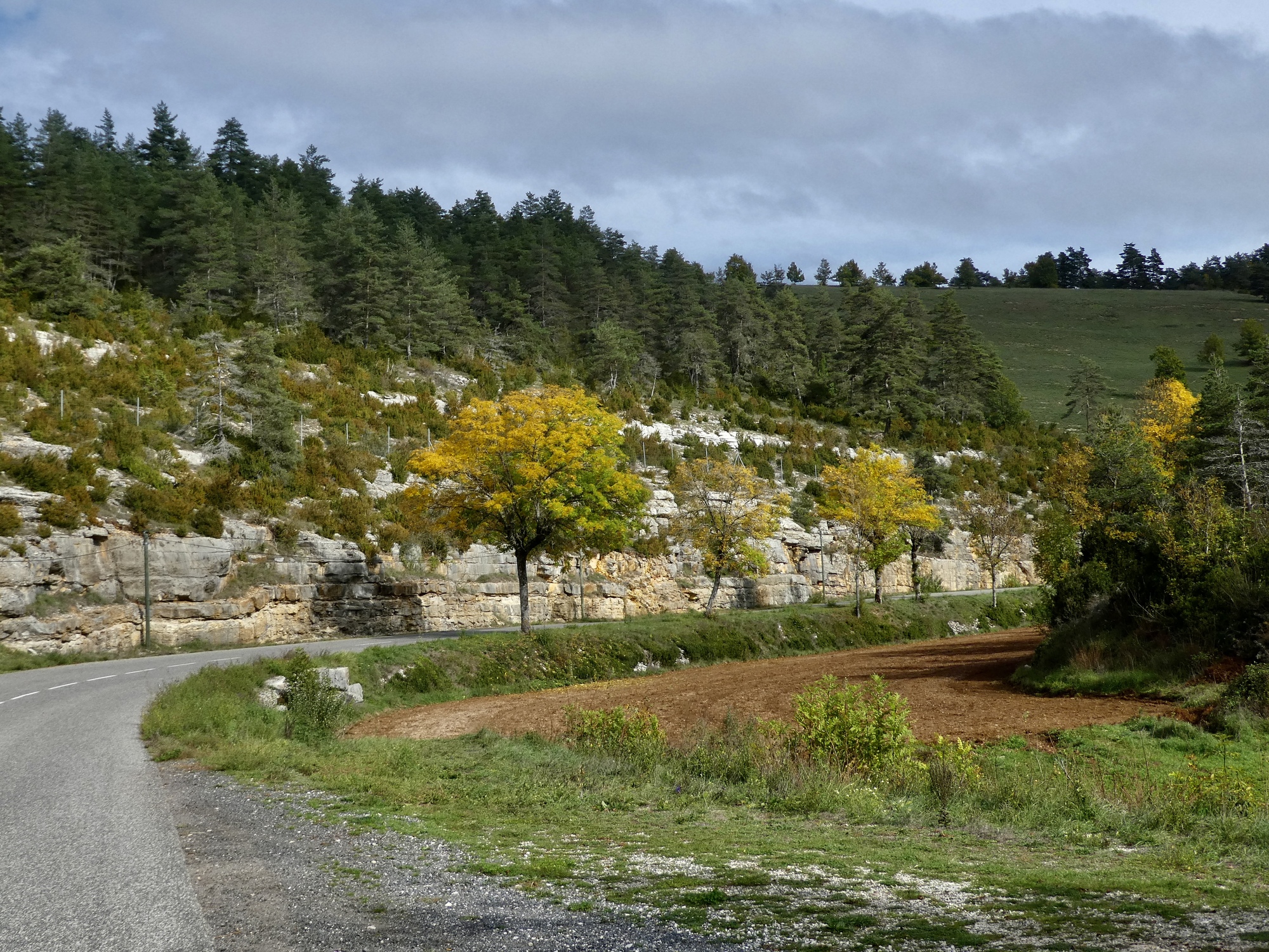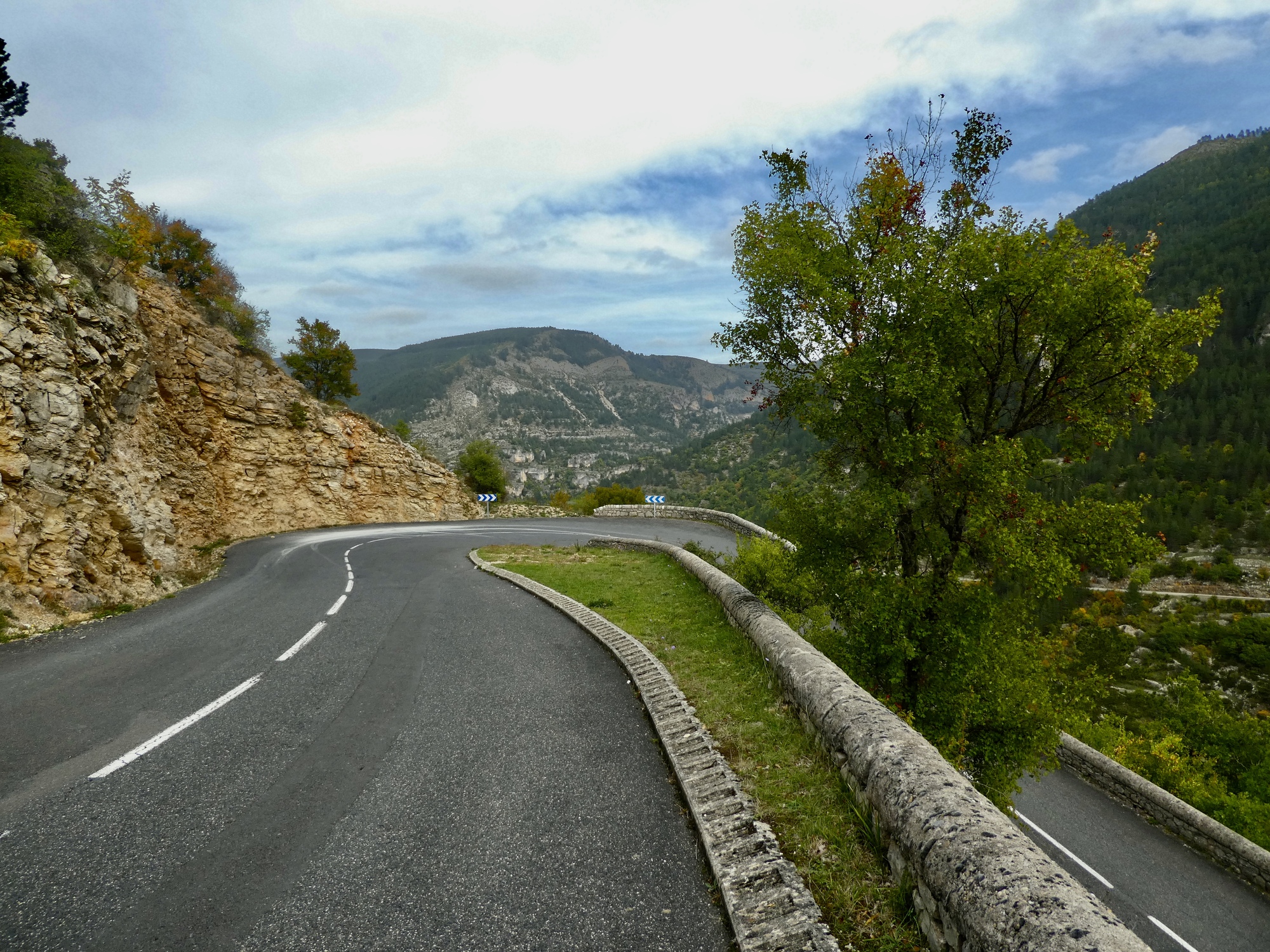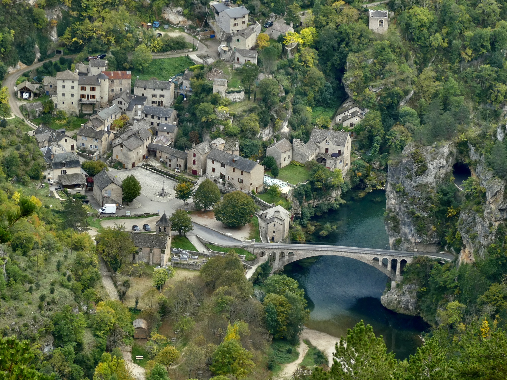 Descending to the Tarn. The road angling up the opposite slope climbs up to the Causse Méjean. If I’m lucky with weather I’ll bike up there tomorrow for a look from the other side.