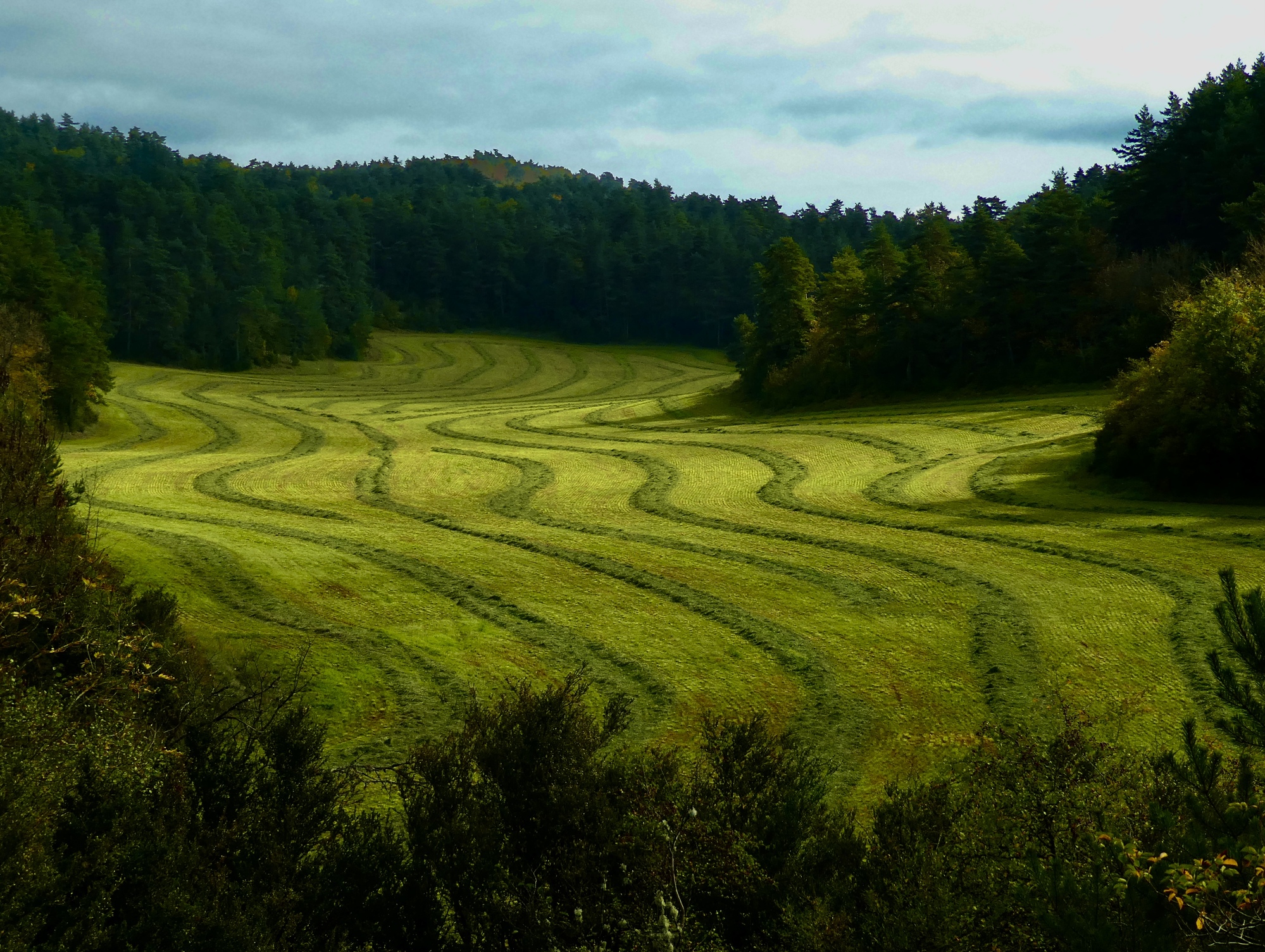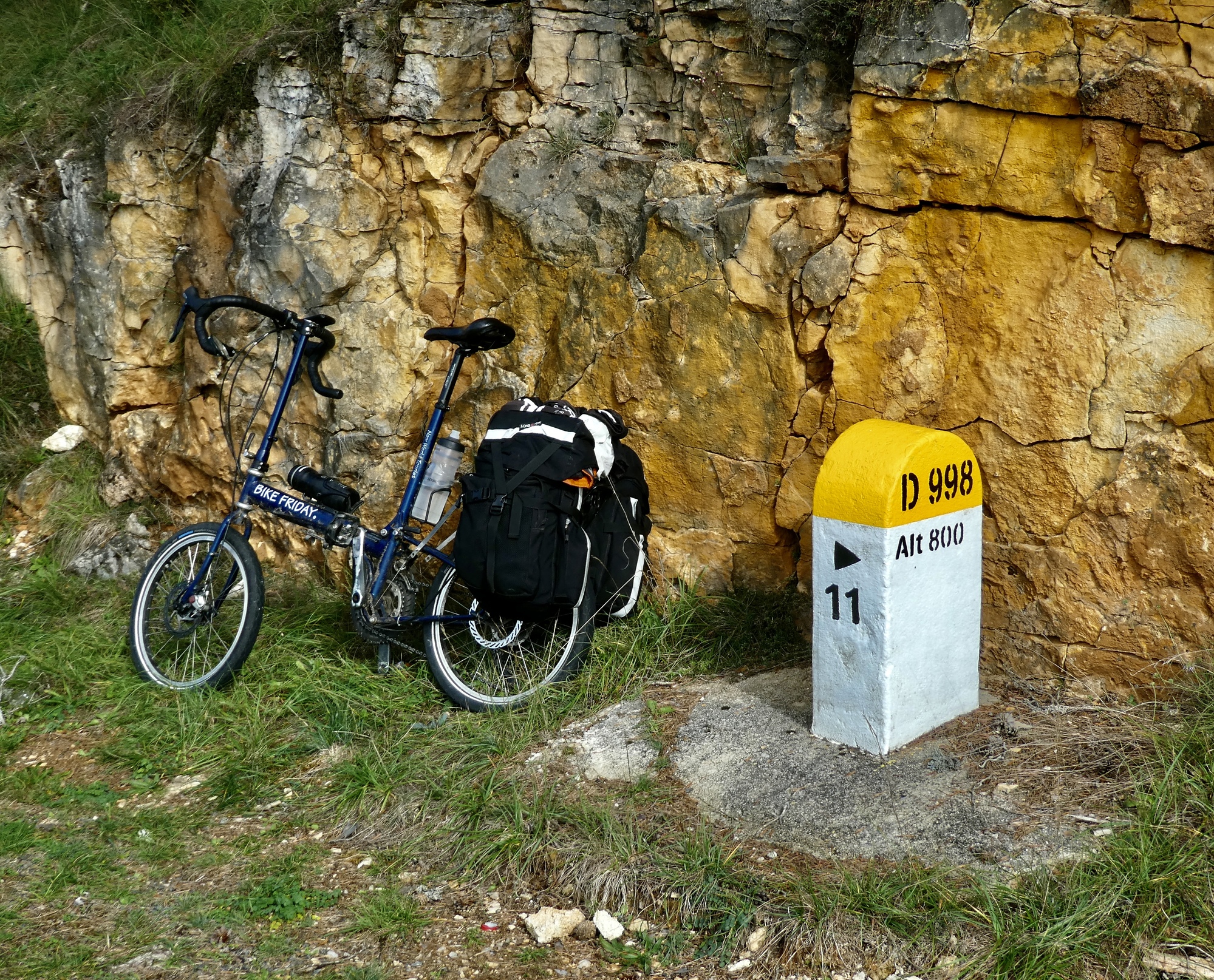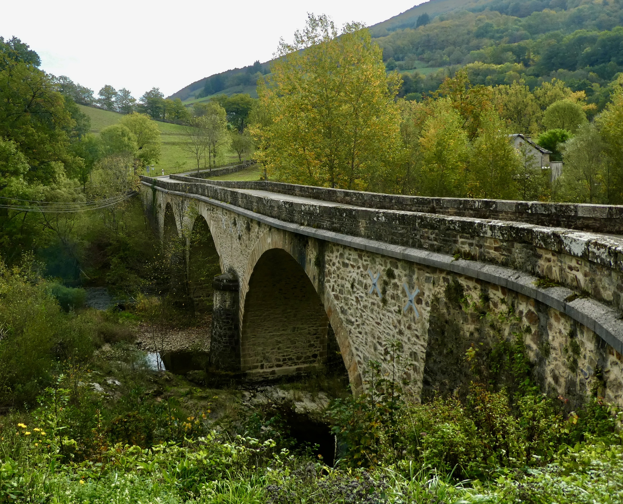 At Banassac we cross the Lot for the final time, stop at a picnic bench for lunch, and then start climbing. We’ve been anticipating this ascent ever since we started biking up the Lot, crossing the high divide between it and the Tarn; but in fact it’s no big deal at all as it takes eight miles to climb 1,200 feet, never steeply enough to bring much grief to the team. That first short climb at the start of the day was much worse.
