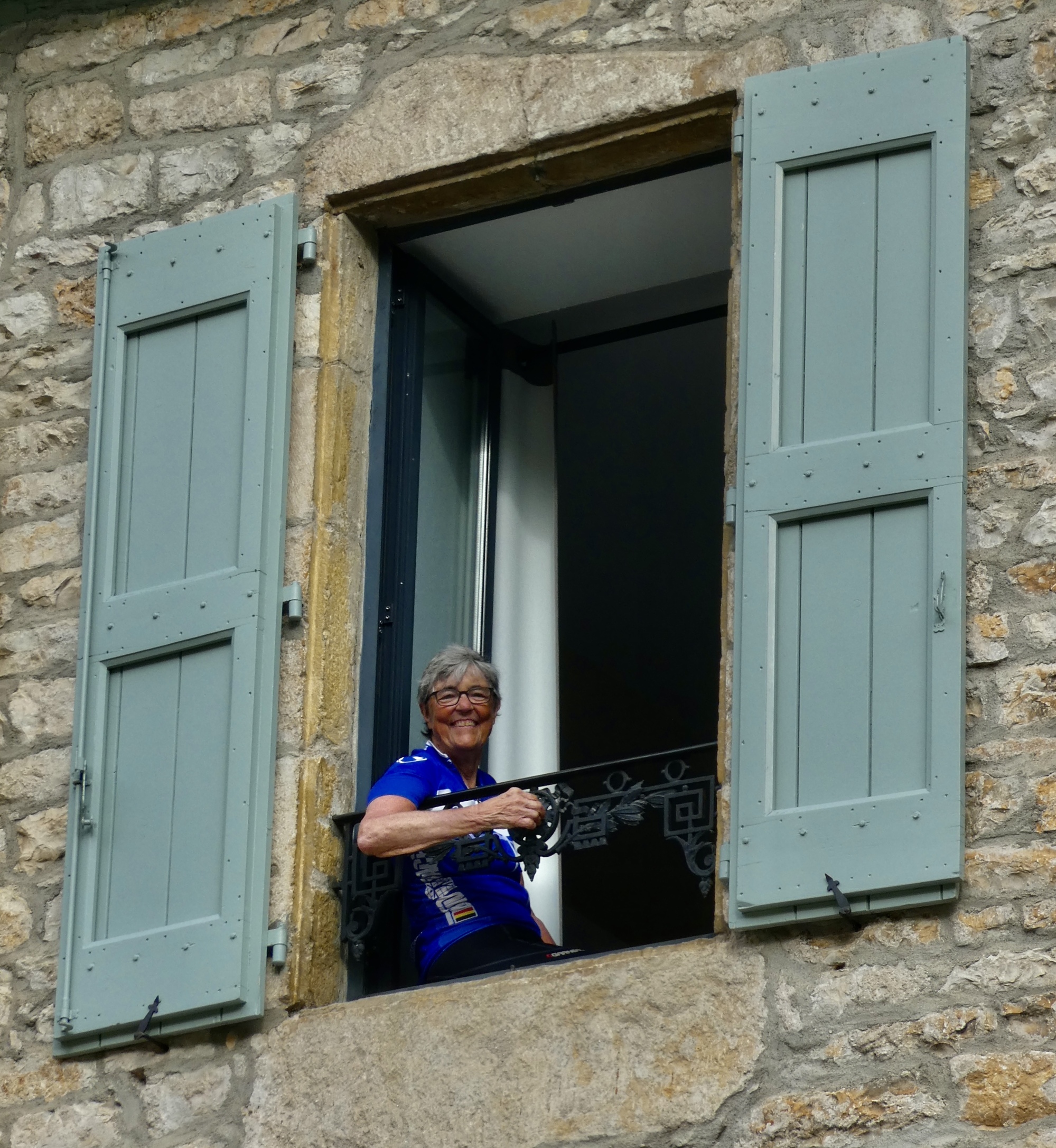 We told Susan we’d arrive at the hotel some time between 3 and 4 - oh, did I forget to mention we’re meeting up with Susan again, arriving on her way up the Tarn from Albi? - but it’s nearly 4 when we finally pull in because it takes nearly a half hour to coast the last five miles downhill. When I finally arrive Rachael’s already been here for a few minutes, and Susan’s been in long enough that she’s already checked into her room and is waving out her window as I round the bend.