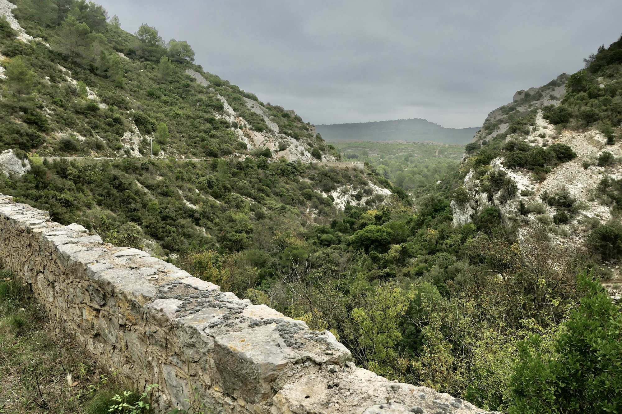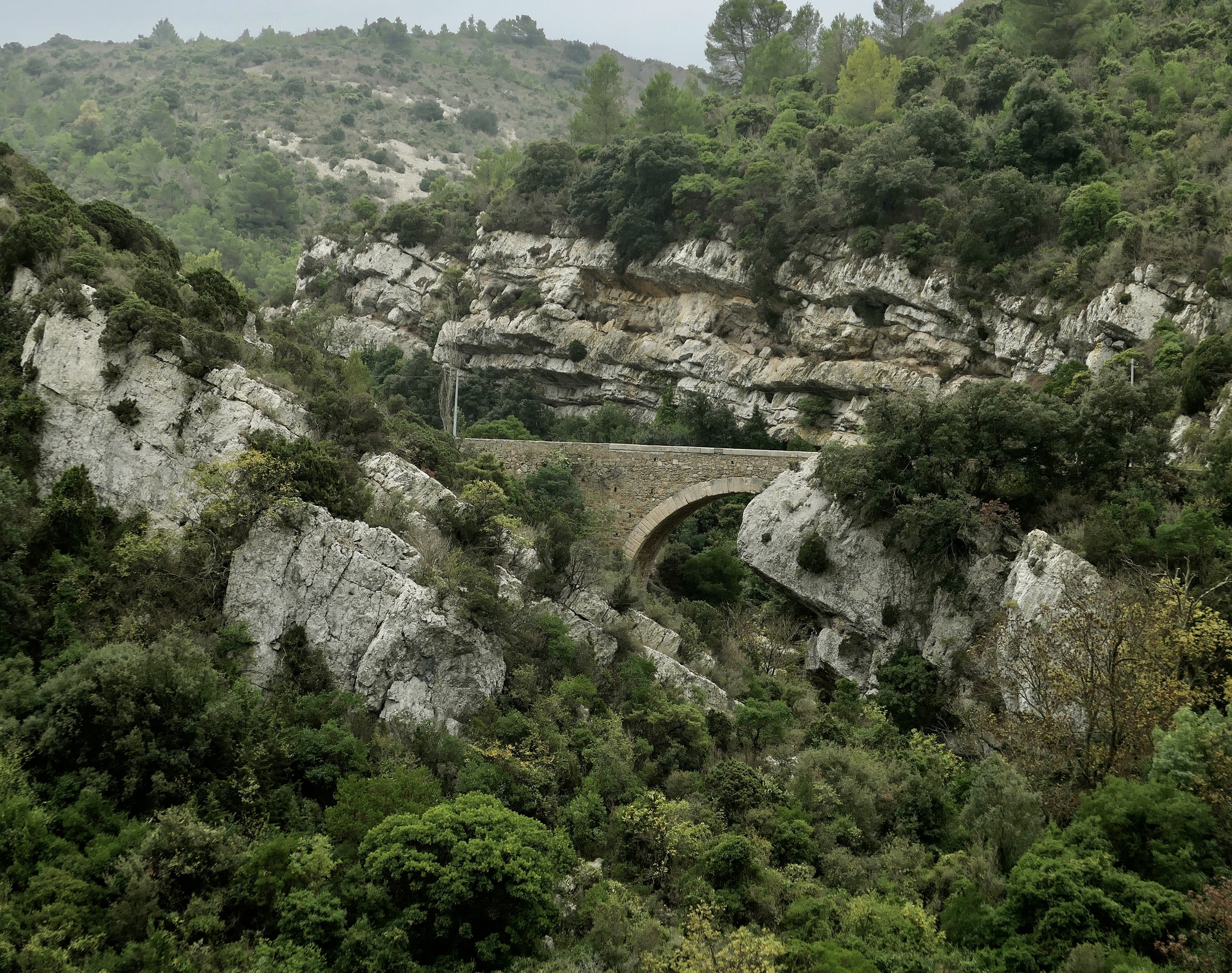Rachael of course crosses the top of the last of the three ridges before me but I quickly catch up on the descent when I find her stopped by the side of the road staring down into a rocky ravine with a thin stream trickling through it. We don’t really know what this place is yet, but it takes us fifteen or twenty minutes to descend the next half mile because we keep stopping to look at the short but dramatic gorge we’re dropping through from a new angle.
