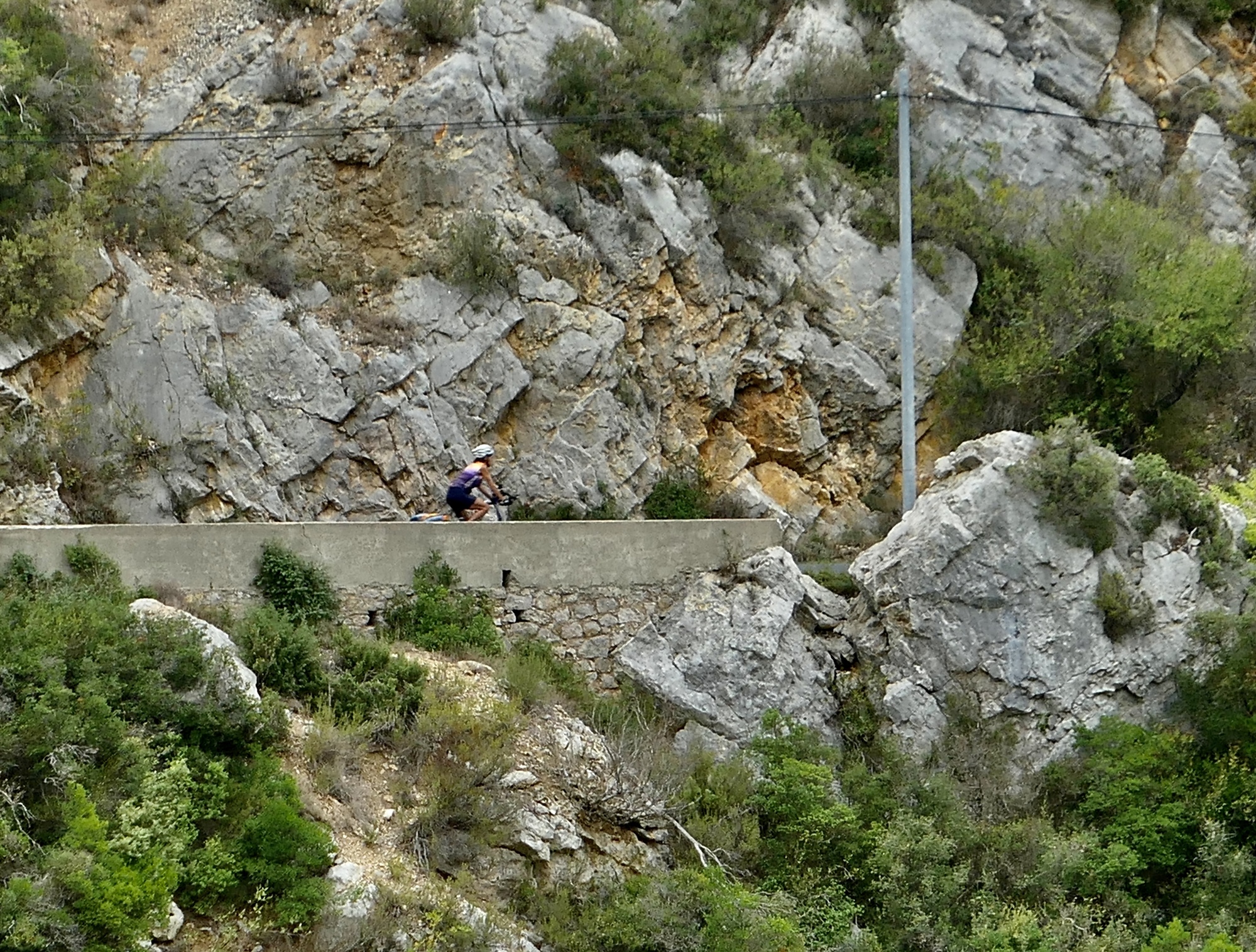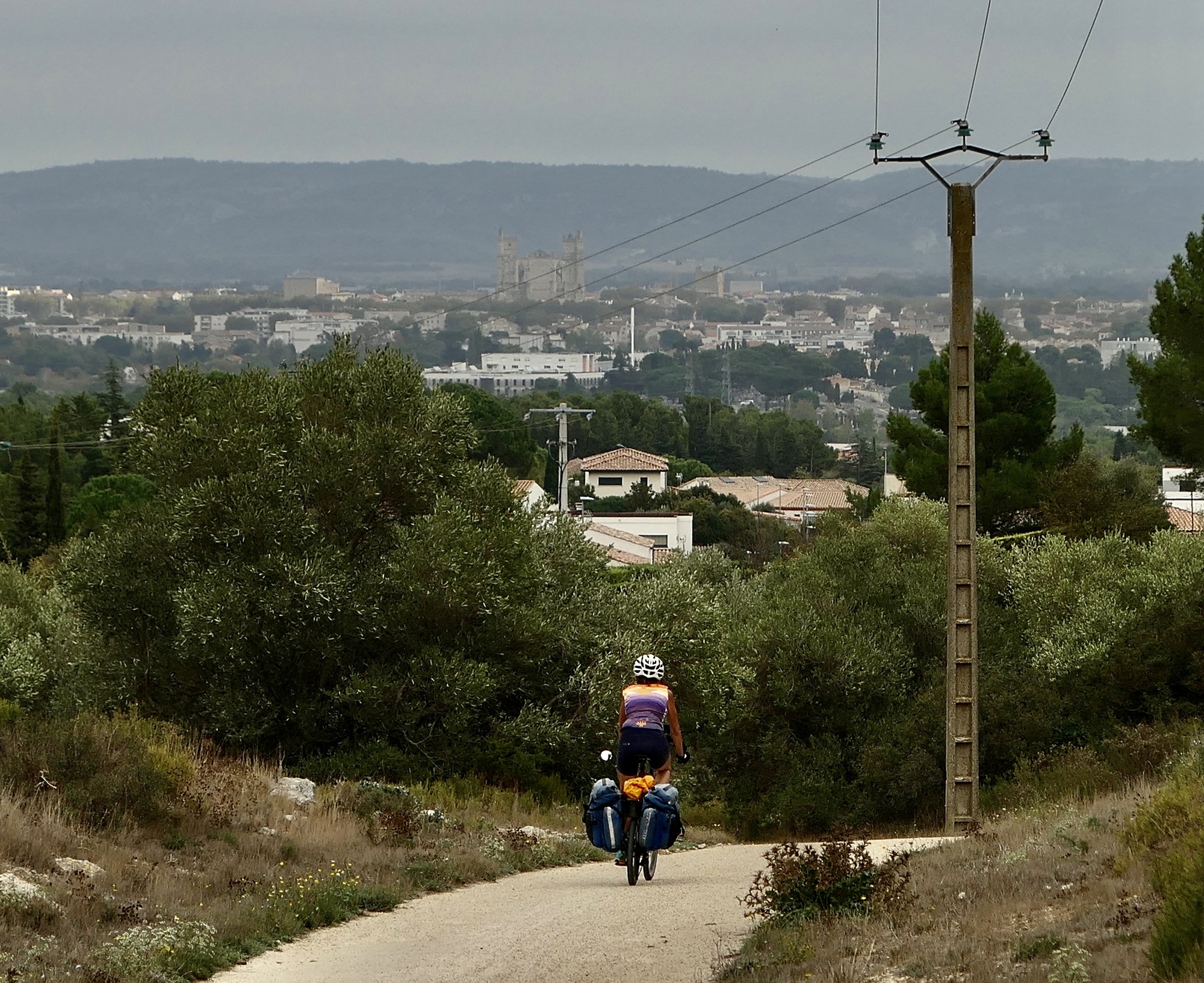 It’s stiff and sore and the bandage is a hindrance to biking smoothly, but it’s thankfully not a barrier to continuing the ride; and it’s also a blessing that the bike came through unscathed. We stop for lunch at the first village we come to, Saint-André-de-Roquelongue and then ride the rest of the way to the outskirts of Narbonne without incident. Lucky.
