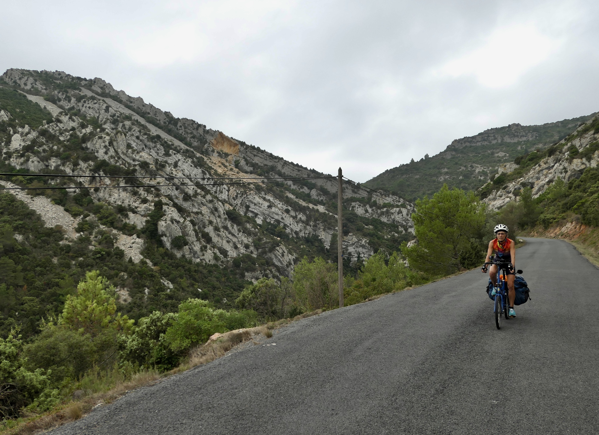 “We’re really on the road less traveled!” I hear an enthusiastic voice call out from behind me as we’re briefly on a poorly maintained, semi-paved shortcut lopping off the end of a triangle near Montséret. Then, literally only seconds later: a dull whump, immediately followed by a call for help. She’s hit a patch of gravel and gone down, painfully from the sound of it.