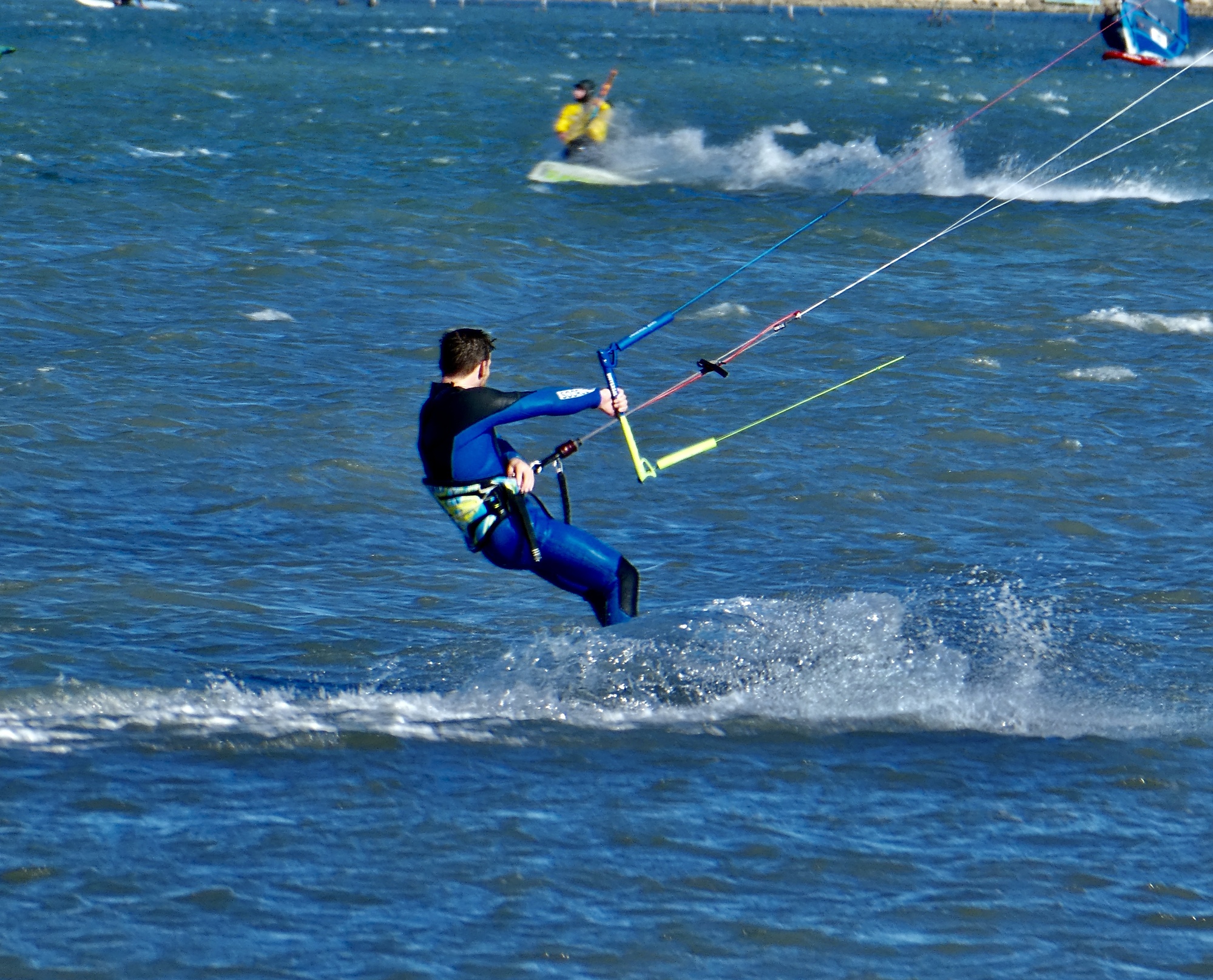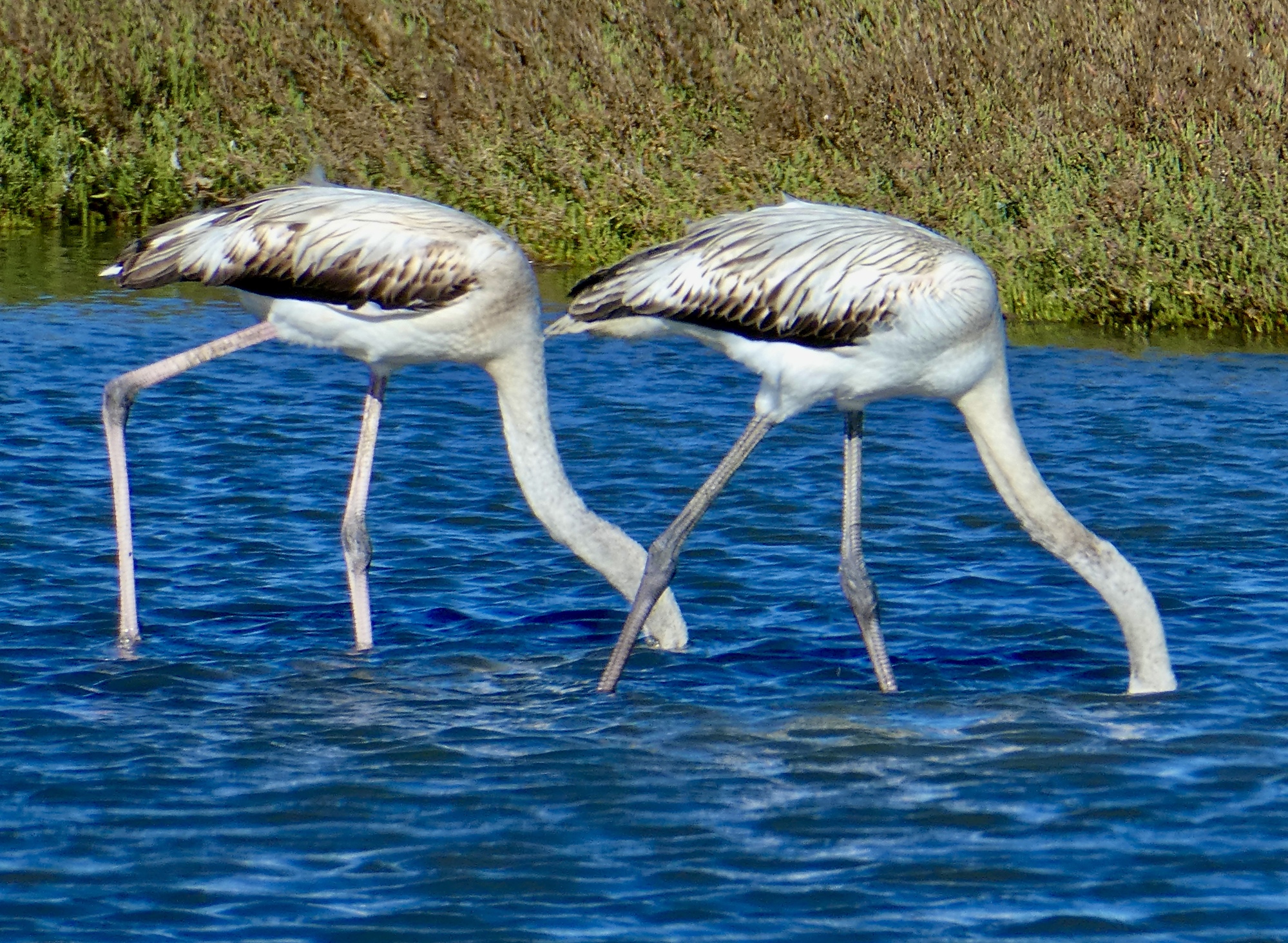 It’s almost totally flat the whole way, but there’s plenty to keep it interesting and catch your attention - the long, unbroken lines of boats lining the canals, and the chance to see a flamingo or a thousand as we do today. And today, on a fine Saturday with this huge wind, there’s the amazing sight of hundreds of sailboarders and kite surfers flying across the water near Frontignan. I don’t remember seeing such a concentration of them anywhere before, and they really are flying - racing fast enough to cut big wakes in the water and sometimes going airborne for five or ten seconds. It all looks quite chaotic, and it’s a wonder they stay out of each others’ way.