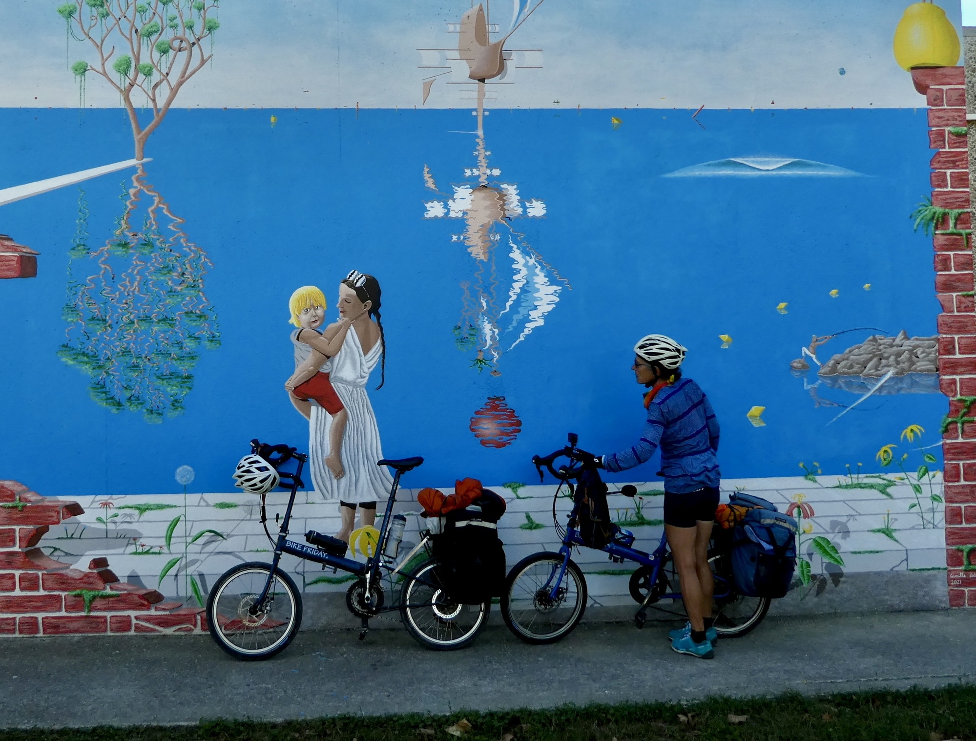 It takes about two miles before we’re out of the city and biking east on a bike path alongside the Rhone-Sète Canal, which we’ll roughly follow all the way to Aigues-Mortes. once we’re out it’s an excellent ride on a good bike lane most of the way, often right alongside either the canal or one of the contiguous string of large lagoons that extends for fifty miles along the coast, all the way from Agde to Aigues-Mortes. We rode this stretch in the opposite direction five years ago and had a rougher time with the navigation then, so maybe there have been infrastructure improvements since then.