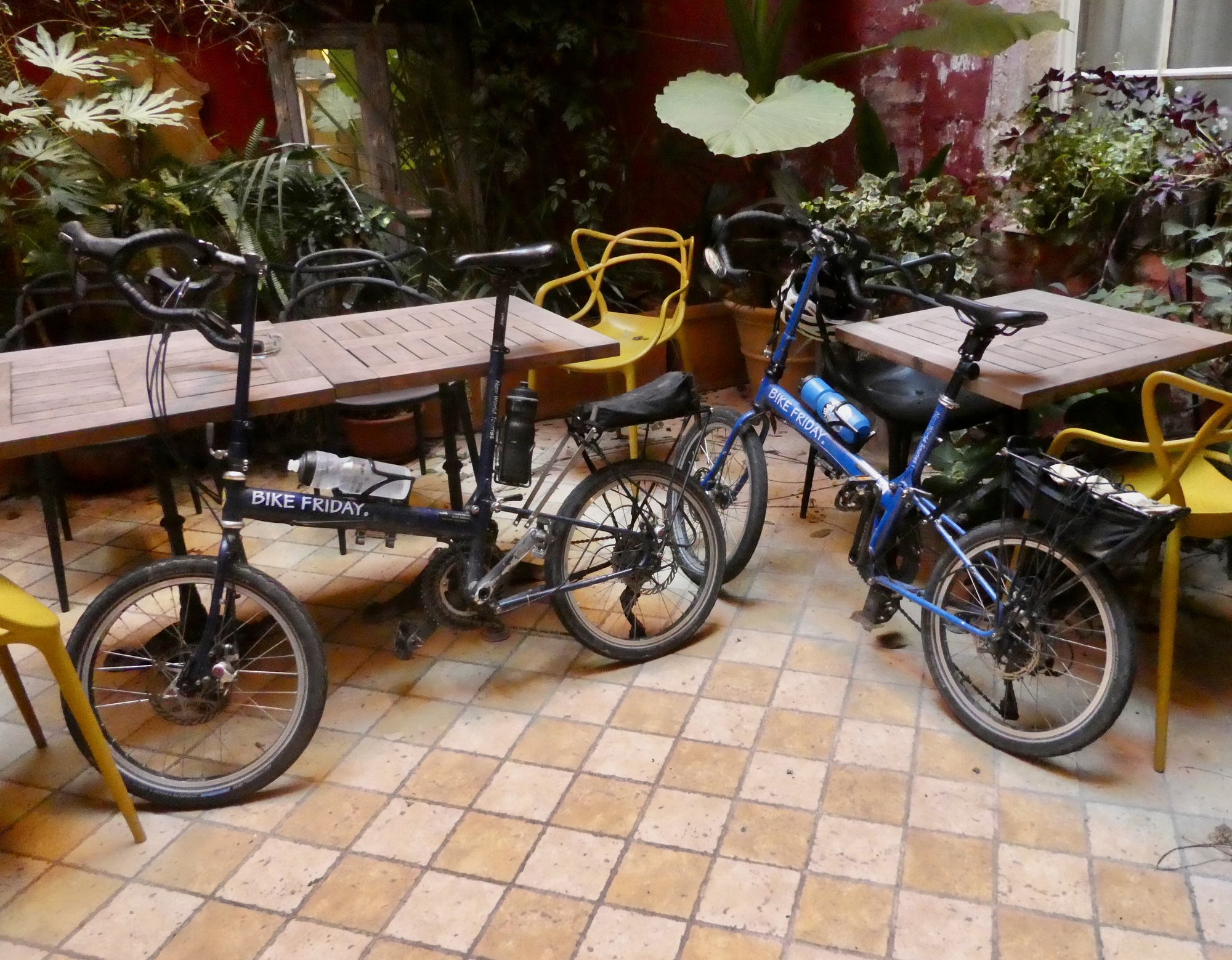 It’s a relief when we enter the atrium and see that our bikes are nearly dry. There was some amount of precipitation yesterday, but it’s nothing compared to what we envisioned when we rolled in.