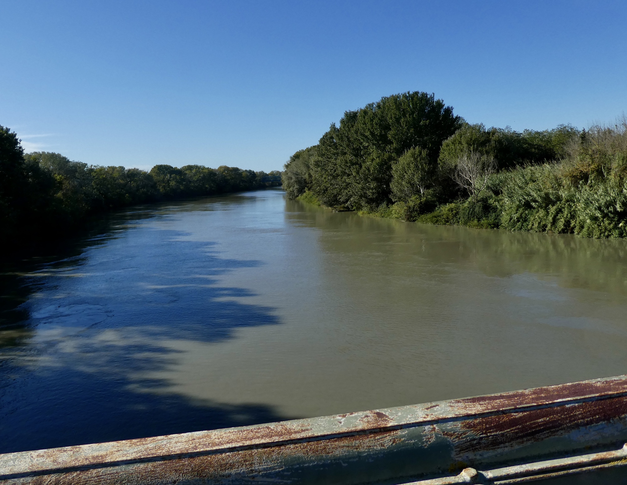 For the next twelve miles we bike pretty much straight north, up the wedge of land between the Rhone and Petit Rhone. These miles are an exact repeat of the end of our route to Tarascon in April. It is odd to bike the same road again, recognizing occasional landmarks and highlights here and there. It has a quite different feel today though, and isn’t quite as enjoyable. For one thing, it’s autumn rather than spring. Back then everything was bright and vibrant with the colors of spring. I was surprised to reread that post and be reminded of how colorful it all was then. For the other, we’re biking into a 15 to 20 mph headwind that keeps us head down grinding out the miles until we finally reach Beaucaire and the Rhone.