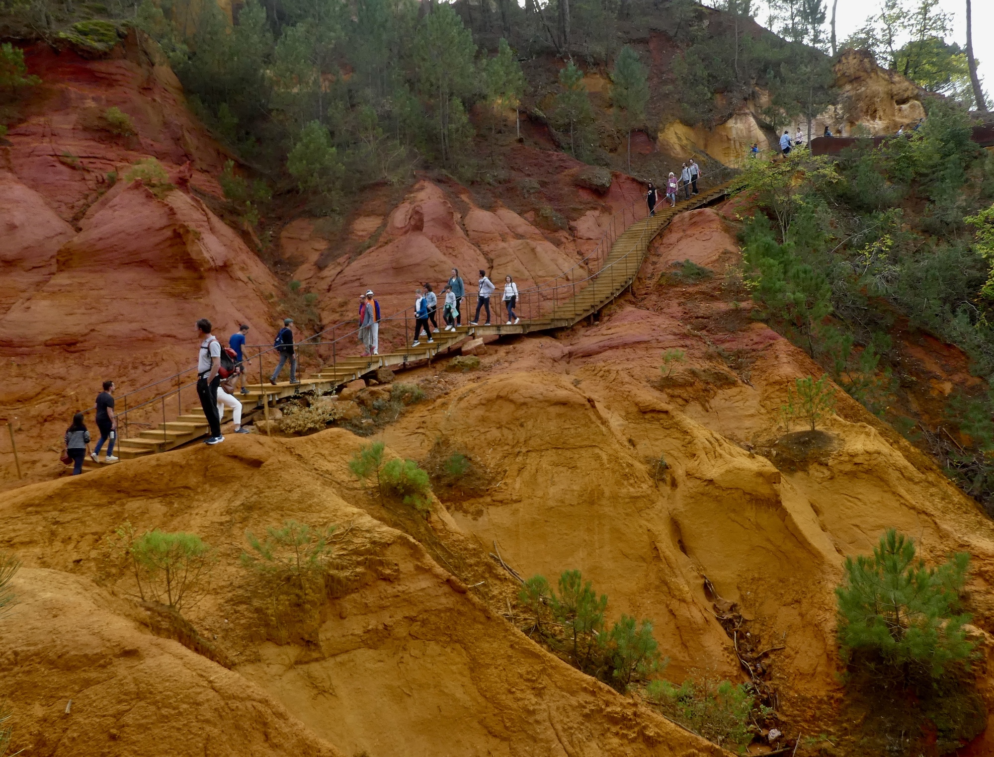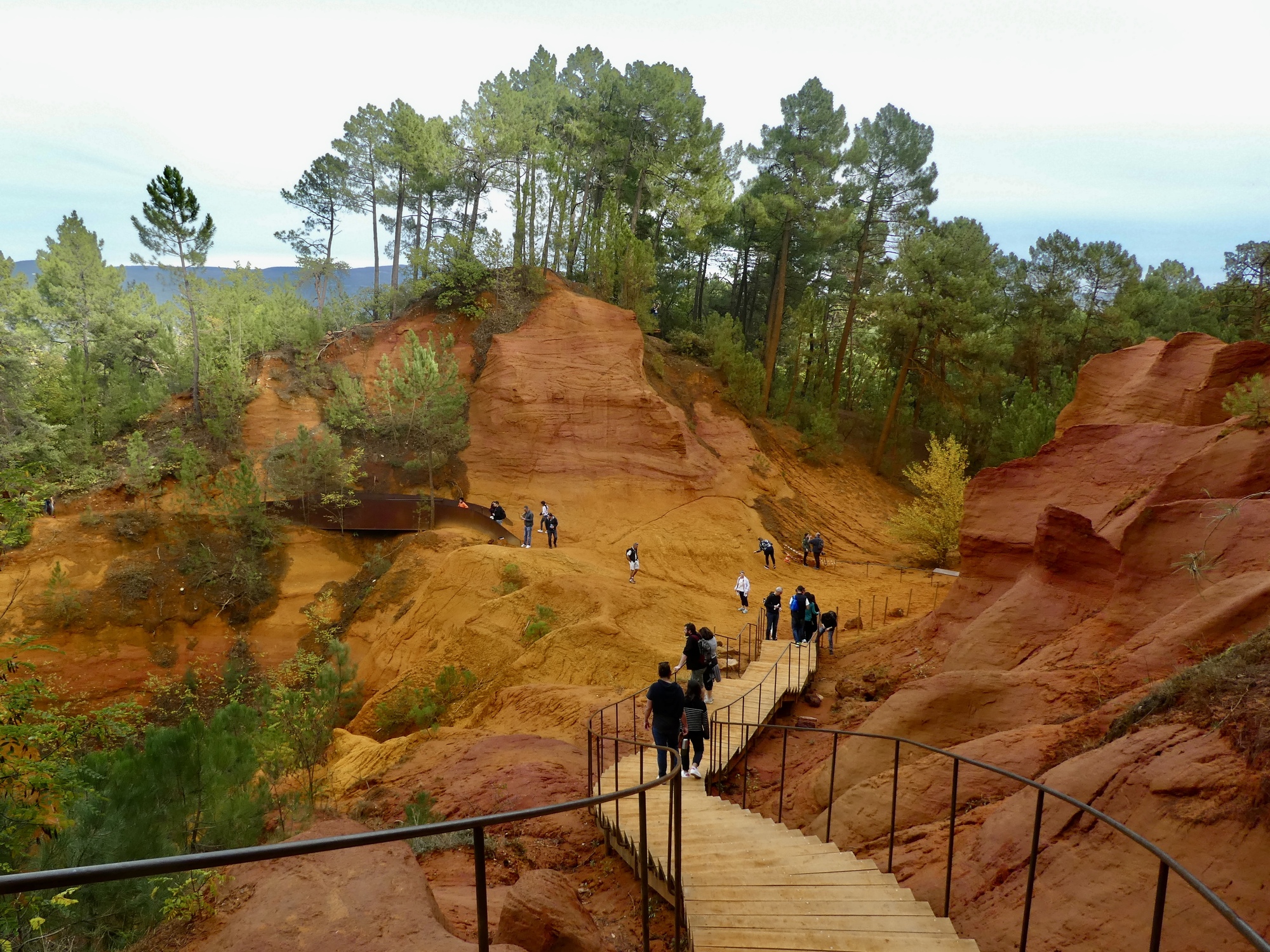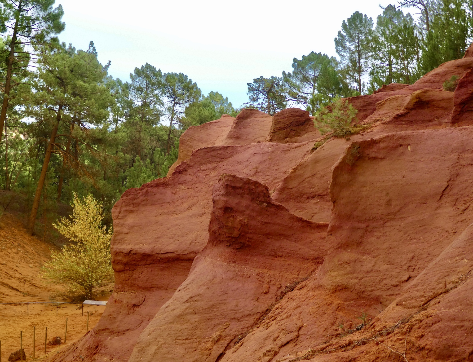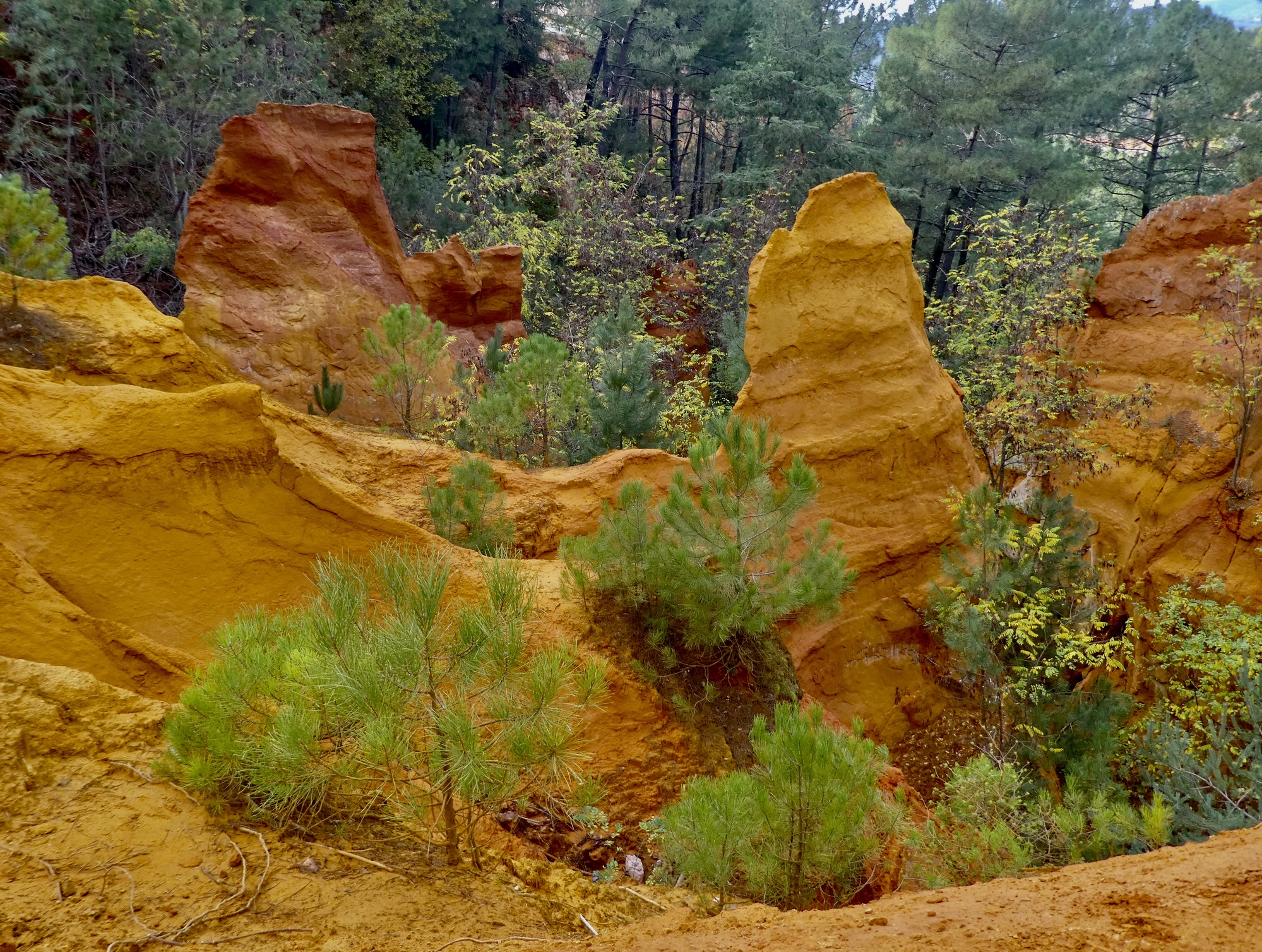 The village is great, but the big draw here is the Sentier des Ocres, the Ochre Trail. It begins just a few blocks from the center of the village. It’s an easy walk, and one that immediately pulls you in as you descend the staircase from the ticket window to a bowl surrounded by these wonderful red and orange and gold formations, offset by the dramatic green oaks and pines.