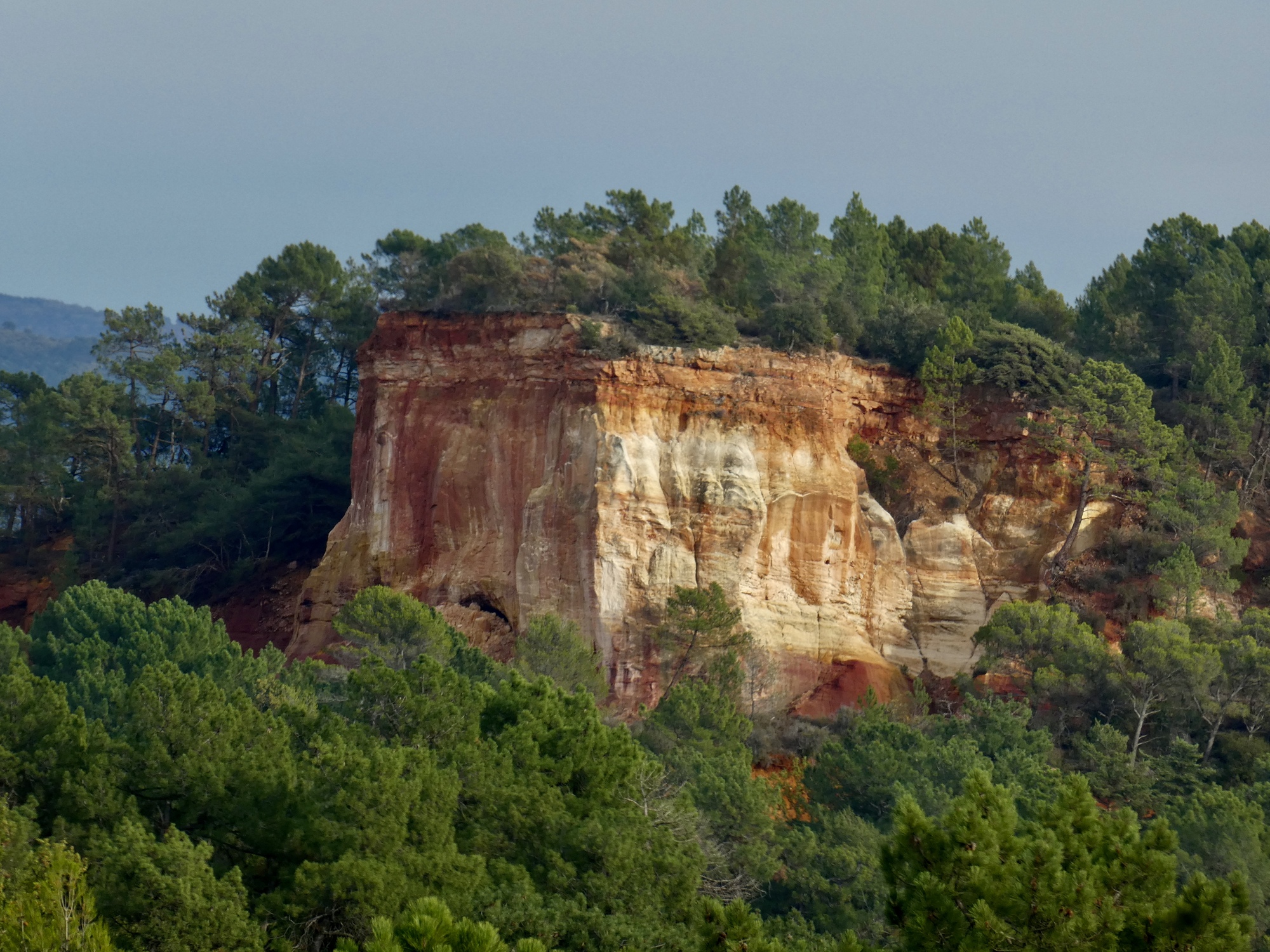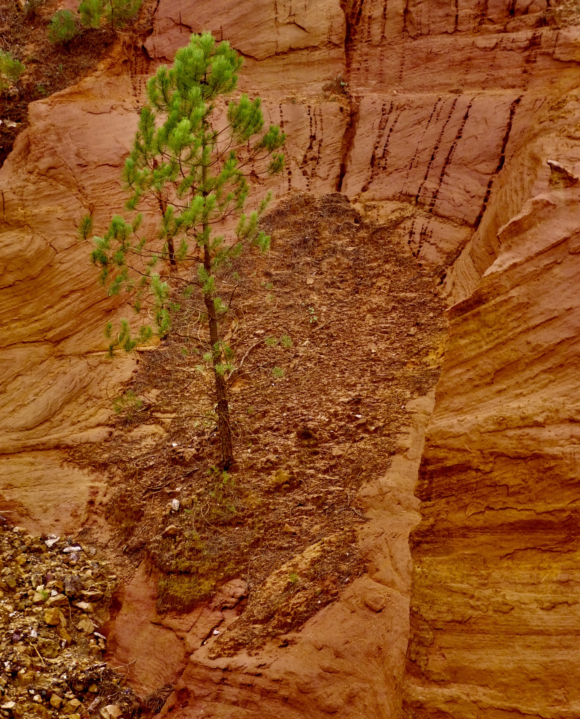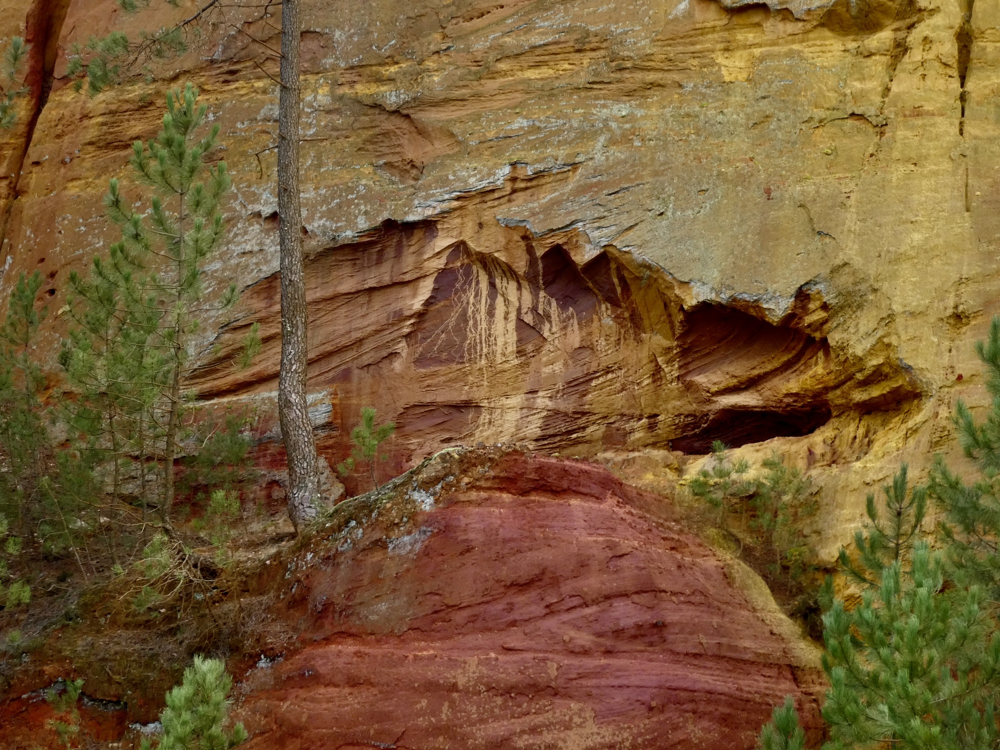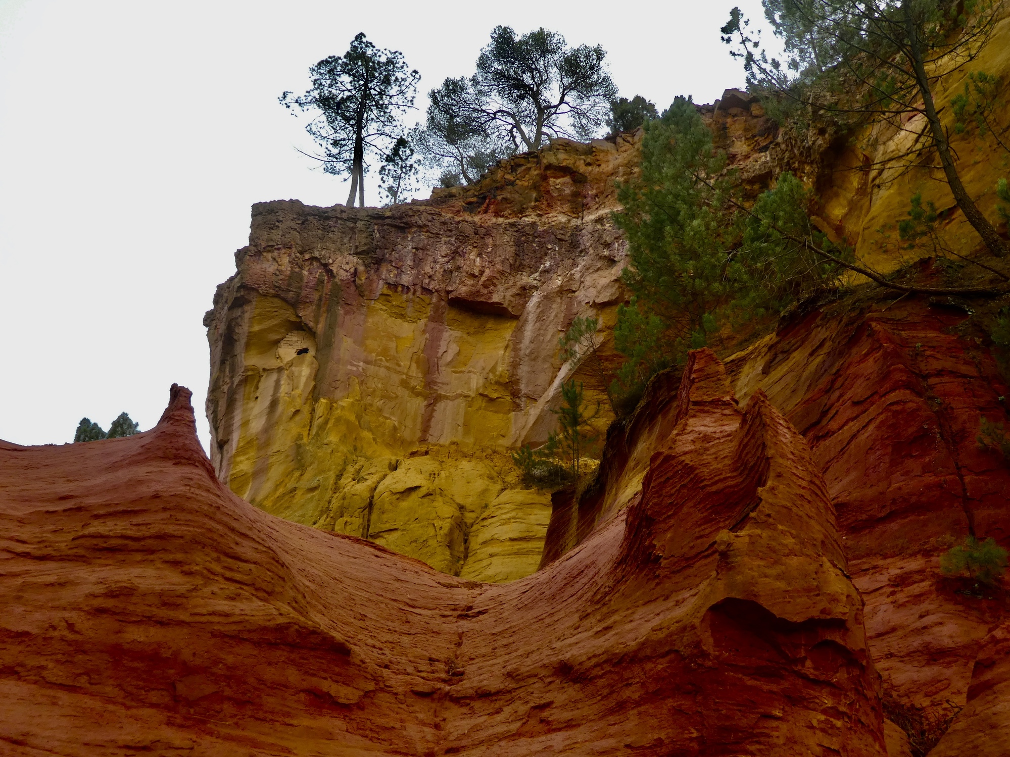 The village is great, but the big draw here is the Sentier des Ocres, the Ochre Trail. It begins just a few blocks from the center of the village. It’s an easy walk, and one that immediately pulls you in as you descend the staircase from the ticket window to a bowl surrounded by these wonderful red and orange and gold formations, offset by the dramatic green oaks and pines.