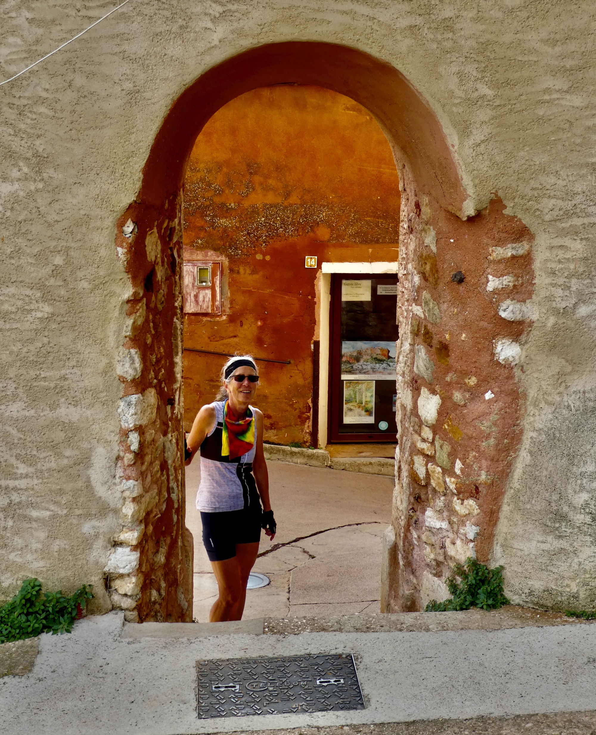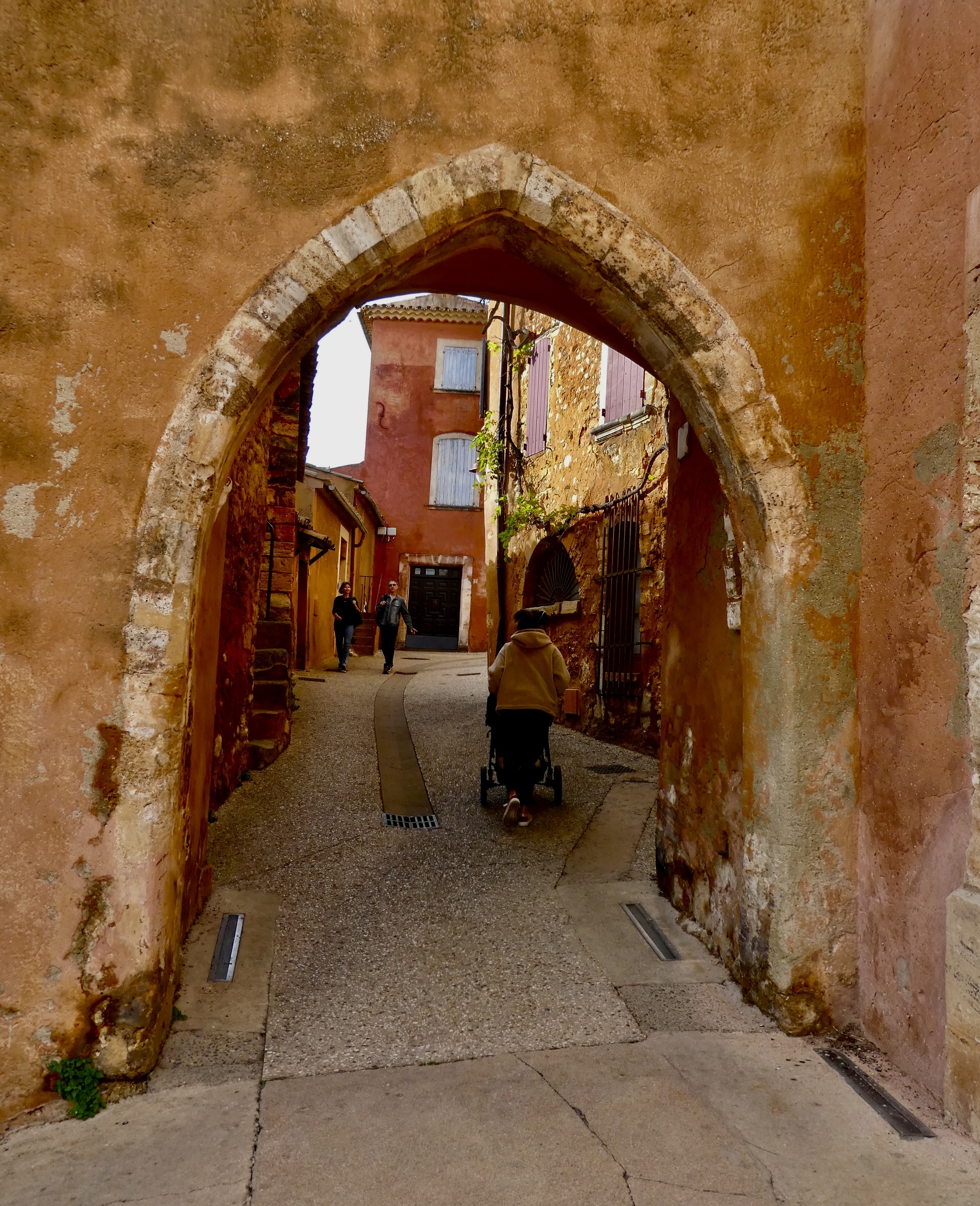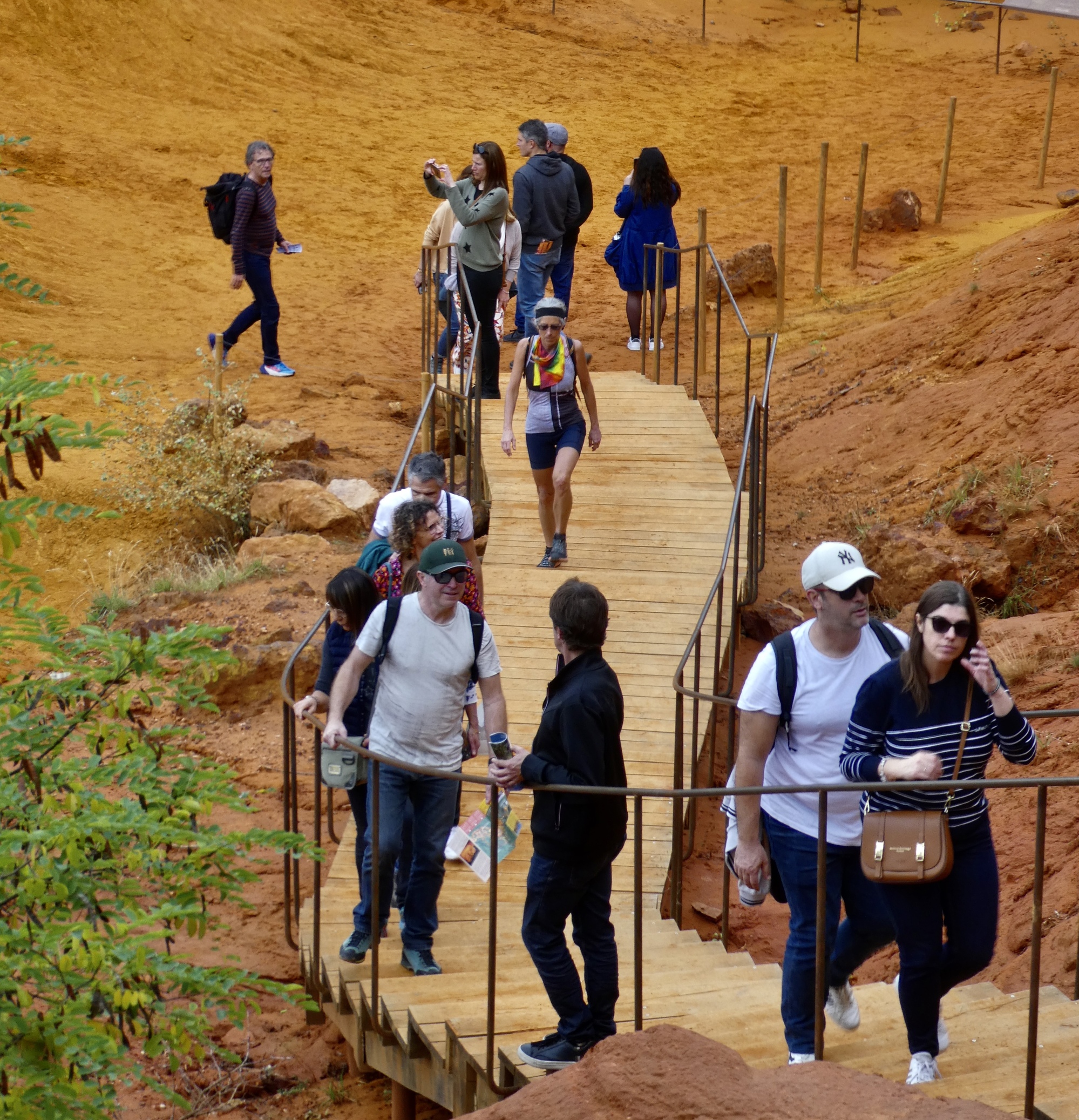 She’s not there. I turn around, flash my ticket at the agent as I pass the gate, and when I get back to the overlook I see her below, waving her arms at me. So that was interesting. We have a short discussion, reminding each other that it’s important to each carry a phone and to tell our partner we’re walking off. We vow to try to remember this if we make it back to Roussillon for a third visit in another decade or so, which could happen.