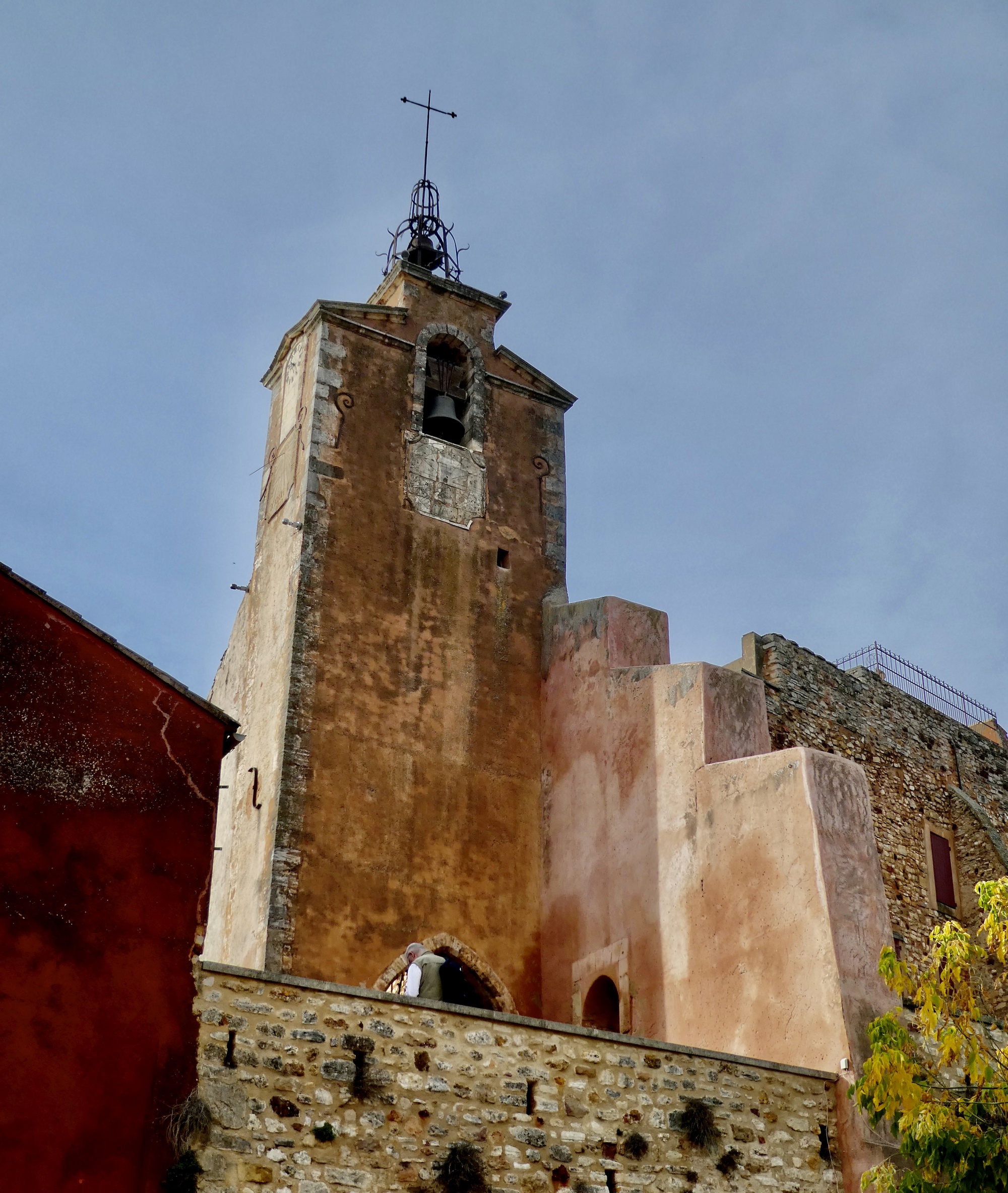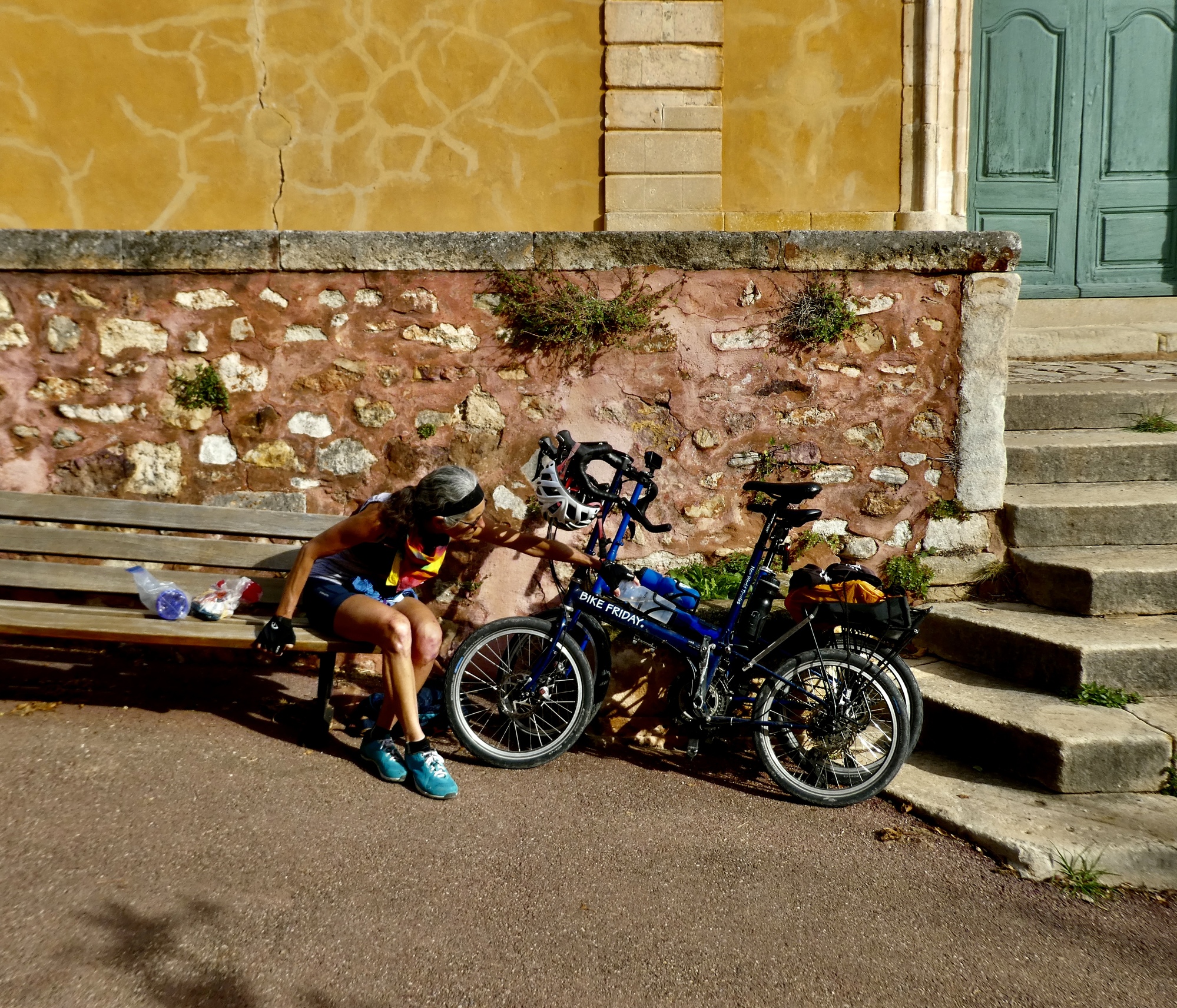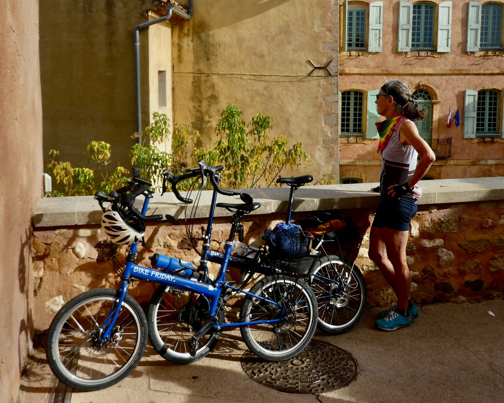 She’s not there. I turn around, flash my ticket at the agent as I pass the gate, and when I get back to the overlook I see her below, waving her arms at me. So that was interesting. We have a short discussion, reminding each other that it’s important to each carry a phone and to tell our partner we’re walking off. We vow to try to remember this if we make it back to Roussillon for a third visit in another decade or so, which could happen.