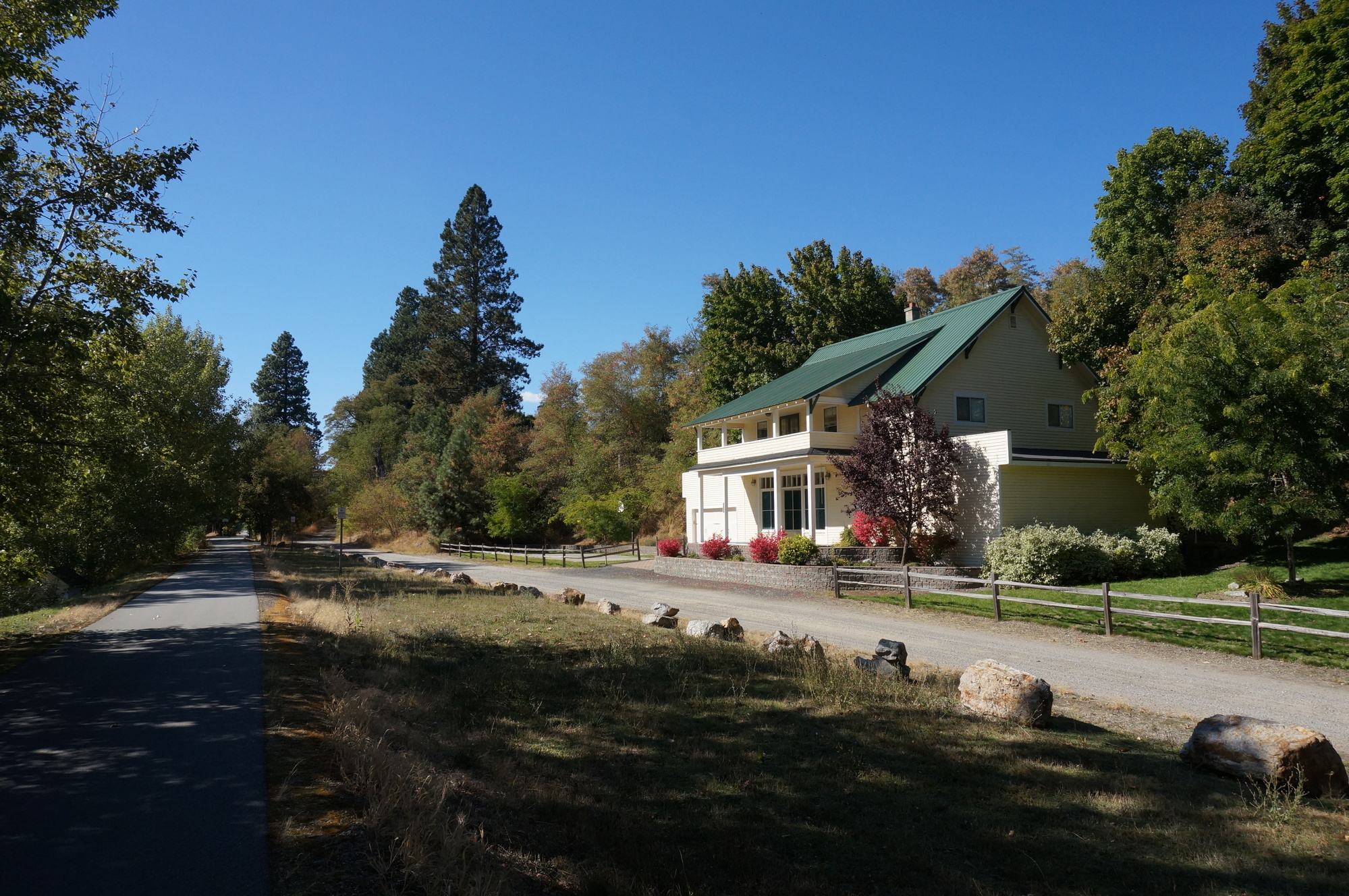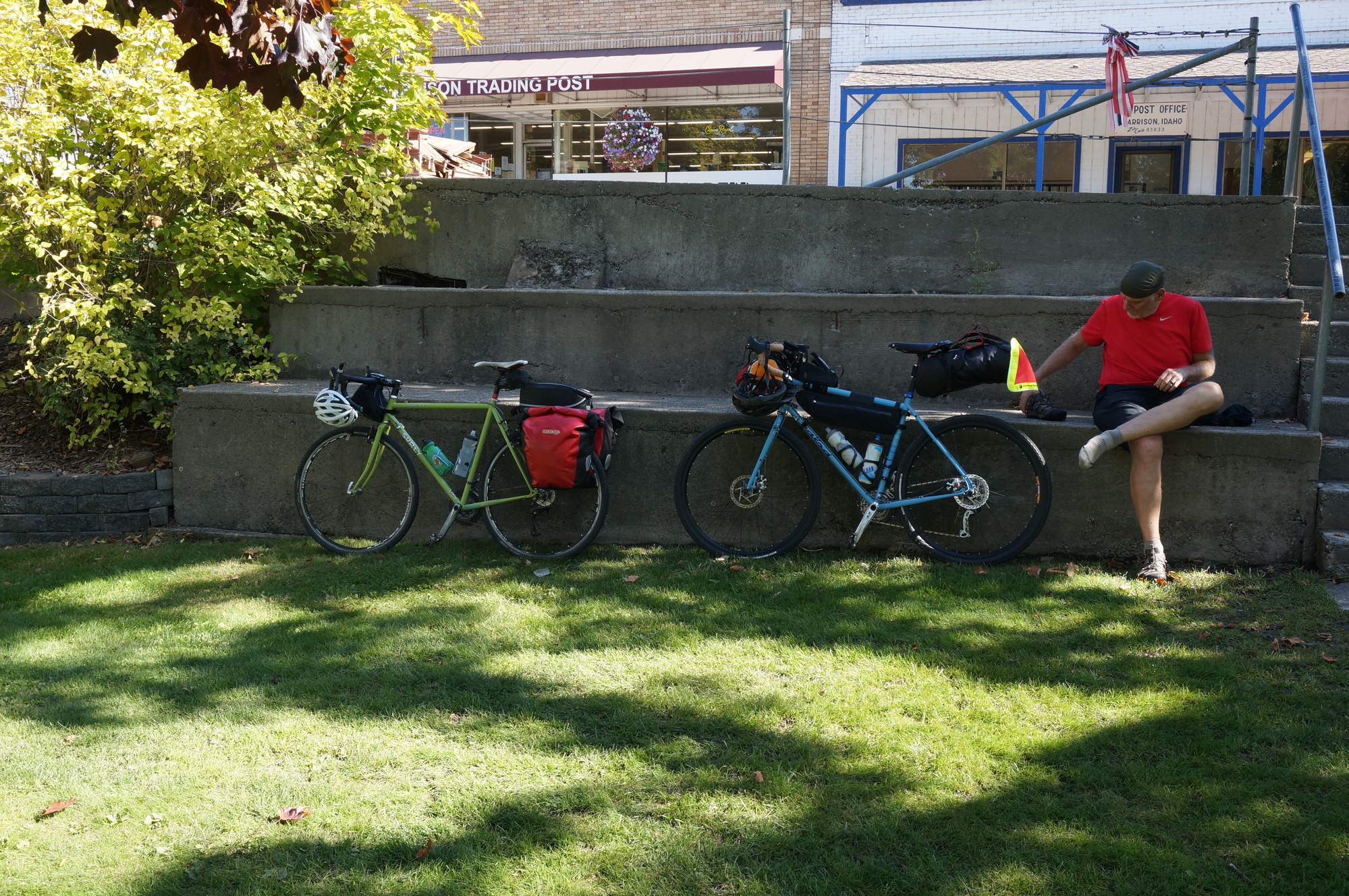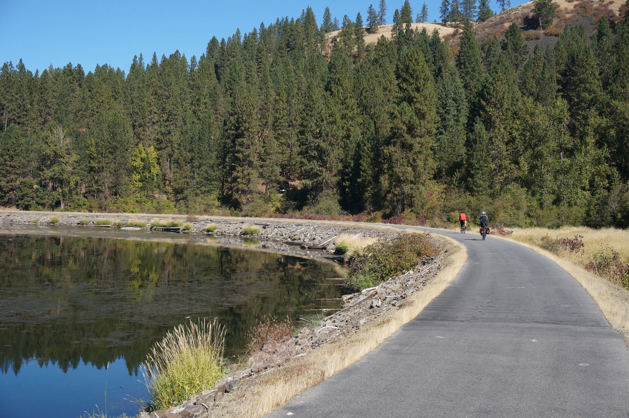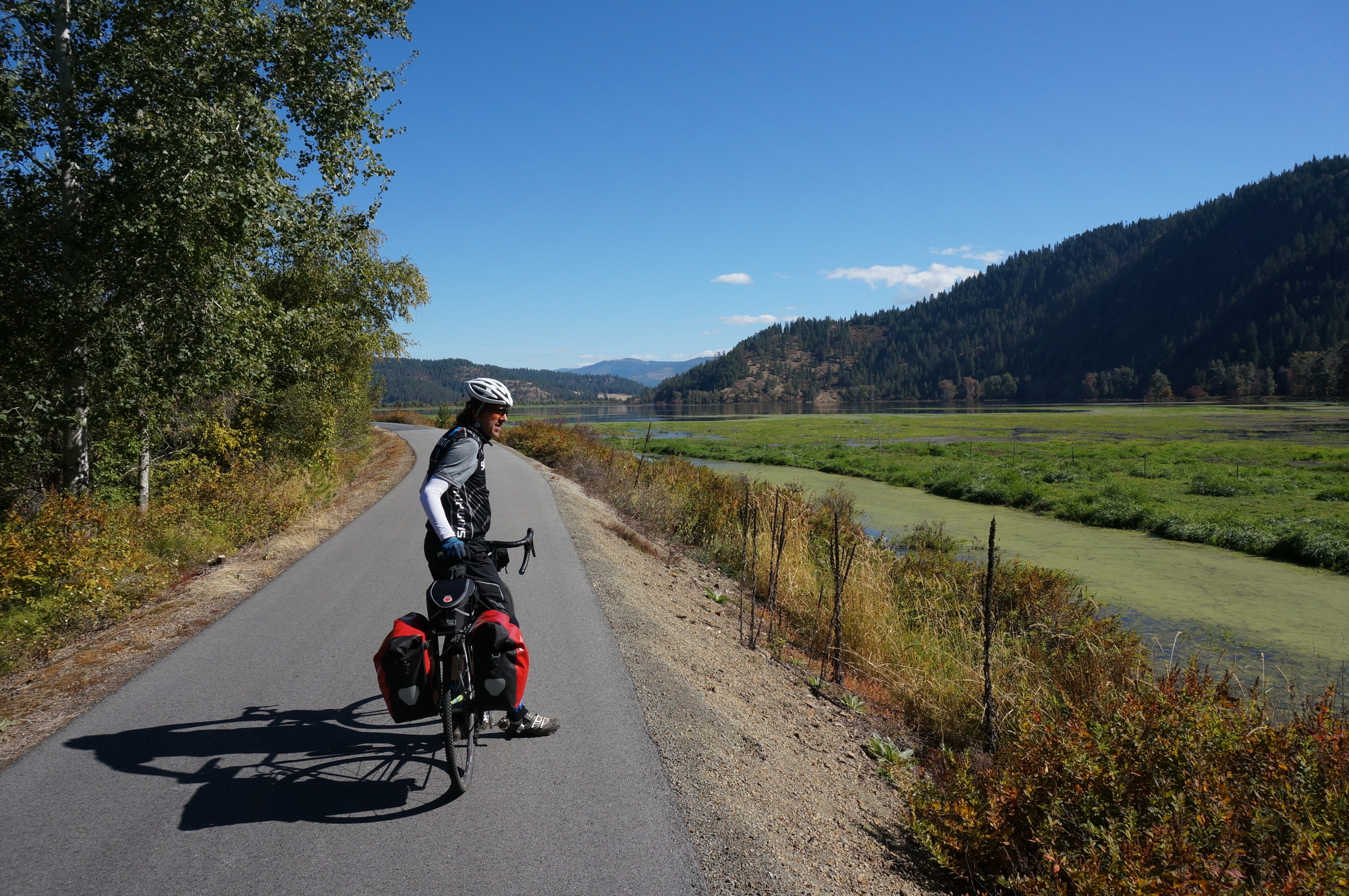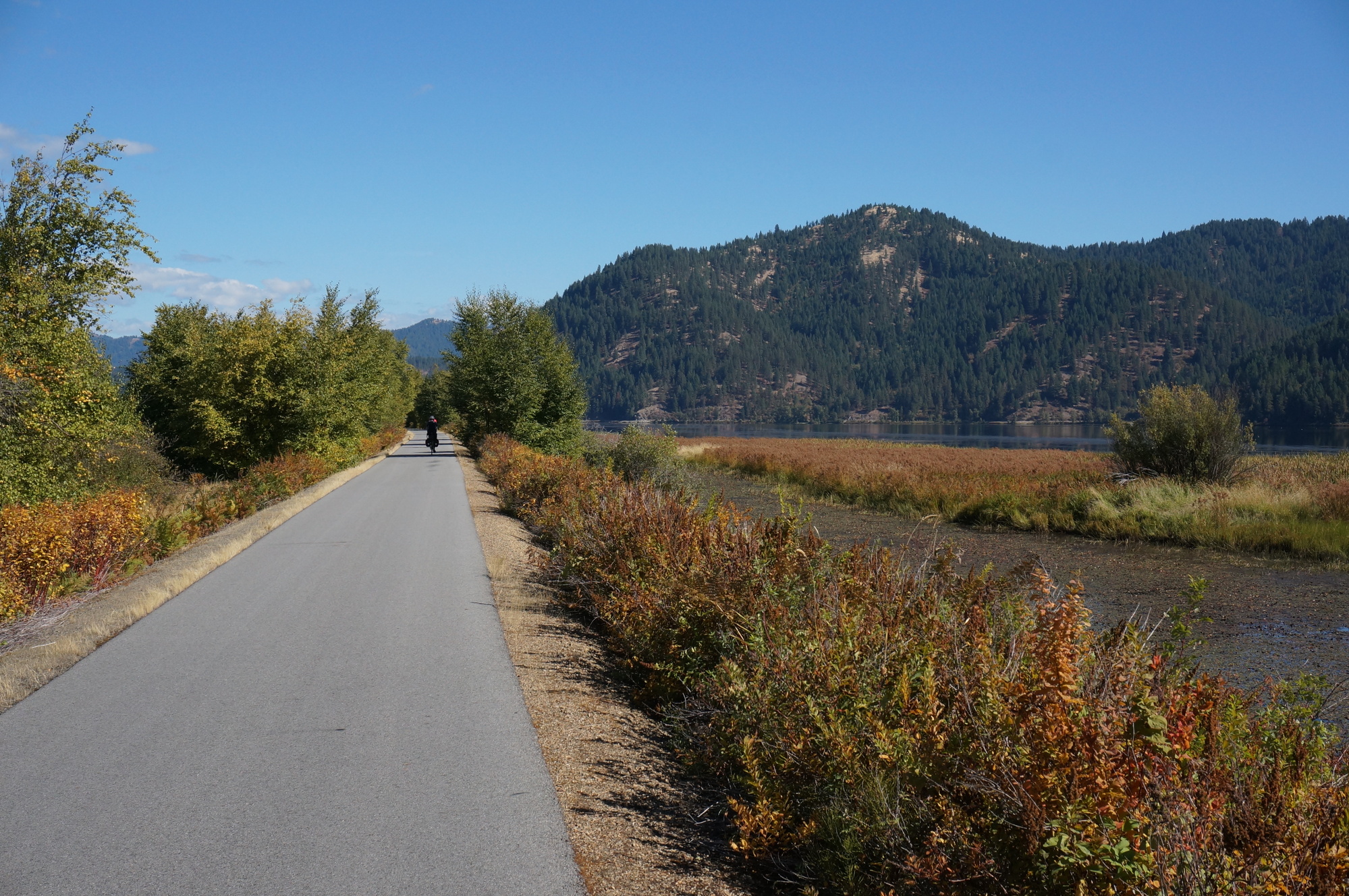 So, in the morning we rode the trail south from Wallace and then across the lake. It was a beautiful ride, about as good as it gets. Then we reversed and returned to Harrison. At this point it was nearly lunch time and since there would be no other places to eat lunch for a long time, we ate lunch in Harrison. Thus, after lunch we were right where we had started the day and no closer to Wallace.