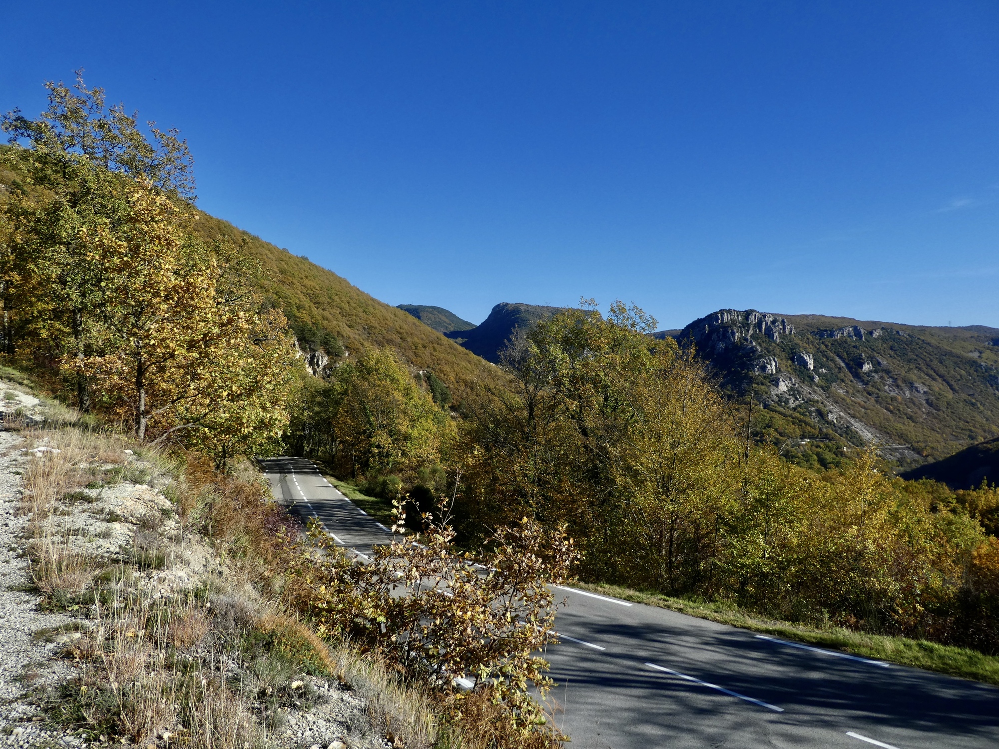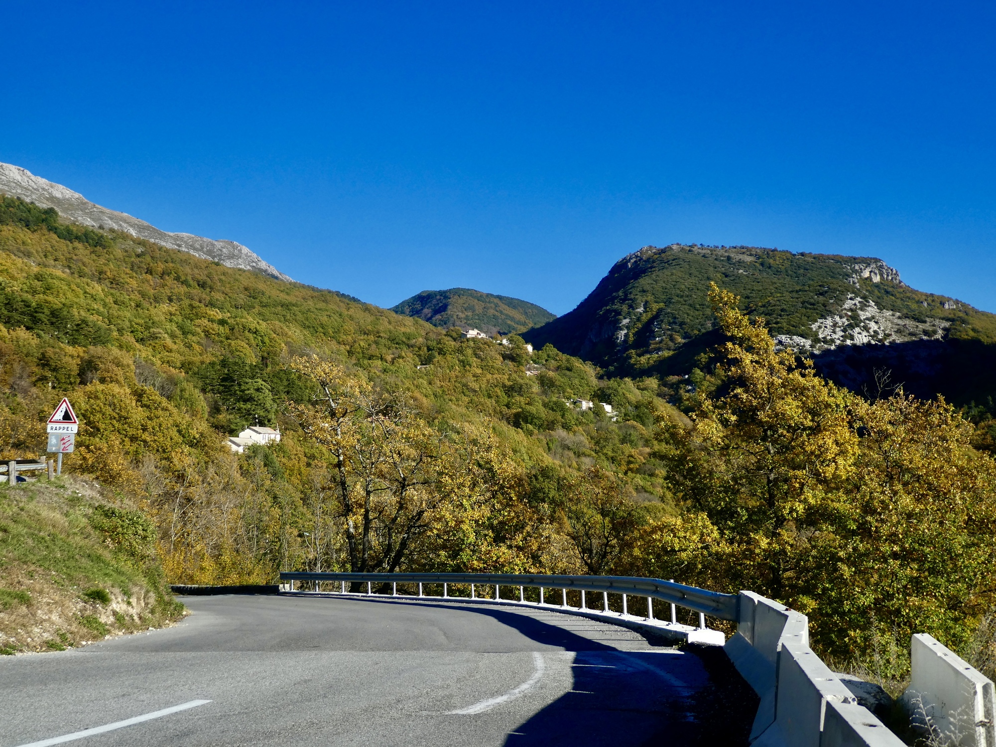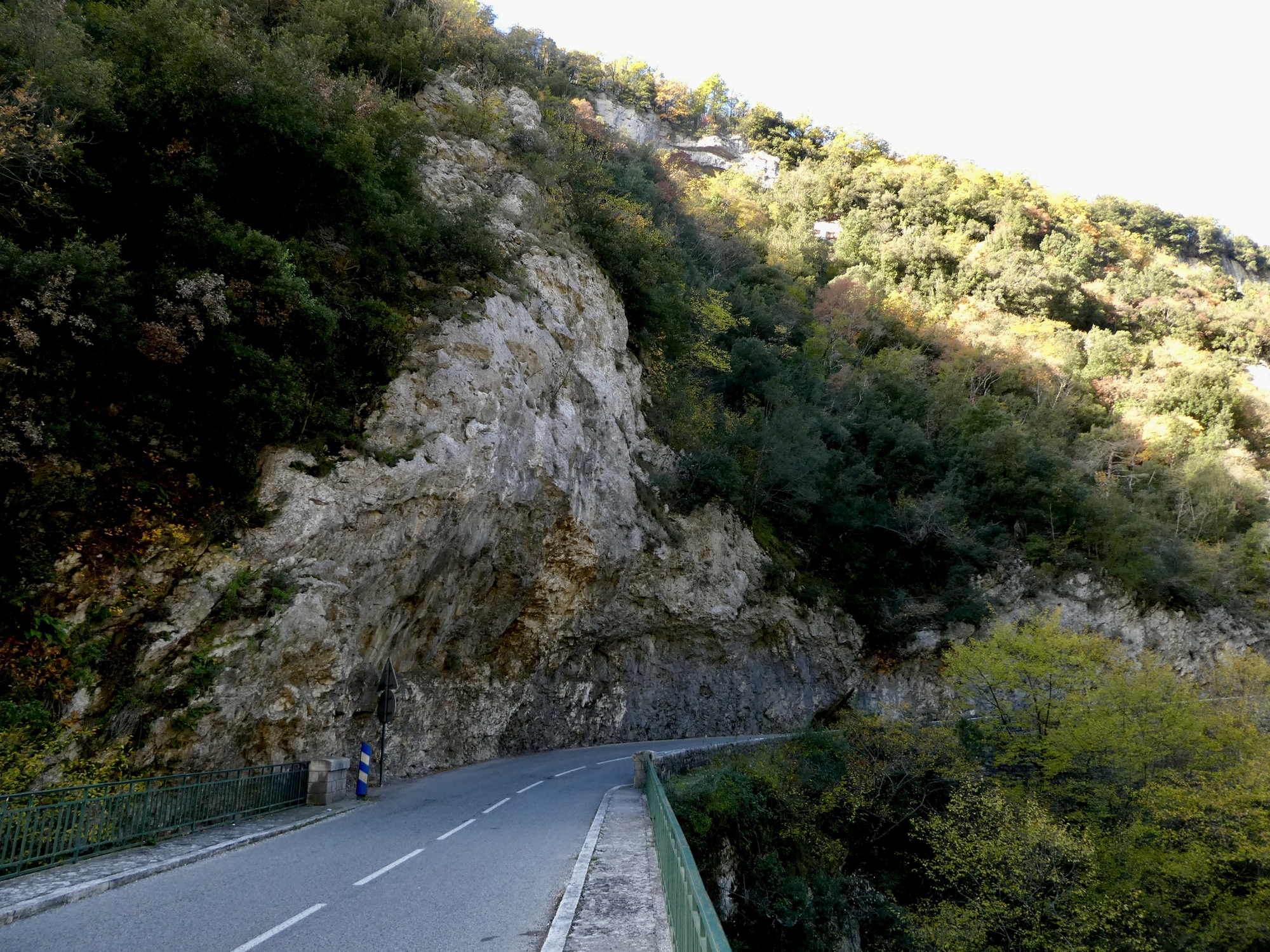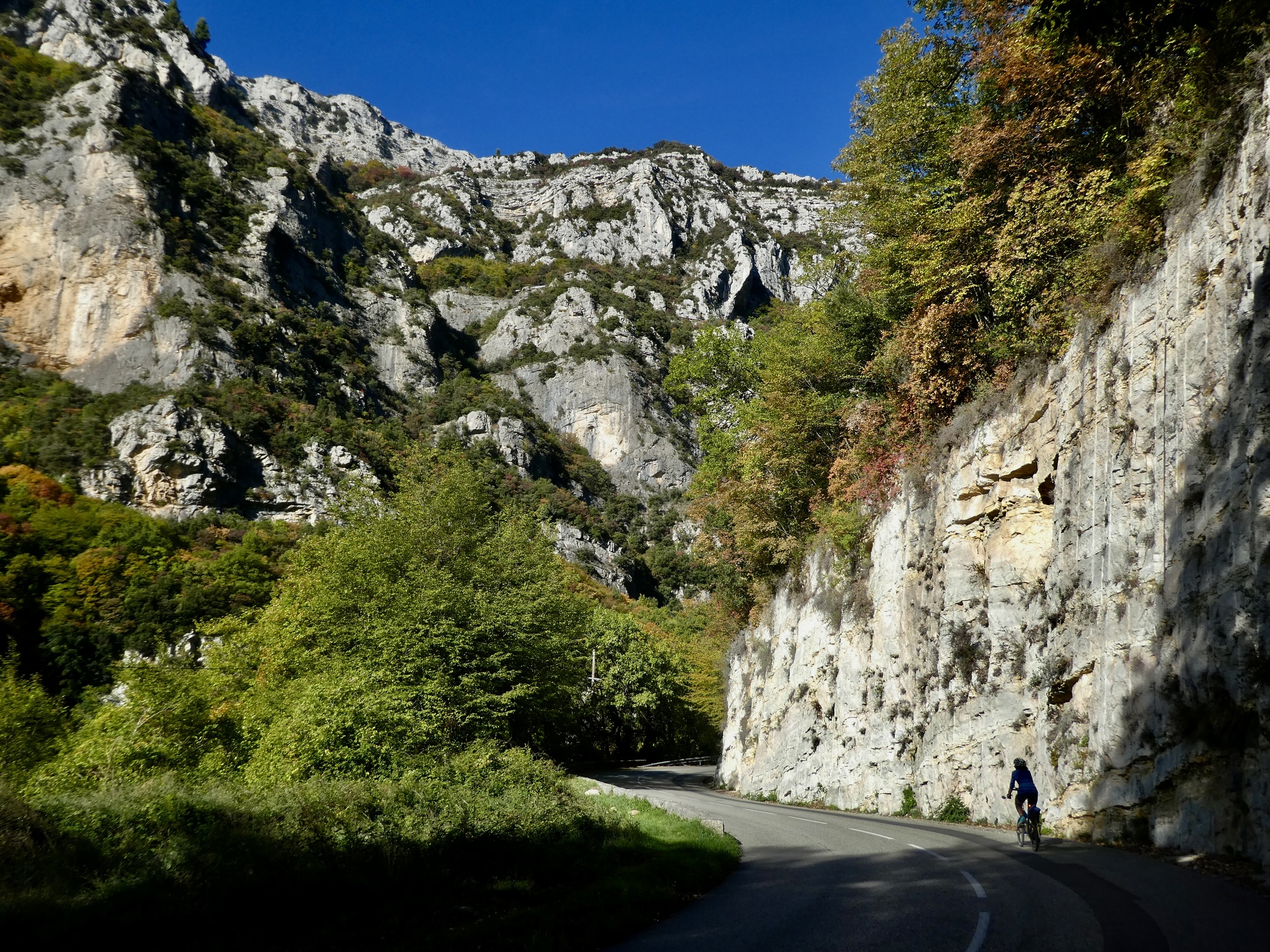 The ride back is almost but not quite an exact reverse. This time we pick up a quiet side route between Tourettes and the gorge that we missed the first time. Much better, saving us from a few uncomfortably busy miles. It’s a thrilling experience racing down the gorge, seeing these same cliffs from the opposite perspective. This late in the day, the light on the trees shows off their wonderful autumn colors well, and every bend of the road brings out gasps of appreciation.