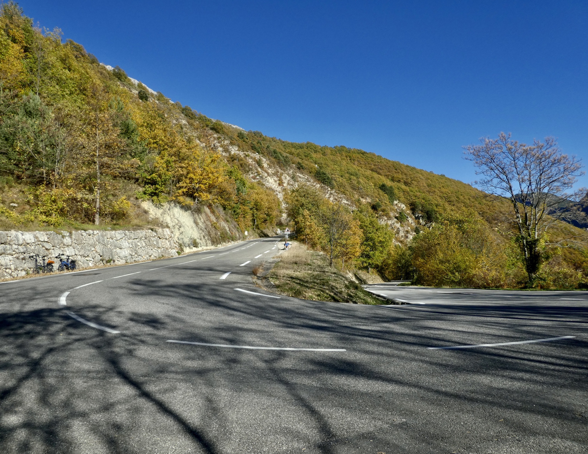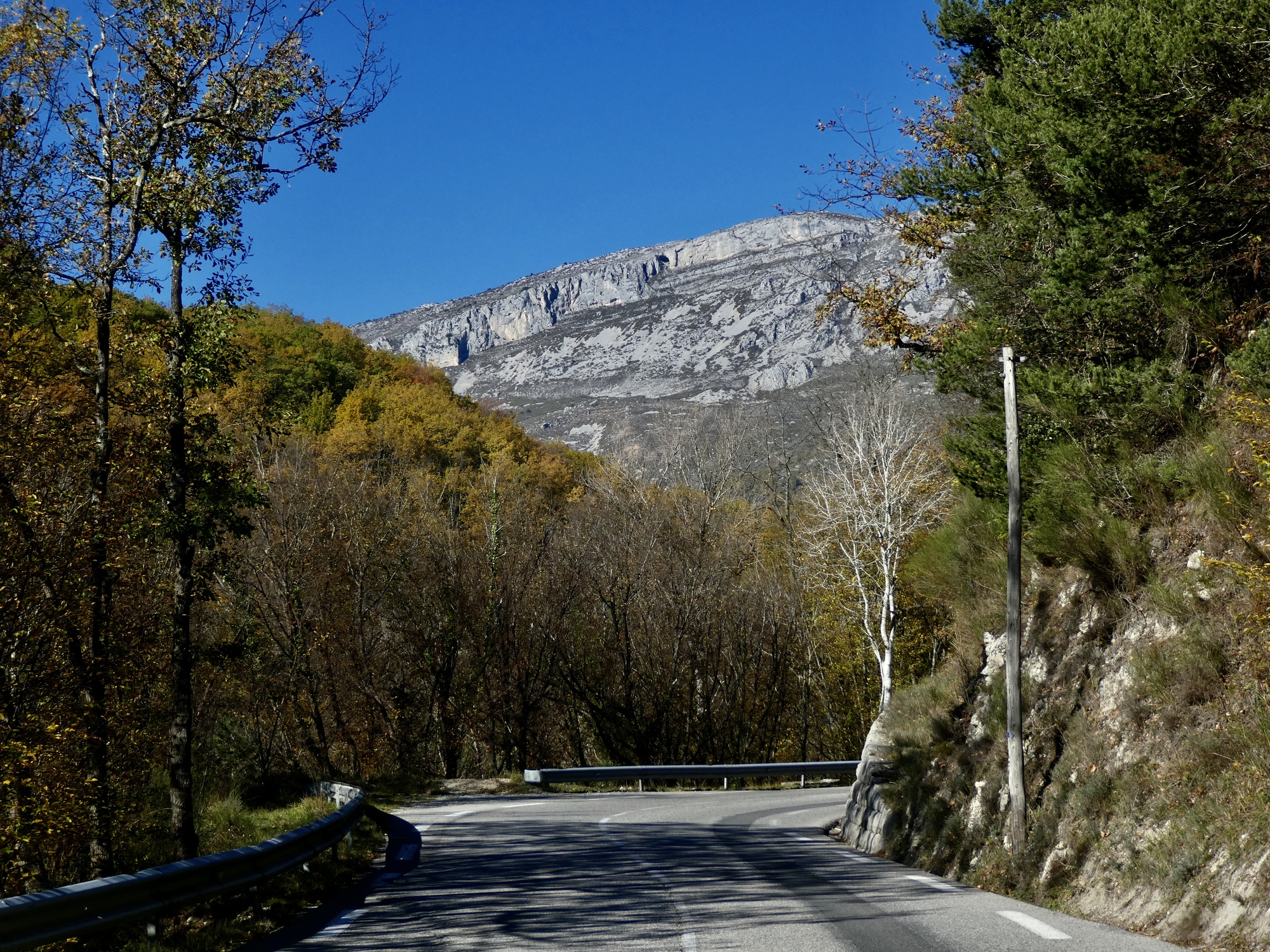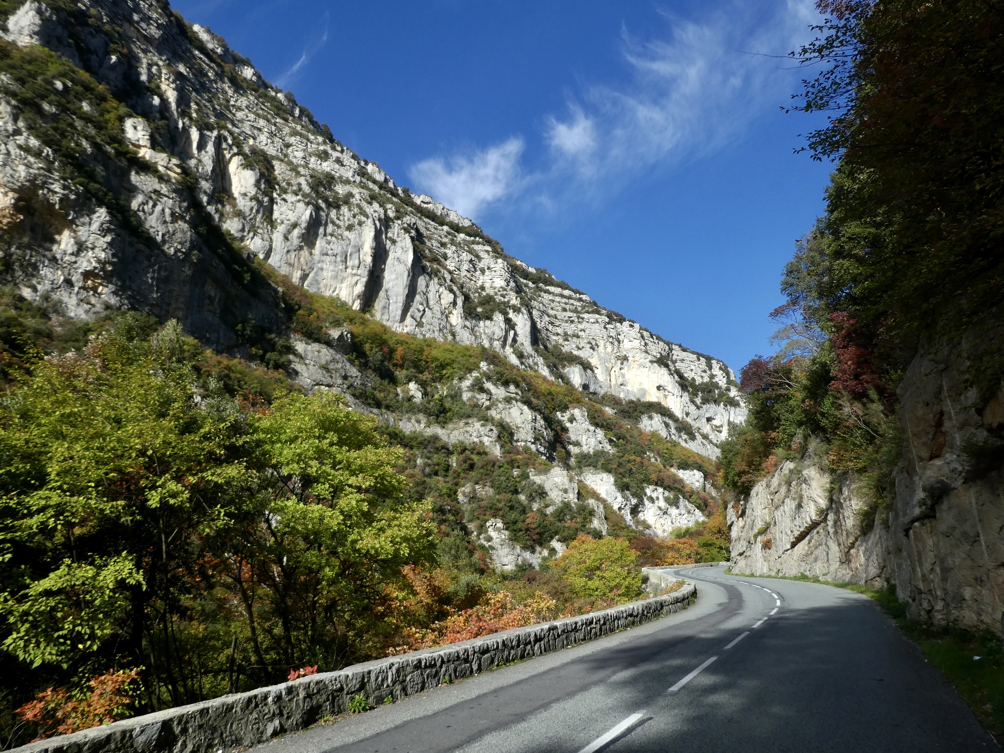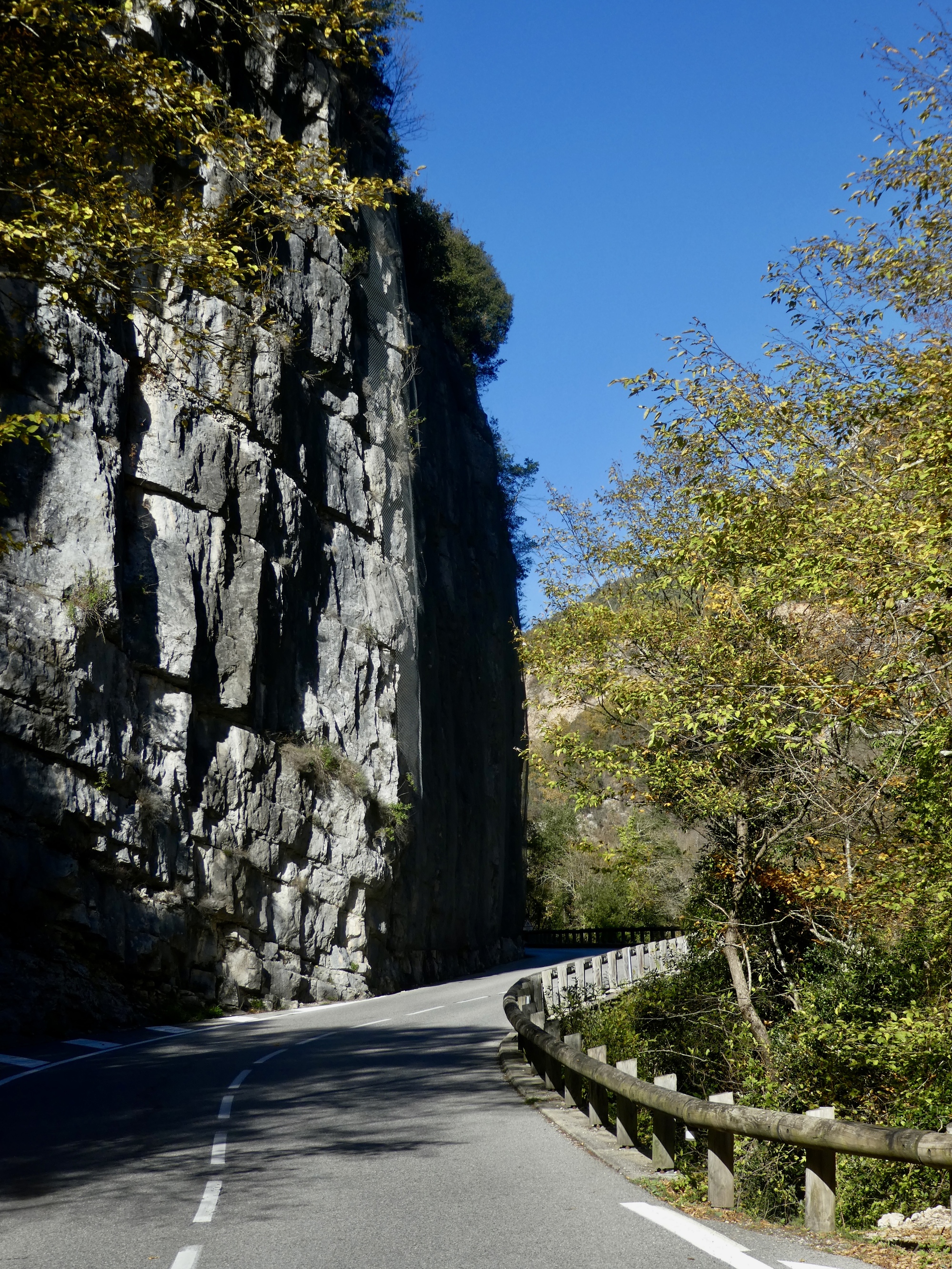 The ride back is almost but not quite an exact reverse. This time we pick up a quiet side route between Tourettes and the gorge that we missed the first time. Much better, saving us from a few uncomfortably busy miles. It’s a thrilling experience racing down the gorge, seeing these same cliffs from the opposite perspective. This late in the day, the light on the trees shows off their wonderful autumn colors well, and every bend of the road brings out gasps of appreciation.