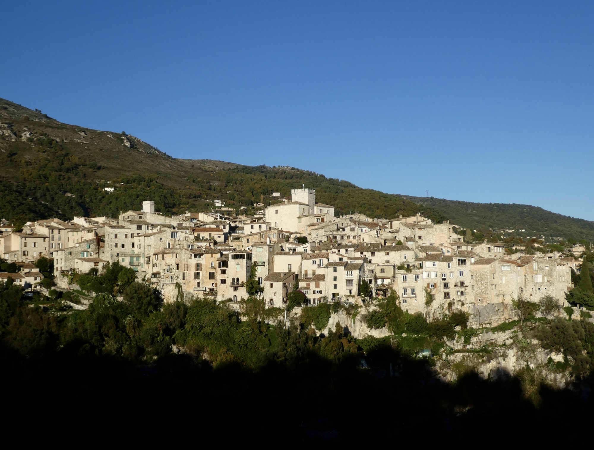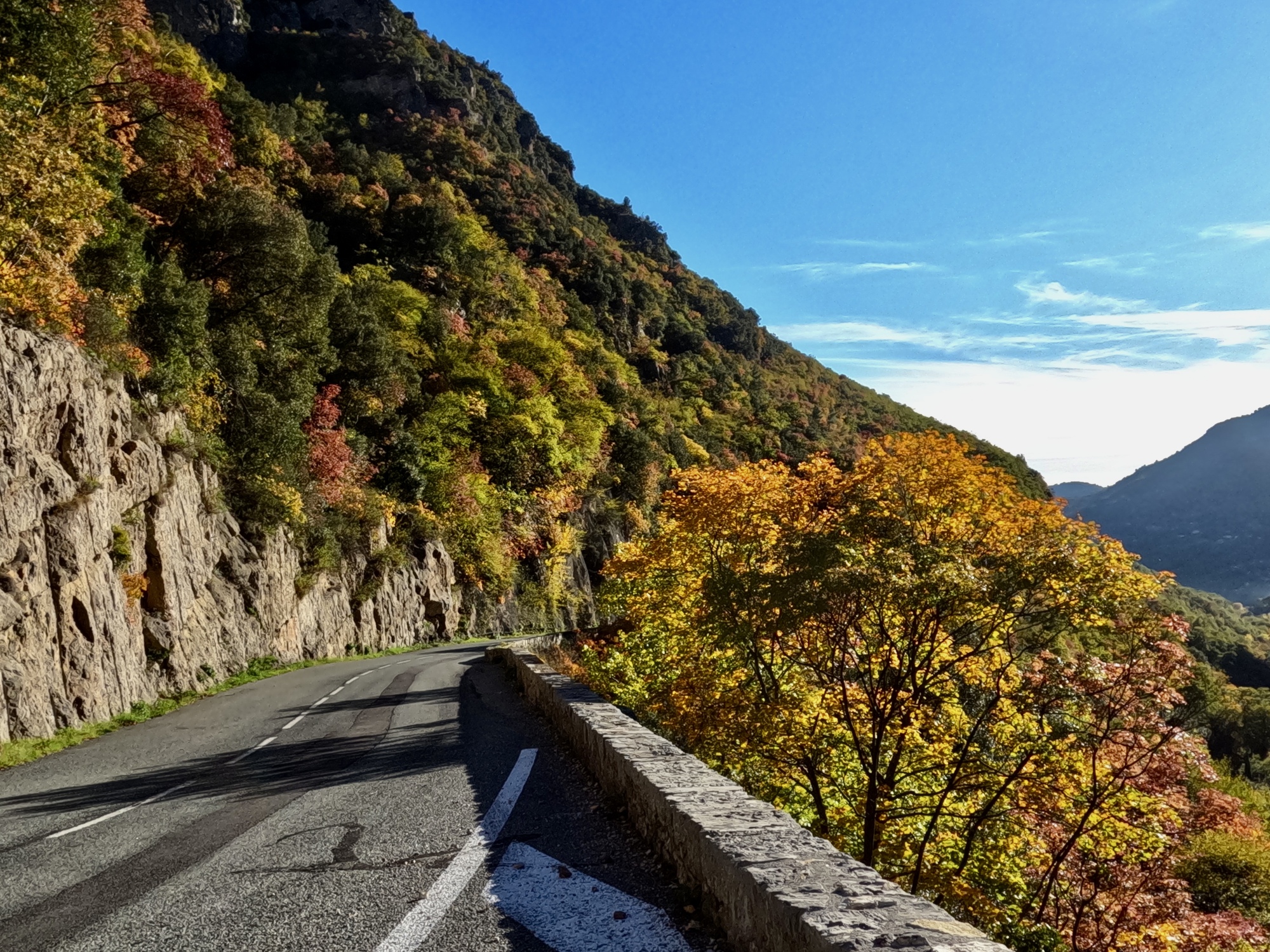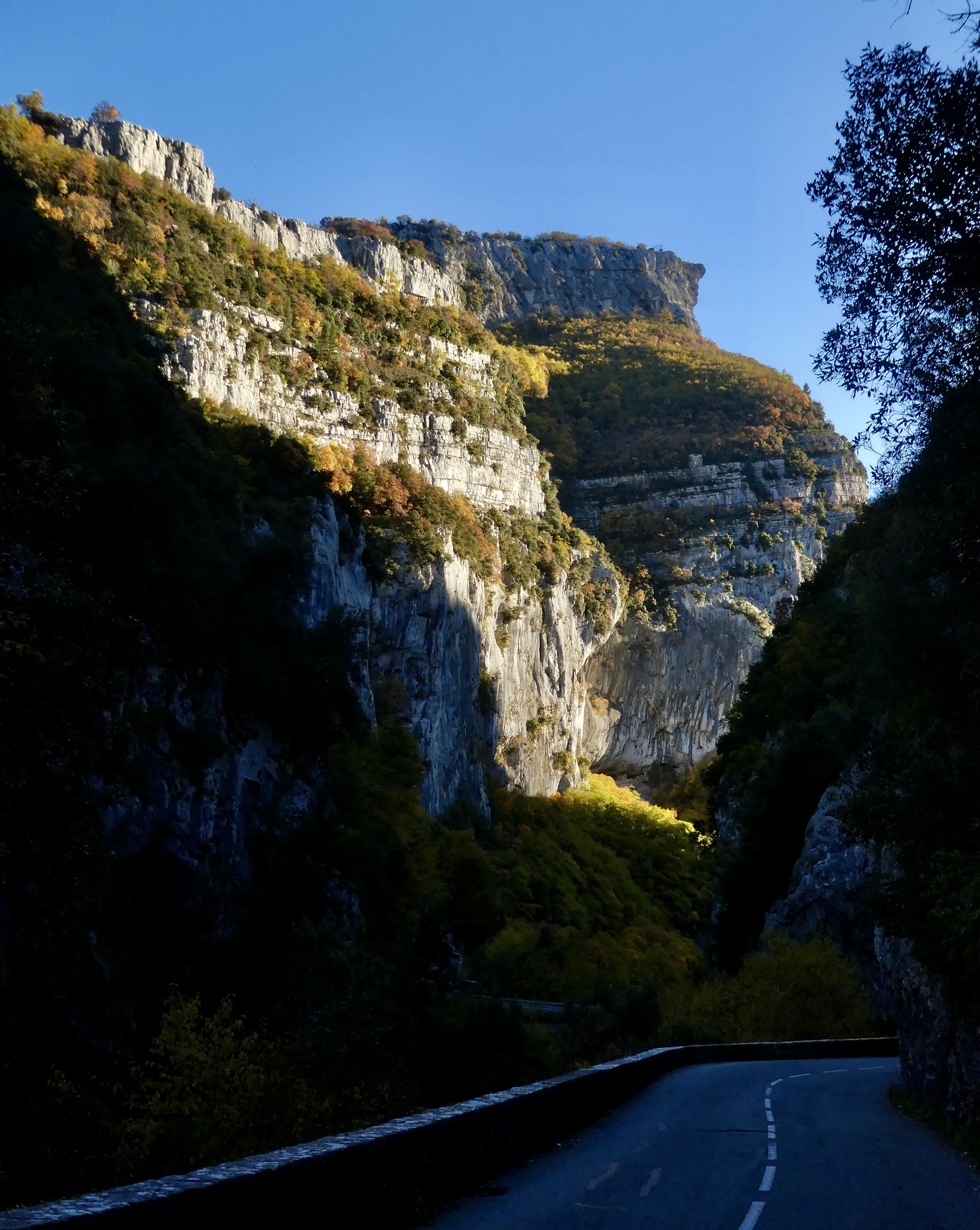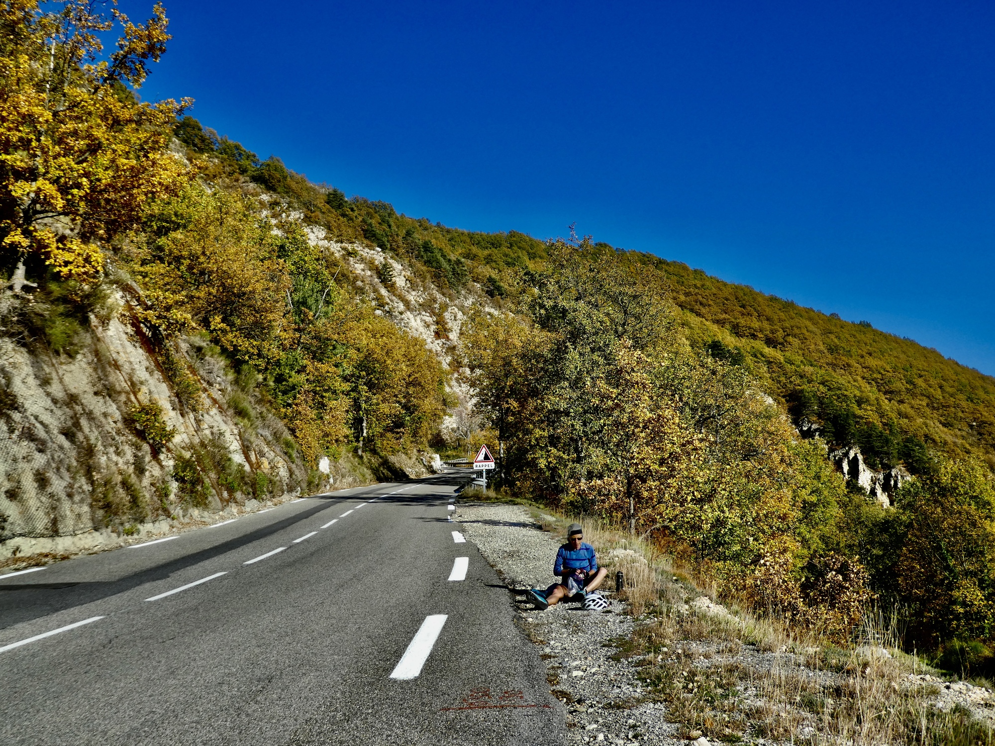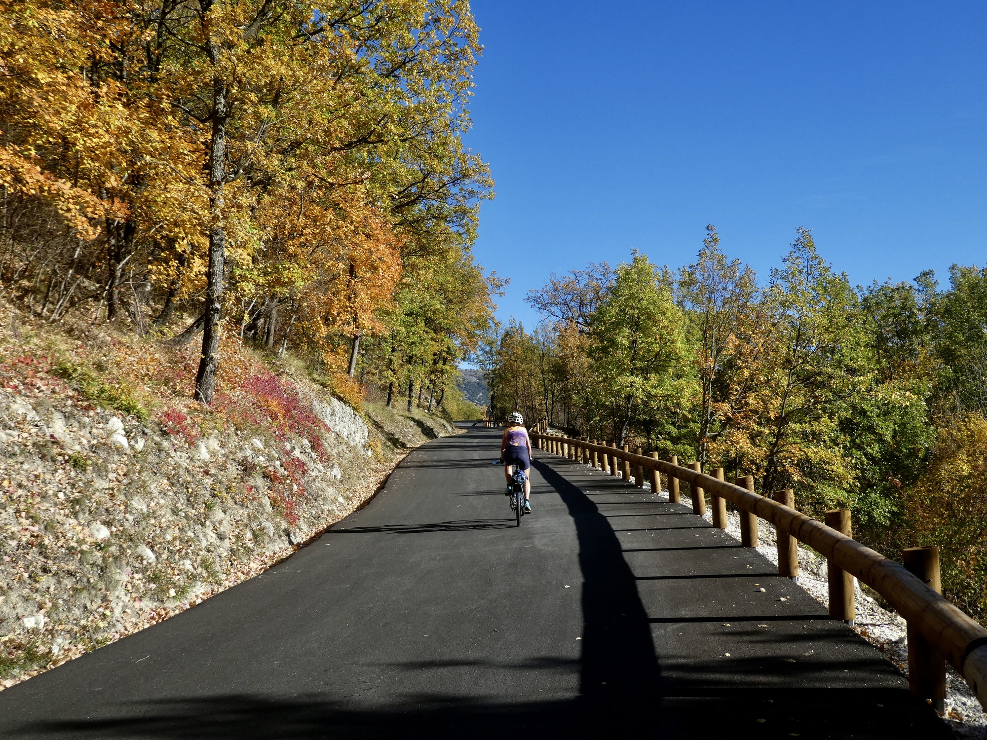 The ride back is almost but not quite an exact reverse. This time we pick up a quiet side route between Tourettes and the gorge that we missed the first time. Much better, saving us from a few uncomfortably busy miles. It’s a thrilling experience racing down the gorge, seeing these same cliffs from the opposite perspective. This late in the day, the light on the trees shows off their wonderful autumn colors well, and every bend of the road brings out gasps of appreciation.
