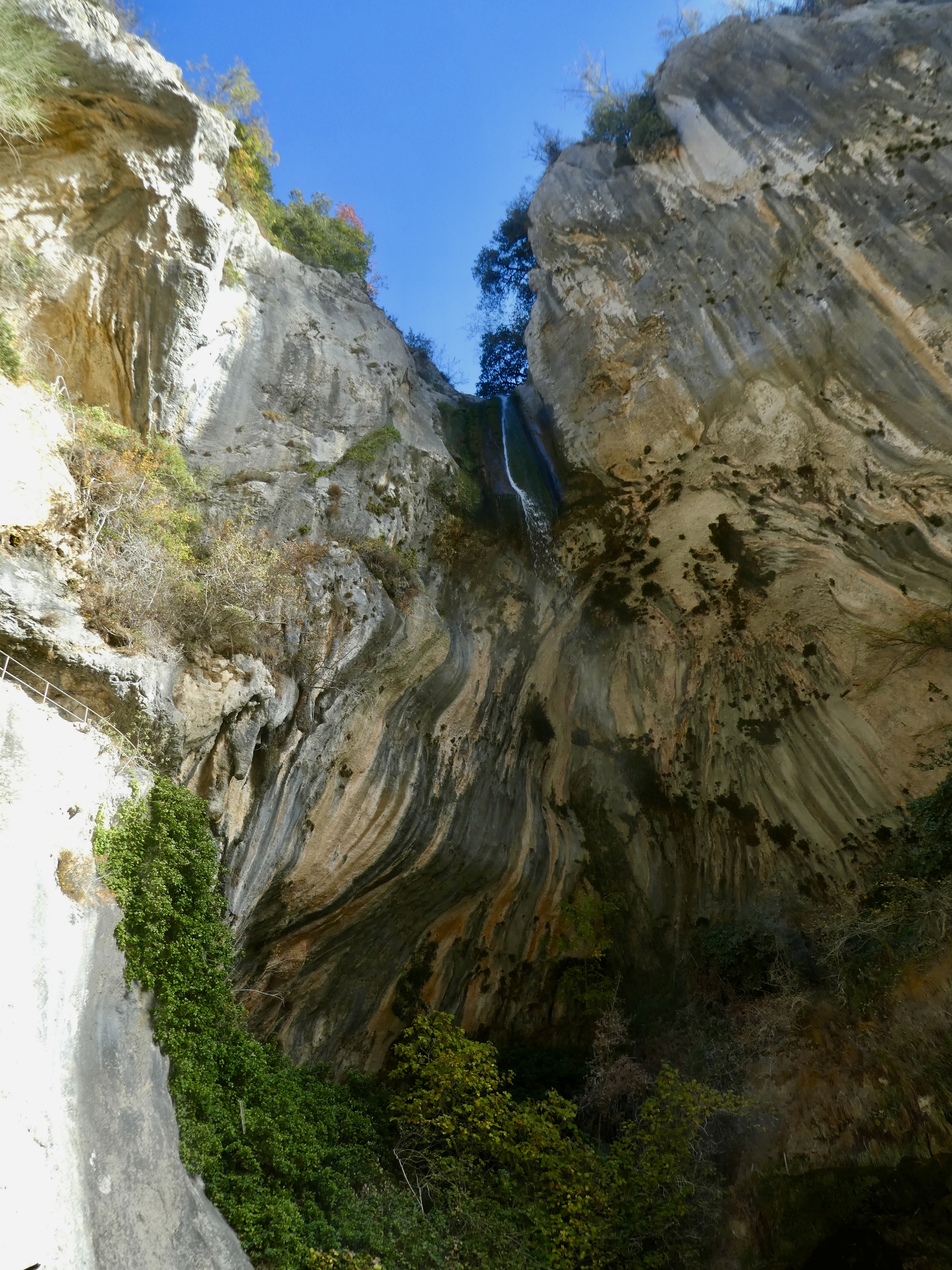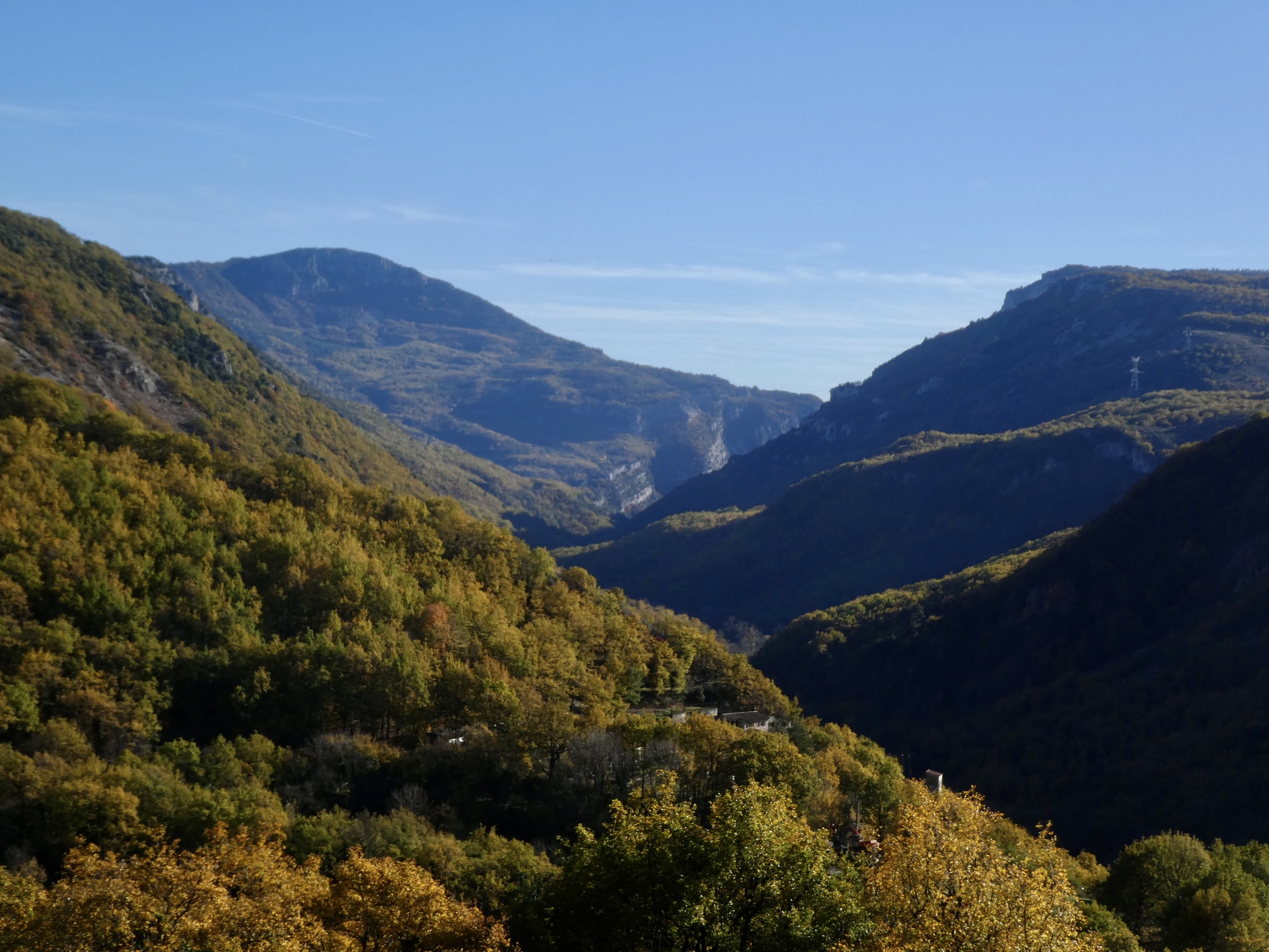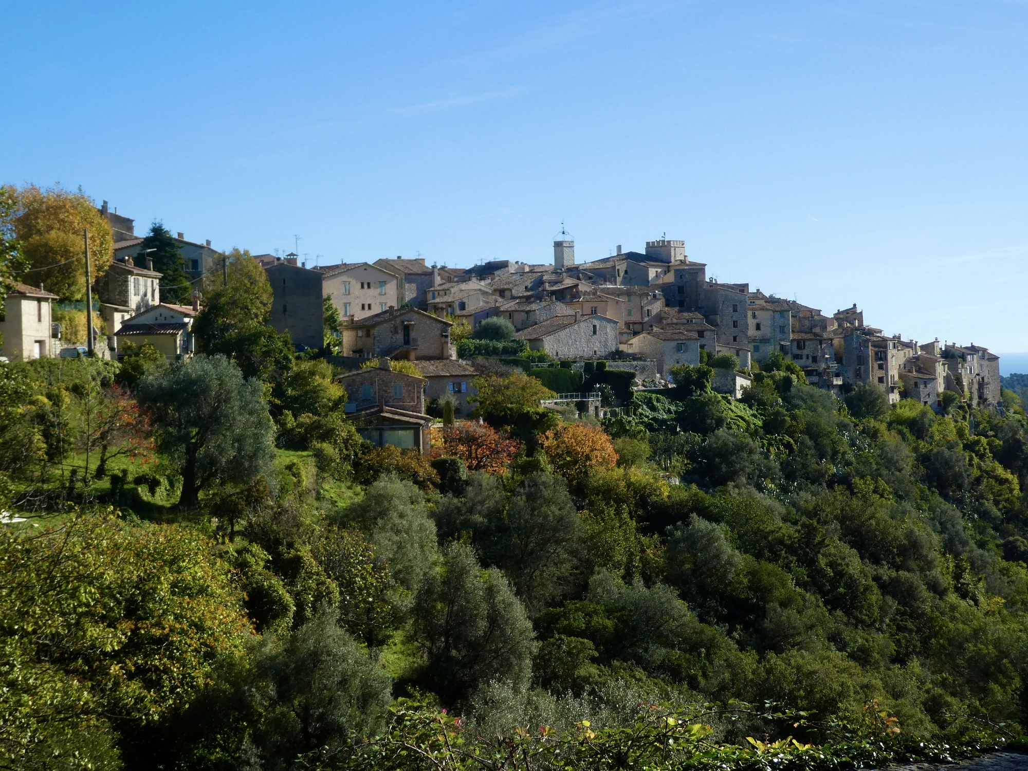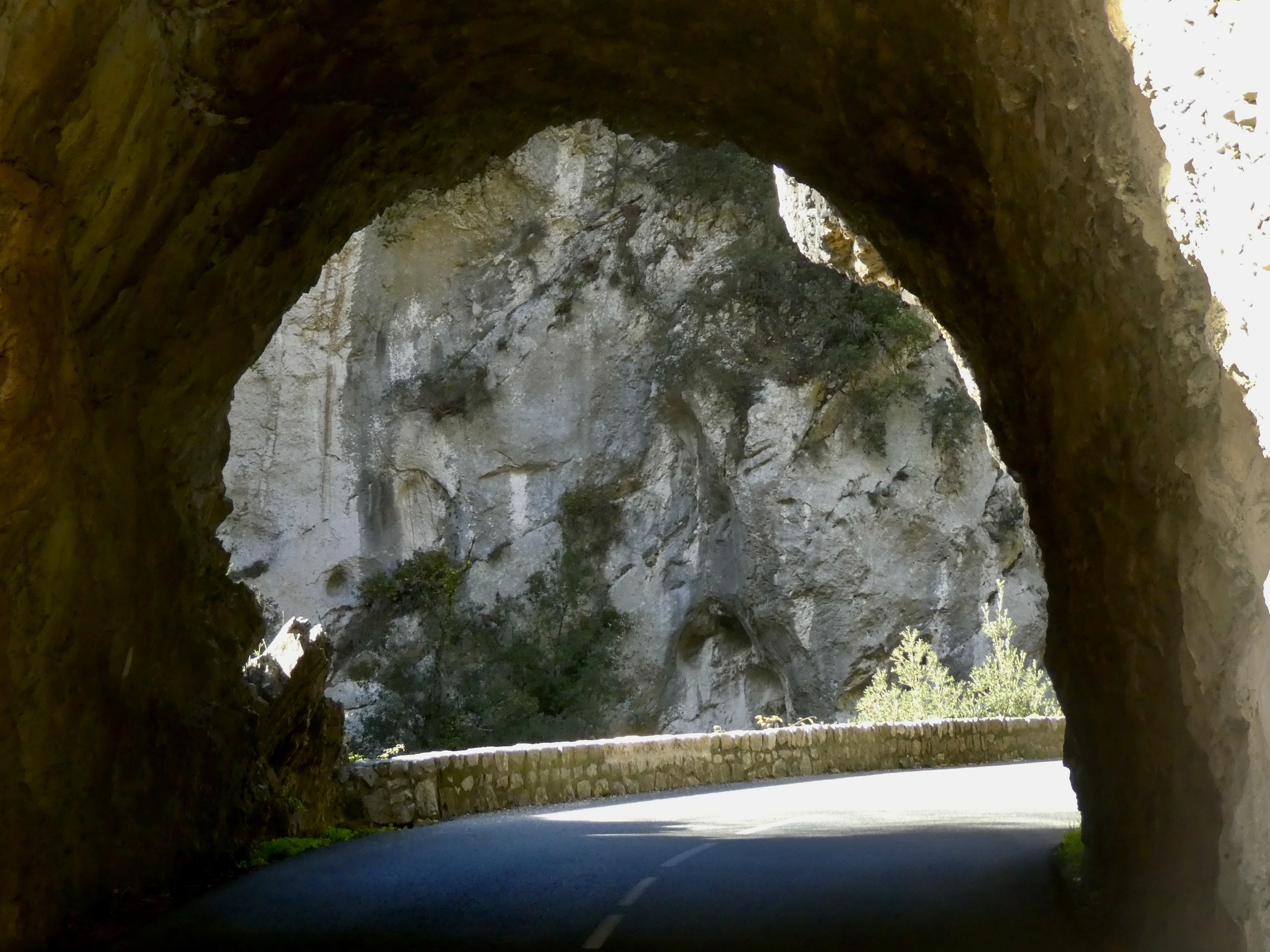The ride back is almost but not quite an exact reverse. This time we pick up a quiet side route between Tourettes and the gorge that we missed the first time. Much better, saving us from a few uncomfortably busy miles. It’s a thrilling experience racing down the gorge, seeing these same cliffs from the opposite perspective. This late in the day, the light on the trees shows off their wonderful autumn colors well, and every bend of the road brings out gasps of appreciation.
