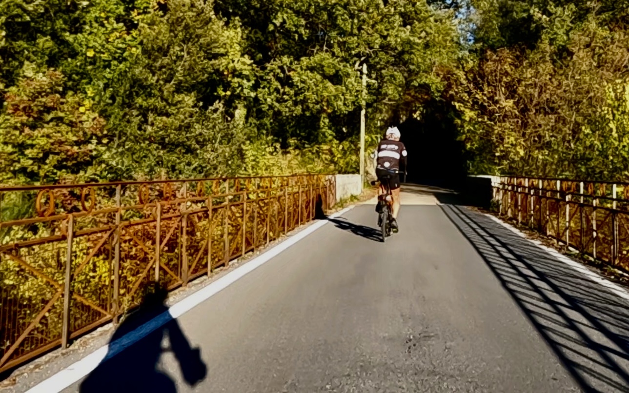 We pass through a series of three tunnels as we drop toward the river. Two, like this one, are quite short; but one was long enough that we were glad it was illuminated. We’d have had to turn back otherwise because we didn’t think to bring the lights with us today.