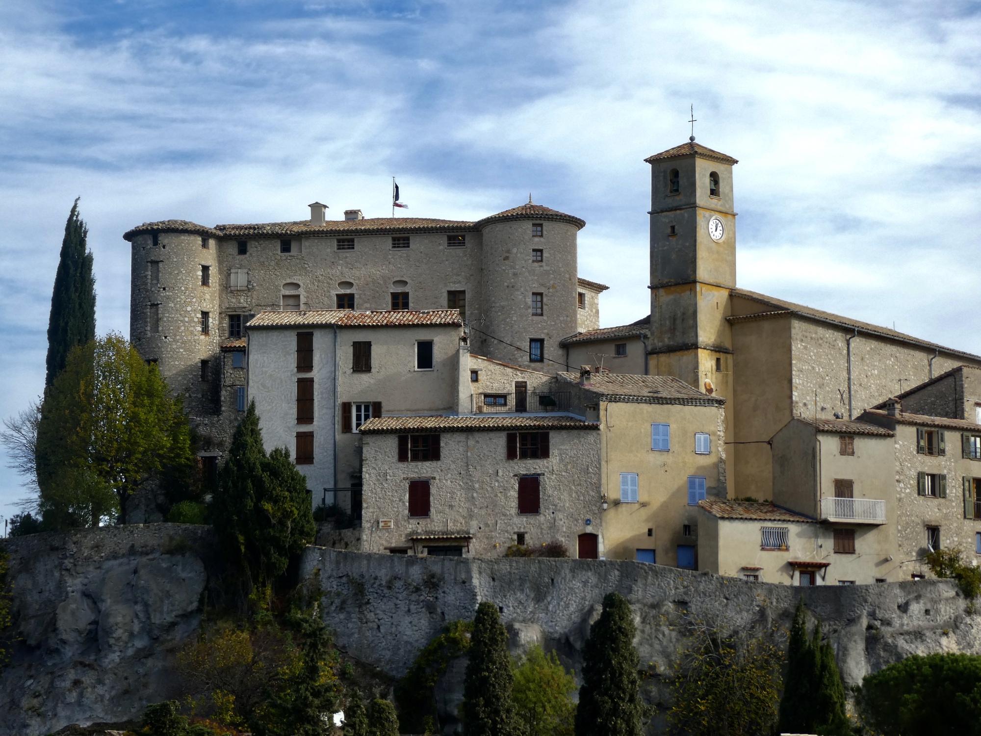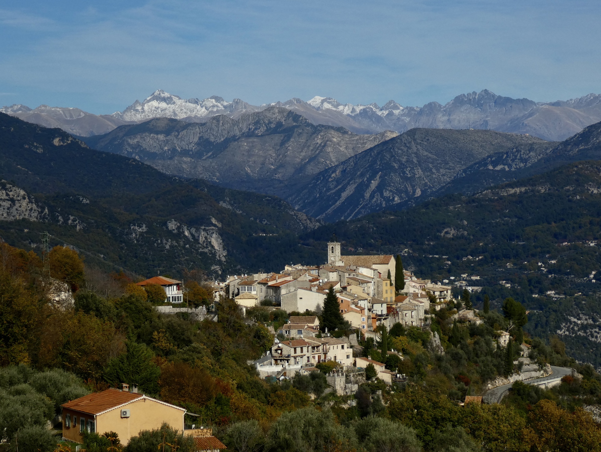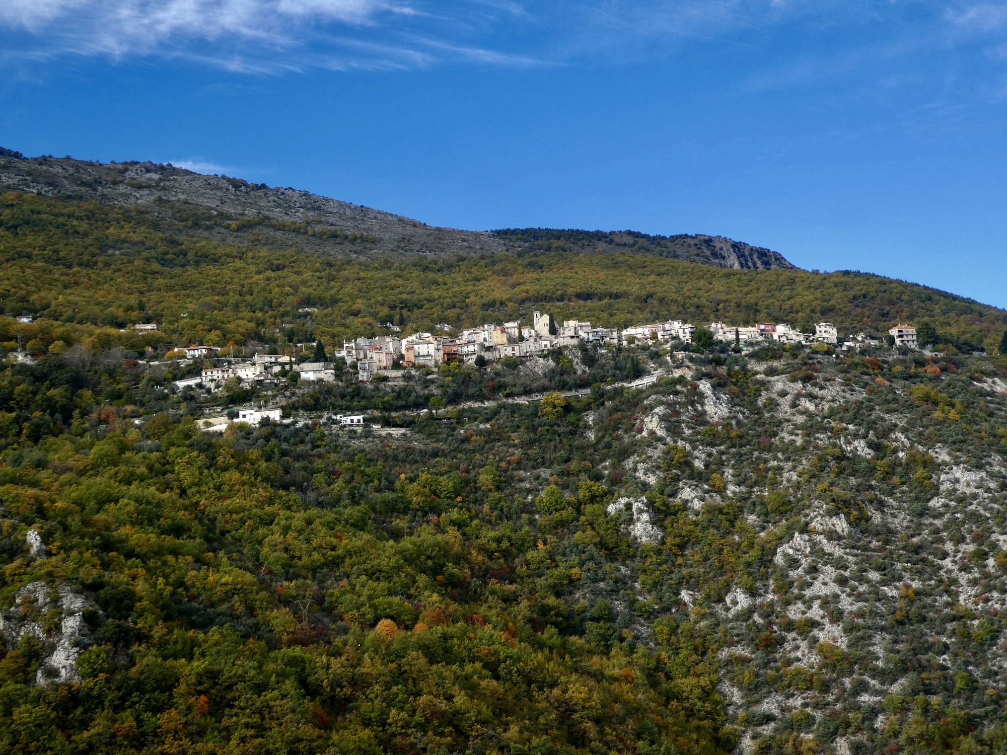 I was anticipating some great mountain vistas as I followed my balcony road north up the Var, and I’m not disappointed. The big surprise though, and the real highlight for the next ten miles is the views I get of the perched villages, most of which are the same ones we saw biking in to Vence two days ago. I’m on a different road though, a few hundred feet higher up the valley wall, high enough that I get to look down on them from above this time.