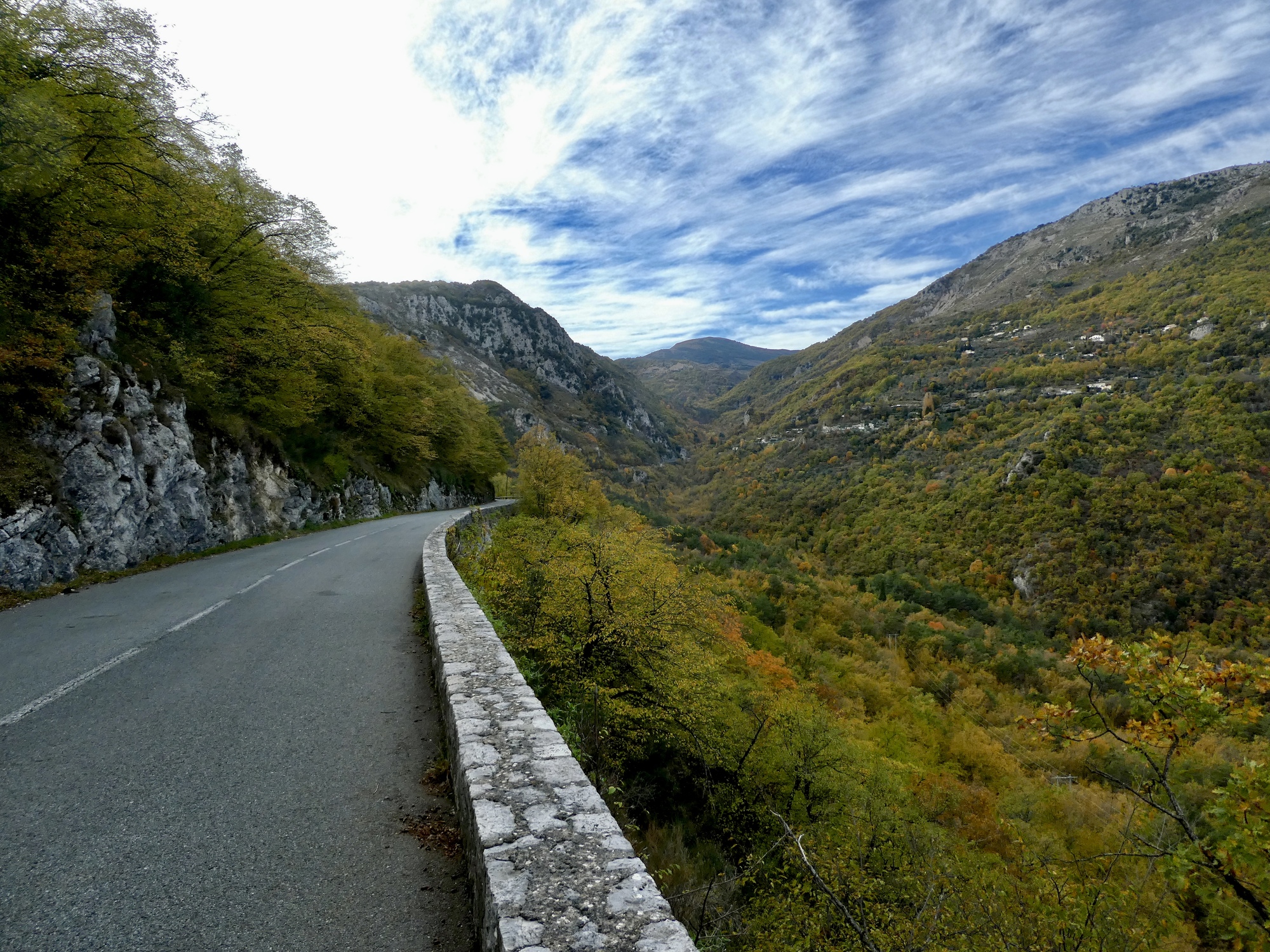 Leaving Vence. The formations rise abruptly from the north side of town. It’s no surprise there’s but the one round to the north from here. Looking ahead, there’s a significant gap between those two crags where the Cagne River cuts through from just the other side of the Col de Vence, but there’s no road through there.