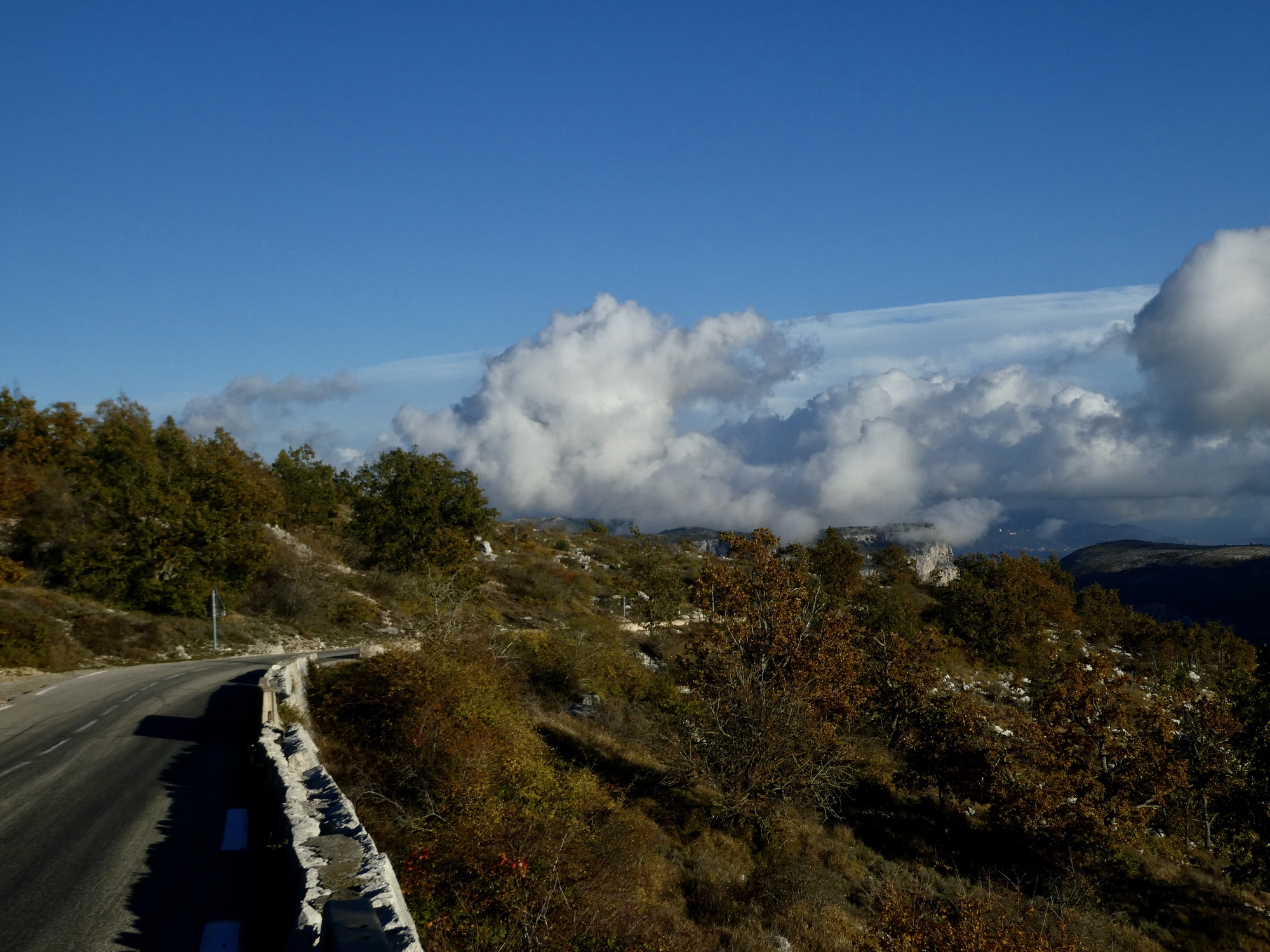 Starting from Vence, it’s a seven mile climb to the summit at a very steady 6.5-7% grade, which is a decent piece of work. I’ll be approaching it from the north though, when there’s not much to the climb at all - with its summit at roughly 3,100’, it’s essentially a just speed bump dropping down from the highest point of my loop at 3,300’ just below Coursegoules. My real work comes in the climb up to Coursegoules, but that’s a concern for later. For now I’ll enjoy fairly easy riding as I head east toward the Var and then follow it north on a balcony road for the first hour or so.