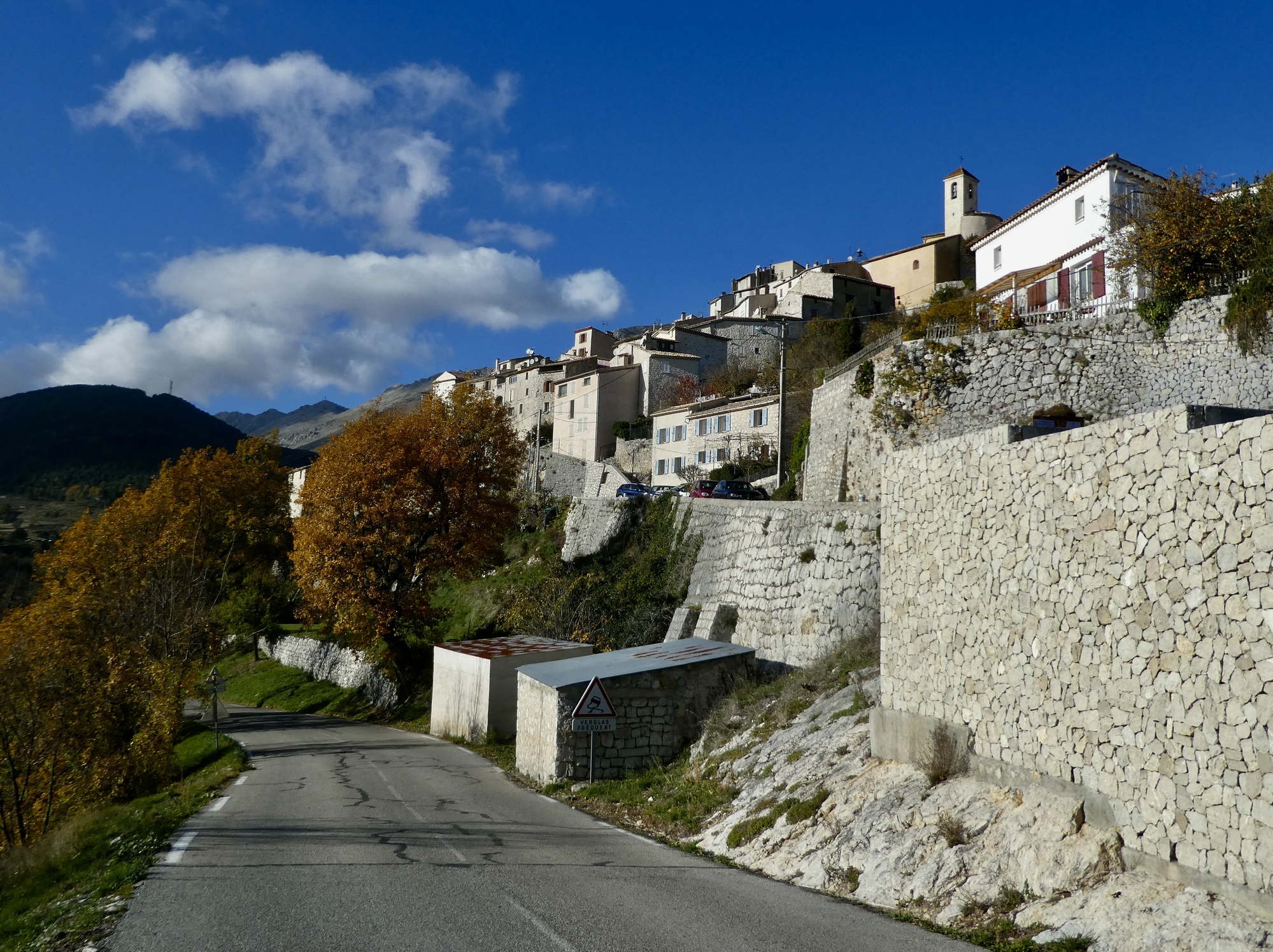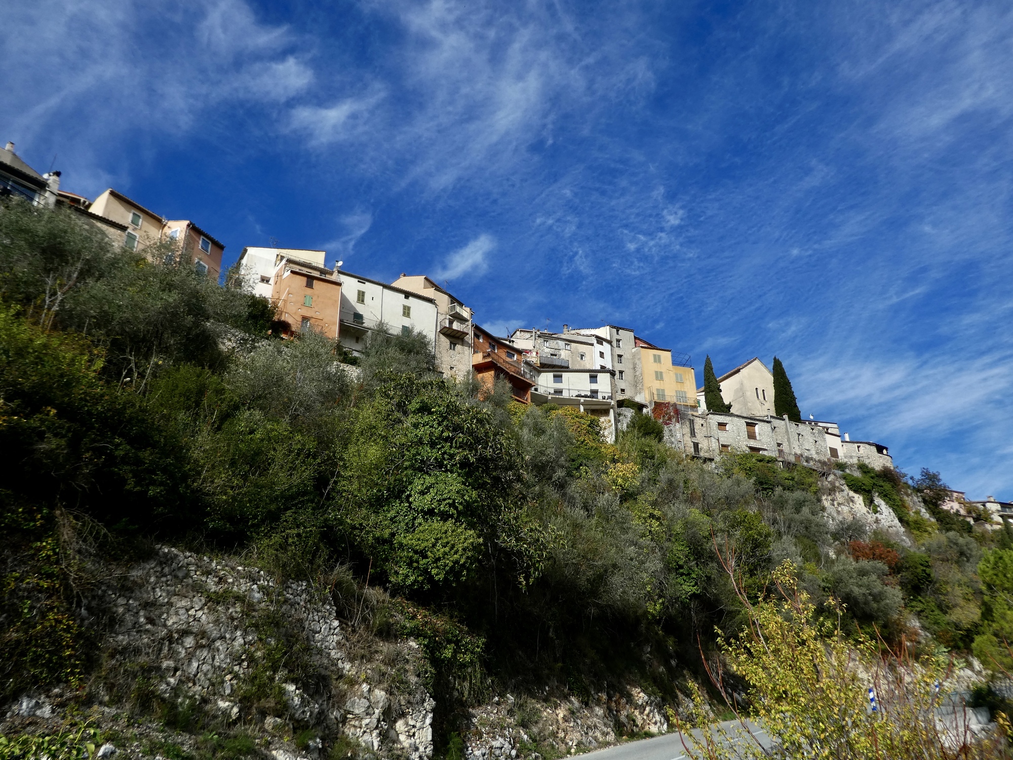 Looking across the Bouyon. for awhile I thought I’d be riding that road opposite, after passing through the village of Bouyon; but I’ll double back before then on a road you can’t see from this side of the valley. If we ever come back here though I’d love to continue on that road, D1, the route to Roquesteron; and beyond that to Puget-Theniers, Entrevaux, Colmars, Barcelonnette! Maybe not with the panniers next time though.
