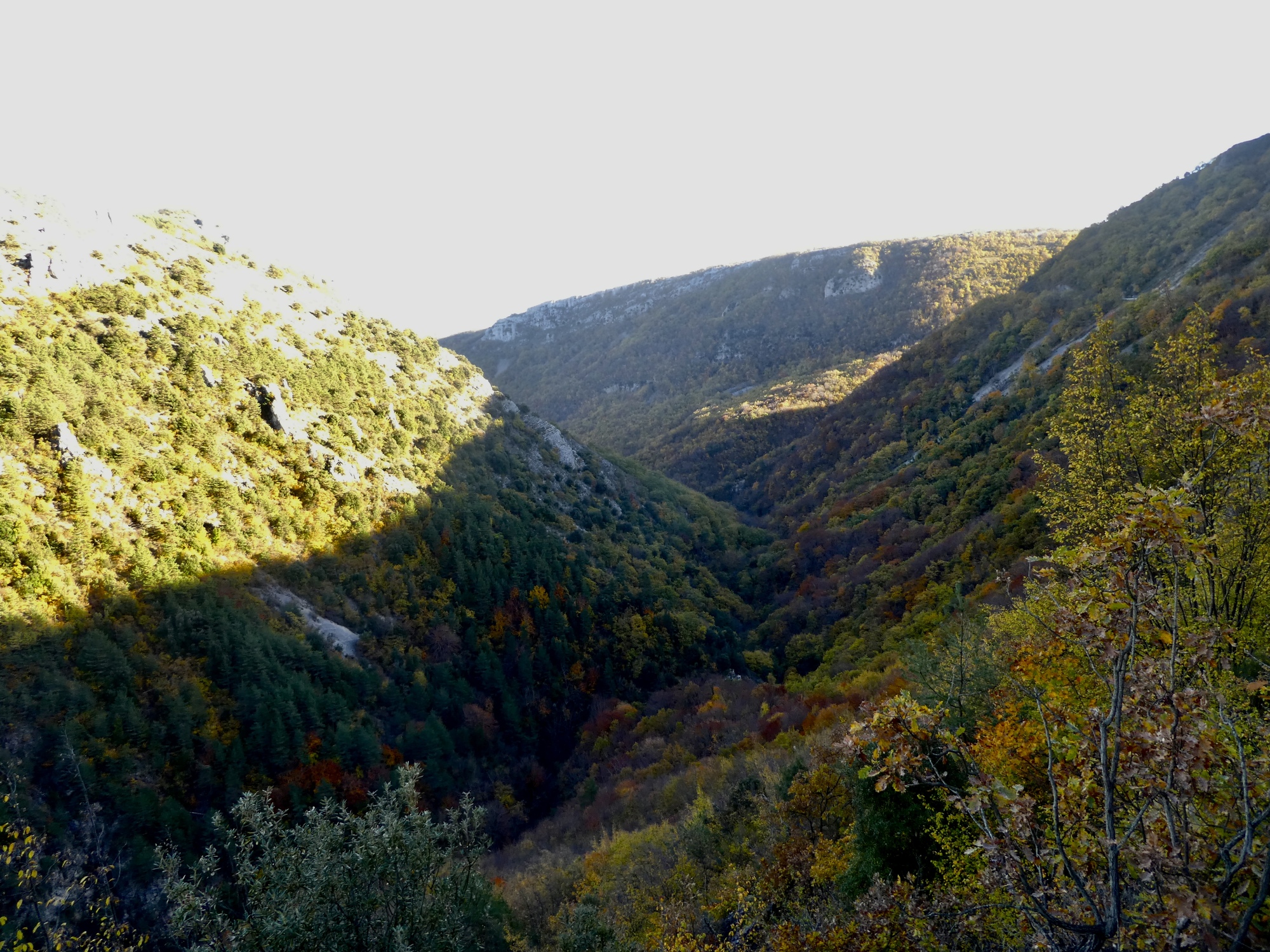 The light is poor here, but I wanted to remember looking down the canyon carved by the Cagne, the river that comes out the other side just below Vence. There’s no road down that wild canyon, and I don’t think even a walking route.