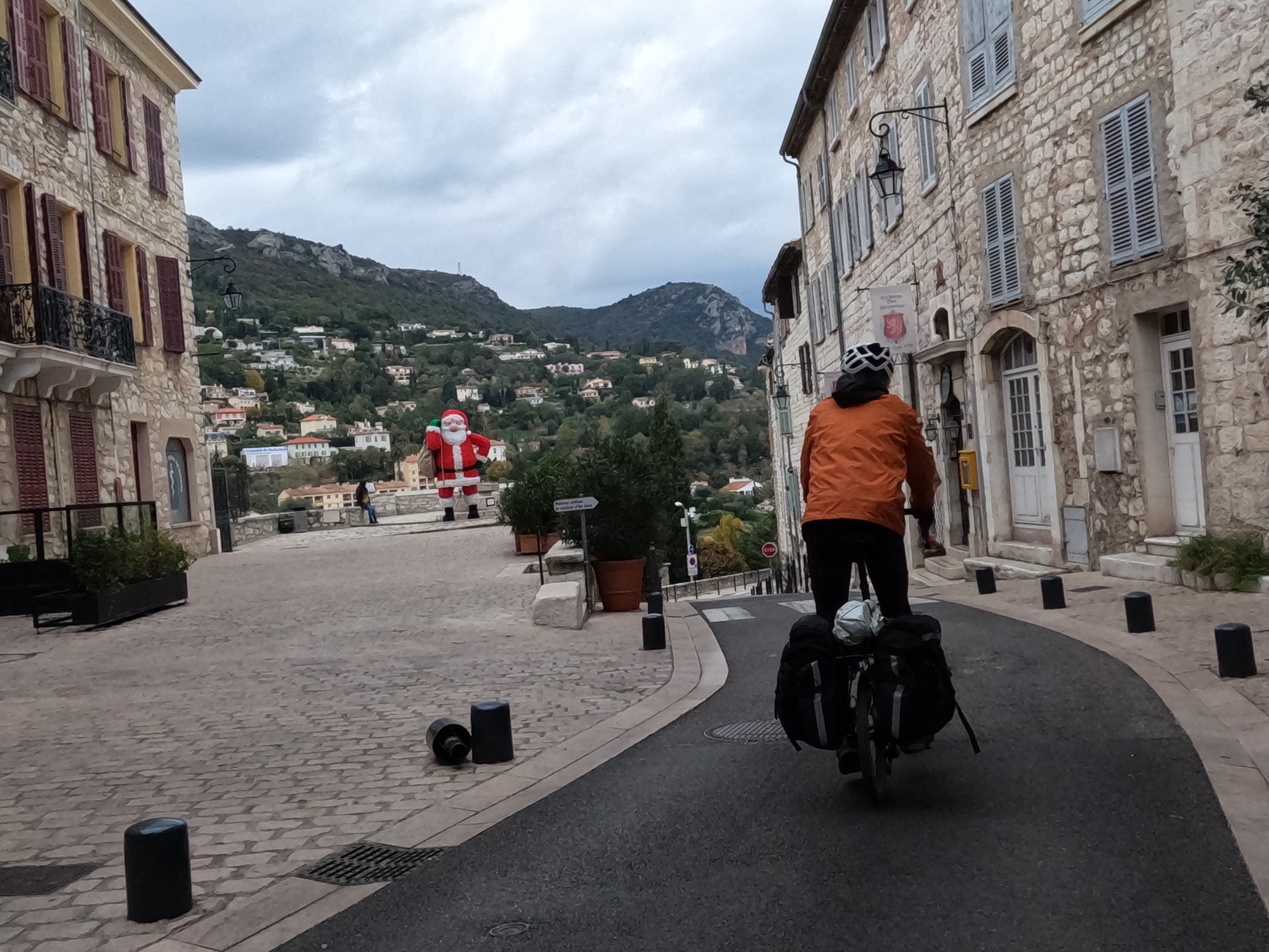 So it’s Monday, and we’re out of here and biking back to Nice for the duration. It’s time even if I hadn’t gotten sick, because the good weather has moved on and we’re looking at a wet one today. Not a good look really If you’re a recovering sickie, but fortunately we don’t need much of a gap. By the most direct route it’s only 14 miles to Nice - seven miles downhill to the sea, and then seven flat miles along it. Not physically taxing at all, if we can just get in dry.