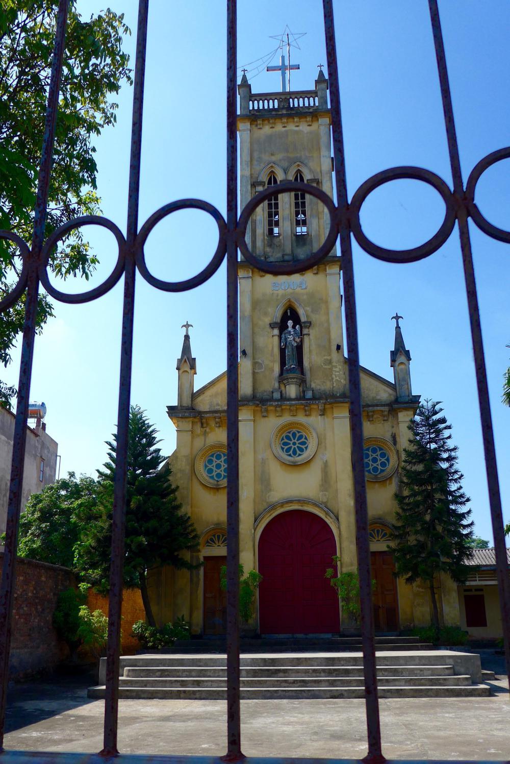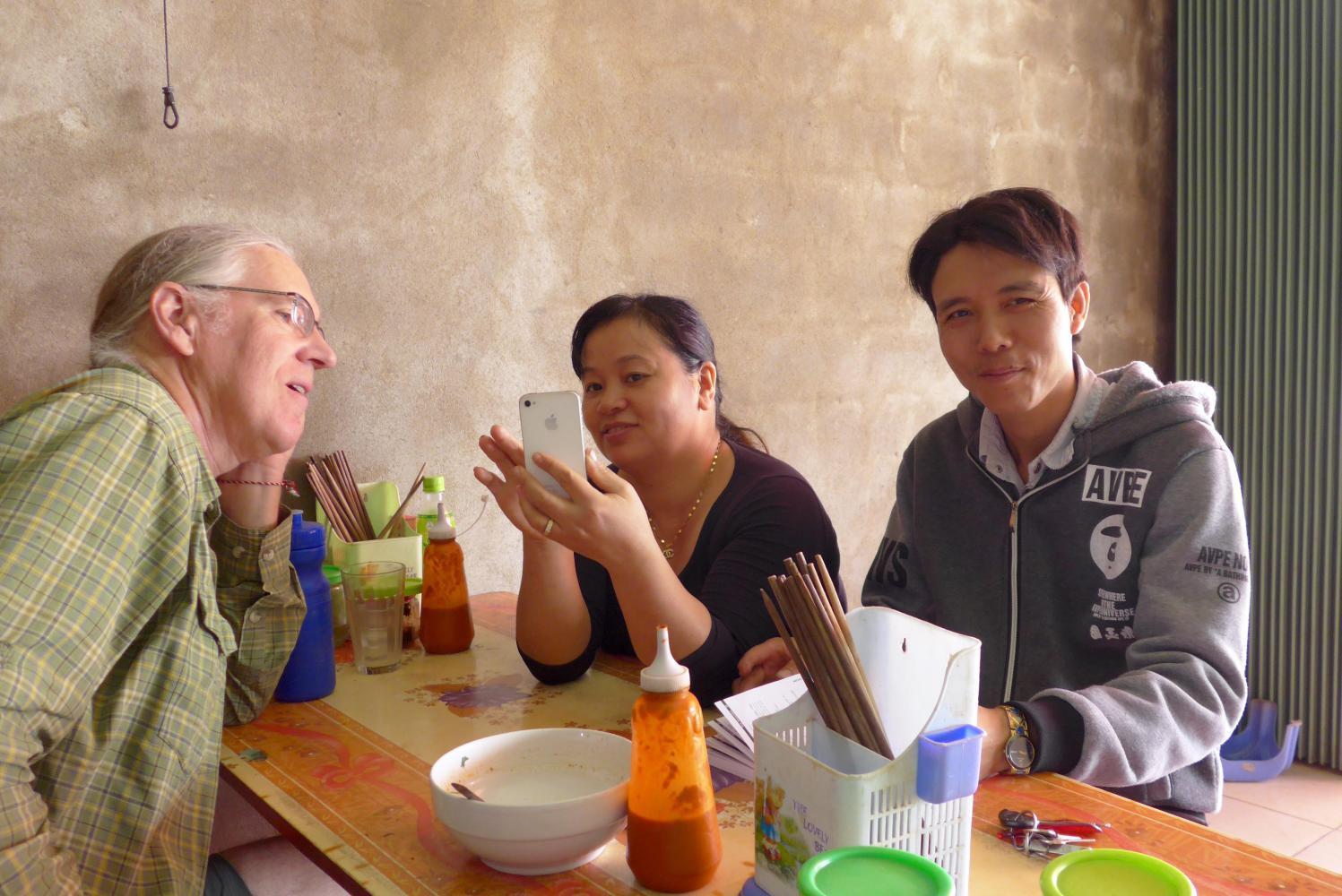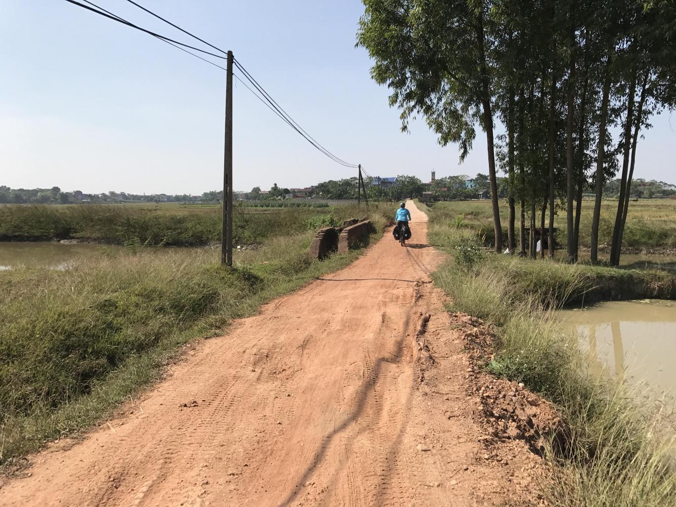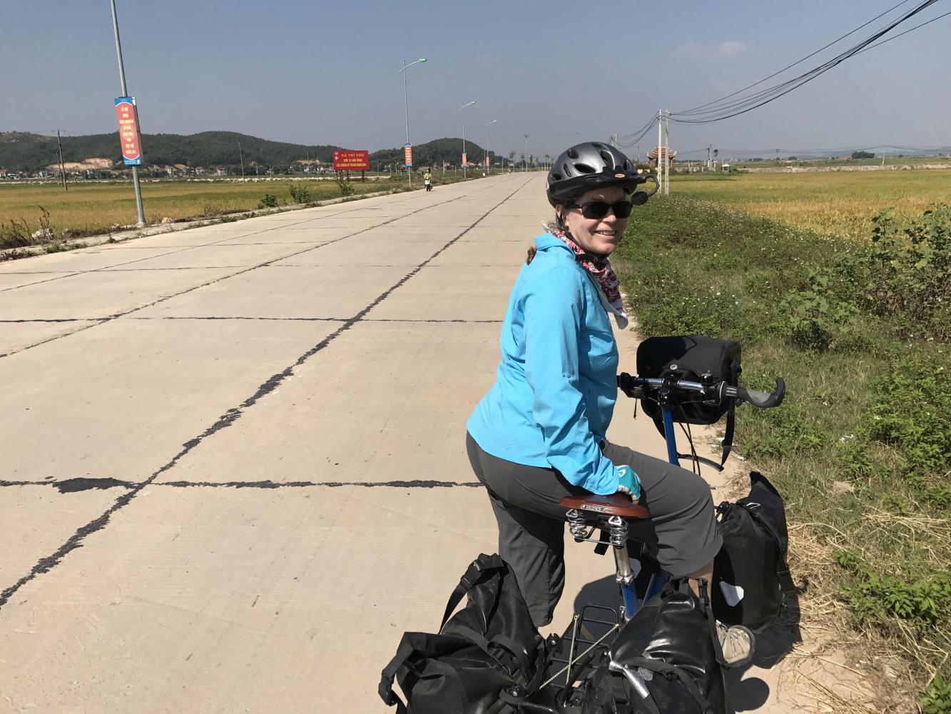 But we found our bridge and puffed our way up to it, crossed it, and stopped to take a swig of water. We were immediately joined by an older gentleman who crossed the road from his house to greet us and congratulate us on our feats of strength (Why, thank you, we impress ourselves as well) and then by two schoolgirls on motorbikes, one of whom had excellent English and smilingly welcomed us to Vietnam. Vietnam has surprised us over and over again with this warmth toward us Americans, their former enemies.